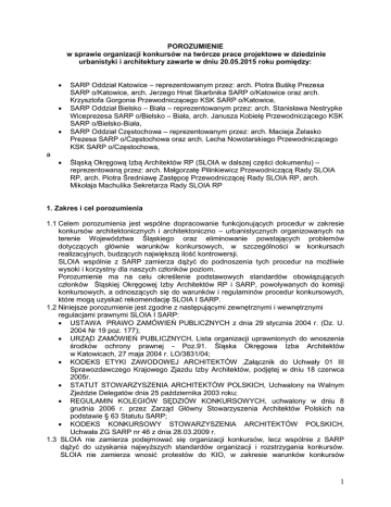 POROZUMIENIE w sprawie organizacji konkursów na twórcze prace projektowe w dziedzinie urbanistyki i architektury zawarte w dniu 20.05.2015 roku pomiędzy: a SARP Oddział Katowice – reprezentowanym przez: arch. Piotra Buśkę Prezesa SARP o/Katowice, arch. Jerzego Hnat Skarbnika SARP o/Katowice oraz arch. Krzysztofa Gorgonia Przewodniczącego KSK SARP o/Katowice, SARP Oddział Bielsko – Biała – reprezentowanym przez: arch. Stanisława Nestrypke Wiceprezesa SARP o/Bielsko – Biała, arch. Janusza Kobielę Przewodniczącego KSK SARP o/Bielsko-Biała, SARP Oddział Częstochowa – reprezentowanym przez: arch. Macieja Żelasko Prezesa SARP o/Częstochowa oraz arch. Lecha Nowotarskiego Przewodniczącego KSK SARP o/Częstochowa, Śląską Okręgową Izbą Architektów RP (SLOIA w dalszej części dokumentu) – reprezentowaną przez: arch. Małgorzatę Pilinkiewicz Przewodniczącą Rady SLOIA RP, arch. Piotra Średniawę Zastępcę Przewodniczącej Rady SLOIA RP, arch. Mikołaja Machulika Sekretarza Rady SLOIA RP 1. Zakres i cel porozumienia 1.1 Celem porozumienia jest wspólne dopracowanie funkcjonujących procedur w zakresie konkursów architektonicznych i architektoniczno – urbanistycznych organizowanych na terenie Województwa Śląskiego oraz eliminowanie powstających problemów dotyczących głównie warunków konkursowych, w szczególności w konkursach realizacyjnych, budzących największą ilość kontrowersji. SLOIA wspólnie z SARP zamierza dążyć do podnoszenia tych procedur na możliwie wysoki i korzystny dla naszych członków poziom. Porozumienie ma na celu określenie podstawowych standardów obowiązujących członków Śląskiej Okręgowej Izby Architektów RP i SARP, powoływanych do komisji konkursowych, a odnoszących się do warunków i regulaminów procedur konkursowych, które mogą uzyskać rekomendację SLOIA I SARP. 1.2 Niniejsze porozumienie jest zgodne z następującymi zewnętrznymi i wewnętrznymi regulacjami prawnymi SLOIA I SARP: USTAWA PRAWO ZAMÓWIEŃ PUBLICZNYCH z dnia 29 stycznia 2004 r. (Dz. U. 2004 Nr 19 poz. 177); URZĄD ZAMÓWIEŃ PUBLICZNYCH, Lista organizacji uprawnionych do wnoszenia środków ochrony prawnej - Poz.91. Śląska Okręgowa Izba Architektów w Katowicach, 27 maja 2004 r. LO/3831/04; KODEKS ETYKI ZAWODOWEJ ARCHITEKTÓW ,Załącznik do Uchwały 01 III Sprawozdawczego Krajowego Zjazdu Izby Architektów, podjętej w dniu 18 czerwca 2005r. STATUT STOWARZYSZENIA ARCHITEKTÓW POLSKICH, Uchwalony na Walnym Zjeździe Delegatów dnia 25 października 2003 roku; REGULAMIN KOLEGIÓW SĘDZIÓW KONKURSOWYCH, uchwalony w dniu 8 grudnia 2006 r. przez Zarząd Główny Stowarzyszenia Architektów Polskich na podstawie § 63 Statutu SARP; KODEKS KONKURSOWY STOWARZYSZENIA ARCHITEKTÓW POLSKICH, Uchwała ZG SARP nr 46 z dnia 28.03.2009 r. 1.3 SLOIA nie zamierza podejmować się organizacji konkursów, lecz wspólnie z SARP dążyć do uzyskania najwyższych standardów organizacji i rozstrzygania konkursów. SLOIA nie zamierza wnosić protestów do KIO, w zakresie warunków konkursów 1 spełniających poniższe wymogi i warunki porozumienia, a w szczególności w stosunku do warunków konkursów, organizowanych przez SARP Oddział Katowice, SARP Oddział Bielsko Biała, SARP Oddział Częstochowa; 1.4 Warunki spełniające określone w porozumieniu zasady uznane będą za rekomendowane zarówno przez SARP Oddział Katowice, SARP Oddział Bielsko Biała, SARP Oddział Częstochowa jak i Śląską Okręgową Izbę Architektów. Informacja o takiej rekomendacji zamieszczona będzie na stronach internetowych SARP Oddział Katowice, SARP Oddział Bielsko Biała, SARP Oddział Częstochowa oraz SLOIA. 1.5 Uczestnicy takich konkursów oraz sędziowie tych konkursów będą mogli korzystać z pomocy prawnej SLOIA, w przypadku zaistnienia sytuacji konfliktowych. Uczestnictwo w innych konkursach odbywać się będzie wyłącznie na ryzyko tak uczestników jak i ewentualnych sędziów w tych konkursach. 1.6 Każdorazowo warunki konkursu przed ich ogłoszeniem zostaną zaopiniowane przez doświadczonych, kompetentnych wyznaczonych członków SARP Oddział Katowice, SARP Oddział Bielsko Biała, SARP Oddział Częstochowa, wyznaczonych członków SLOIA oraz obsługę prawną, co uznane będzie za certyfikację warunków przez obie strony. 2. Sędziowie konkursowi 2.1. 2.2. 2.3. 2.4. 2.5. 2.6. W oparciu o USTAWĘ PRAWO ZAMÓWIEŃ PUBLICZNYCH, Rozdział 3, art.112, pkt.5* , KODEKS ETYKI ZAWODOWEJ ARCHITEKTÓW, 3.6 Reguła**, oraz REGULAMIN KOLEGIÓW SĘDZIÓW KONKURSOWYCH SARP, § 5 pkt.2***, SARP Oddział Katowice, SARP Oddział Bielsko Biała, SARP Oddział Częstochowa jak i Śląska Okręgowa Izba Architektów RP, wypracują wspólne zasady ustalania kryteriów dla swoich członków, którzy będą mogli pełnić kadencyjnie zgodnie z kadencjami SARP, funkcje sędziów konkursowych rekomendowanych przez te organizacje. Wykaz sędziów rekomendowanych przez SARP i SLOIA RP winien być finalnie przekazany wraz ofertą współpracy urzędom miejskim i gminnym, inwestorom publicznym w województwie oraz zamieszczony na stronach internetowych SARP Oddział Katowice, SARP Oddział Bielsko Biała, SARP Oddział Częstochowa oraz SLOIA. Sędziowie konkursowi działają zgodnie z standardami określonymi w KODEKSIE KONKURSOWYM STOWARZYSZENIA ARCHITEKTÓW POLSKICH oraz w KODEKSIE ETYKI ZAWODOWEJ ARCHITEKTÓW, któremu podlegają z tytułu pełnionych czynności. Niezależnie od certyfikacji warunków konkursu, każdorazowo, obowiązkiem sędziów konkursowych jest zaznajomienie się i zaakceptowanie pisemne warunków konkursu, tak w zakresie merytorycznym dotyczącym zadania projektowego, jak również formalno prawnym, dotyczącym kwalifikacji uczestników, kosztów inwestycji, preliminowanego wynagrodzenia za przyszłe prace projektowe oraz warunków przyszłej umowy, a w tym respektowania praw autorskich do utworu. Obowiązkiem każdego rekomendowanego sęd