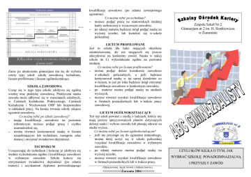 Schemat nauki Kilka słów o tym, co można zrobić po gimnazjum! Zaraz po ukończeniu gimnazjum ma się do wyboru cztery typy szkół: szkołę zawodową, technikum, liceum profilowane i liceum ogólnokształcące. SZKOŁA ZAWODOWA Ucząc się w tego typu szkole zdobywa się ogólną wiedzę oraz praktykę zawodową. Praktyczna nauka zawodu może odbywać się w warsztatach szkolnych, w Centrach Kształcenia Praktycznego, Centrach Kształcenia i Wychowania OHP lub bezpośrednio w zakładach pracy. Na koniec trwania szkoły zdajesz egzamin zawodowy. Co można robić po szkole zawodowej? – mając kwalifikacje zawodowe na poziomie robotniczym możesz podjąć pracę i szybko usamodzielnić się, – można również kontynuować naukę w liceum uzupełniającym lub technikum, następnie zdać maturę i otrzymać świadectwo dojrzałości. TECHNIKUM Uczęszczając do technikum i kończąc je zdobywa się średnie wykształcenie ogólne i kwalifikacje zawodowe w wybranym zawodzie. Szkoła kończy się otrzymaniem świadectwa dojrzałości (po zdaniu matury) i uzyskaniem dyplomu potwierdzającego kwalifikacje zawodowe (po zdaniu zewnętrznego egzaminu). Co można robić po technikum? – możesz podjąć pracę na stanowiskach średniej kadry technicznej w wyuczonym zawodzie, – po zdanej maturze będziesz mógł podjąć naukę na wyższej uczelni, lub kształcić się w szkole policealnej. w Zespole Szkół Nr 2 Gimnazjum nr 2 im. H. Sienkiewicza w Żurominie LICEUM PROFILOWANE Jest to szkoła dla ludzi mających określone zainteresowania, ale nie mogących się jeszcze zdecydować na konkretny zawód. Nauka w takiej szkole da Ci wykształcenie ogólne na poziomie średnim. Co można robić po liceum profilowanym? – można podjąć dalsze kształcenie zawodowe w szkołach policealnych, a jeśli będziesz kontynuował naukę w tej samej dziedzinie co w liceum, to już po roku będziesz mógł otrzymać kwalifikacje zawodowe w konkretnym zawodzie, – po maturze można podjąć naukę na studiach wyższych, – możesz również uzyskać kwalifikacje zawodowe w formach pozaszkolnych lub w trakcie pracy zawodowej. LICEUM OGÓLNOKSZTAŁCĄCE Ten typ szkół powstał z myślą o ludziach, którzy nie mają jeszcze sprecyzowanych planów dotyczących dalszej nauki i wyboru zawodu lub planują zdawać na studia wyższe. Co można robić po liceum ogólnokształcącym? – jeśli nie przystąpi się do egzaminu maturalnego, można dalej uczyć się w szkole policealnej i uzyskać kwalifikacje zawodowe w wybranym zawodzie, – po zdanej maturze można podjąć naukę na wyższej uczelni, – możesz również uzyskać kwalifikacje zawodowe w formach pozaszkolnych lub w trakcie pracy. (Opracowanie: Jacek Gowin i Aldona Gowin.) <<<<<<<<<<Żuromin 2006>>>>>>> CZYLI SŁÓW KILKA O TYM, JAK WYBRAĆ SZKOŁĘ PONADGIMNAZJALNĄ I PRZYSZŁY ZAWÓD Wybieram Szkołę Ponadgimnazjalną CZYLI 10 DOBRYCH RZECZY, KTÓRE RODZICE MOGĄ ZROBIĆ DLA SWOJEGO DZIECKA. Okres nauki w gimnazjum to szczególny okres. Jest to czas wyborów edukacyjnych i zawodowych nie tylko dla gimnazjalistów klas III. Rodzicu, Twoja postawa i zaangażowanie mają wpływ na trafność i jakość dokonywanych wyborów przez Twoje dziecko. 1. Opowiedz o swoich kłopotach i rozterkach związanych z czasem, kiedy Ty byłeś uczniem. 2. Obserwuj dyskretnie, czy Twoje dziecko uczy się, powtarza, przygotowuje się do klasówek i powtórek. Kontaktuj się z nauczycielami, poradź się, jak uzupełnić luki w wiedzy. Pamiętaj! Wynik egzaminu gimnazjalnego istotnie wpływa na przyjęcie do szkoły ponadgimnazjalnej. 3. Pozwól rozwijać swojemu dziecku własne pasje. Wspólnie wybierzcie zajęcia dodatkowe. 4. Pomóż określić dziecku jego niepowtarzalny inwentarz zasobów (temperament, zainteresowania, uzdolnienia, umiejętności). Różne zawody wymagają różnych cech osobowości. (Jeżeli macie z tym kłopot, możecie skorzystać z pomocy Szkolnego Doradcy Zawodowego, który dysponuje stosownymi testami) 5. Nie wymagaj, by dziecko spełniało Twoje wymagania i ambicje. Oceń wspólnie jego realne możliwości. Pracodawcy potrzebują fachowców o różnych specjalnościach z różnym poziomem wykształcenia. 6. Pomóż poznać specyfikę zawodów i branż, opowiedz o znanych Ci stanowiskach pracy, znajdź źródła informacji o zawodach, poszukaj danych o rynku pracy. (Jeżeli macie z tym kłopot, możecie skorzystać z pomocy Szkolnego Doradcy Zawodowego) 7. Zbierz z dzieckiem informację o sieci szkół, typach i kierunkach kształcenia, które pomogą mu zdobyć wymarzony zawód. 8. Poznaj wspólnie z dzieckiem wymogi rekrutacyjne w wybranych typach szkół. Spróbujcie ocenić szanse i możliwości dostania się do konkretnej szkoły. 9. Na wypadek niepowodzenia opracujcie wspólnie wariant awaryjny. Pamiętaj, że Twoje dziecko ma prawo czerpać satysfakcje z wykonywania różnych zajęć! Do wymarzonego zawodu prowadzą różne ścieżki edukacyjne. 10. Zapewnij dziecko, że zawsze może liczyć na Ciebie w każdej sytuacji. Te umiejętności są ważne bez względu na to, jaki zawód Twoje dziecko wybierze. Dzisiejszy rynek pracy stawia różne wymagania potencjalnym pracownikom, już dziś możesz pomóc uzyskać dobrą pracę swemu dziecku. Zacznij myśleć o przyszłości już w trakcie kształcenia się Twojej pociechy. Pamiętaj, że oprócz dyplomu potwierdzającego kwalifikacje zawodowe ważne są również tzw. umiejętności ponadzawodowe. Wystarczy, abyś pomógł uzmysłowić mu, że następujące umiejętności mogą być jego atutem, to zawodowym: • Dobra znajomość języków obcych, i już teraz powinien o to zadbać. • Dobre poznanie praktycznej obsługi komputera, bo pracodawcy oprócz podstawowej wiedzy z tego zakresu wymagają również praktycznej znajomości wielu programów biurowych i sprawnego korzystania z zasobów internetowych. Planując z dzieckiem jego karierę zawodową weźcie pod uwagę równi