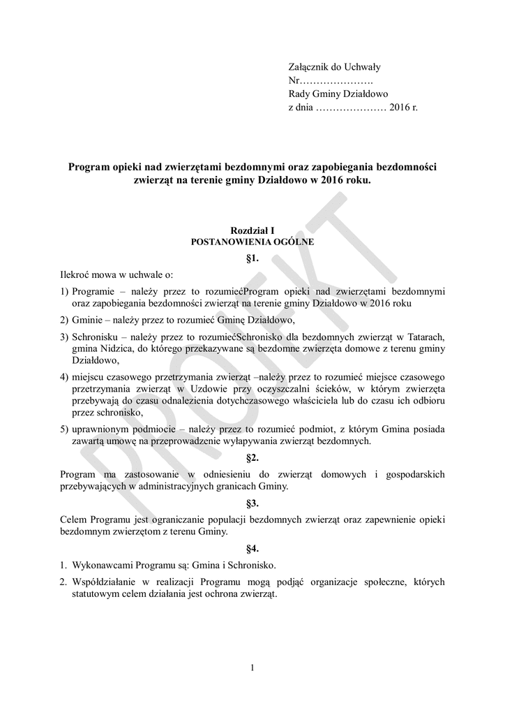 Załącznik do Uchwały Nr…………………. Rady Gminy Działdowo z dnia ………………… 2016 r. Program opieki nad zwierzętami bezdomnymi oraz zapobiegania bezdomności zwierząt na terenie gminy Działdowo w 2016 roku. Rozdział I POSTANOWIENIA OGÓLNE §1. Ilekroć mowa w uchwale o: 1) Programie – należy przez to rozumiećProgram opieki nad zwierzętami bezdomnymi oraz zapobiegania bezdomności zwierząt na terenie gminy Działdowo w 2016 roku 2) Gminie – należy przez to rozumieć Gminę Działdowo, 3) Schronisku – należy przez to rozumiećSchronisko dla bezdomnych zwierząt w Tatarach, gmina Nidzica, do którego przekazywane są bezdomne zwierzęta domowe z terenu gminy Działdowo, 4) miejscu czasowego przetrzymania zwierząt –należy przez to rozumieć miejsce czasowego przetrzymania zwierząt w Uzdowie przy oczyszczalni ścieków, w którym zwierzęta przebywają do czasu odnalezienia dotychczasowego właściciela lub do czasu ich odbioru przez schronisko, 5) uprawnionym podmiocie – należy przez to rozumieć podmiot, z którym Gmina posiada zawartą umowę na przeprowadzenie wyłapywania zwierząt bezdomnych. §2. Program ma zastosowanie w odniesieniu do zwierząt domowych i gospodarskich przebywających w administracyjnych granicach Gminy. §3. Celem Programu jest ograniczanie populacji bezdomnych zwierząt oraz zapewnienie opieki bezdomnym zwierzętom z terenu Gminy. §4. 1. Wykonawcami Programu są: Gmina i Schronisko. 2. Współdziałanie w realizacji Programu mogą podjąć organizacje społeczne, których statutowym celem działania jest ochrona zwierząt. 1 Rozdział II OPIEKA NAD ZWIERZĘTAMI §5. 1. Wyłapywanie bezdomnych zwierząt realizuje uprawniony podmiot. 2. Odłowione zwierzęta domowe przekazywane są do miejsca czasowego przetrzymania zwierząt, po czym odbierane są przez Schronisko. 3. Bezdomne zwierzęta gospodarskie przekazywane są do Gospodarstwa Rolniczo – Hodowlanego, Stanisław Milewski, Jankowice 17, 14-120 Dąbrówno. §6. Schronisko w ramach opieki nad bezdomnymi zwierzętami domowymi zapewnia: 1) utrzymanie zwierząt przebywających w schronisku, 2) stały dozór i opiekę weterynaryjną zwierząt, w tym wykonanie obowiązkowych szczepień, 3) prowadzenie ewidencji przyjętych zwierząt, 4) utylizację zwłok zwierząt padłych lub poddanych eutanazji. §7. 1. Gmina w ramach opieki nad bezdomnymi zwierzętami domowymi przebywających w miejscu czasowego przetrzymania zapewnia: 1) utrzymanie tych zwierząt, 2) stały dozór i opiekę weterynaryjną, 3) prowadzenie ewidencji przyjętych zwierząt, 4) utylizację zwłok zwierząt padłych lub poddanych eutanazji. 2. Opiekę weterynaryjną nad bezdomnymi zwierzętami przebywającym w miejscu czasowego przetrzymania prowadzi lekarz weterynarii na zlecenie Gminy. §8. 1. Sprawowanie opieki nad kotami wolno żyjącymi realizuje Gmina poprzez: 1) ustalanie miejsc, w których przebywają koty wolno żyjące, 2) zakup i wydawanie karmy społecznym opiekunom (karmicielom) kotów wolno żyjących, 3) zapewnienie opieki weterynaryjnej rannym lub chorym kotom, 4) tworzenie rejestru społecznych opiekunów kotów wolno żyjących. 2. Opiekę weterynaryjną nad kotami wolno żyjącymi prowadzi lekarz weterynarii na zlecenie Gminy. 3. Rejestr społecznych opiekunów kotów wolno żyjących prowadzony jest przez Wójta Gminy Działdowo. §9. 1. Całodobową opiekę weterynaryjną nad zwierzętami poszkodowanymi w wyniku wypadków drogowych prowadzi lekarz weterynarii na zlecenie Gminy. 2 2. Usługa weterynaryjna wykonywana w związku ze zdarzeniem drogowym z udziałem zwierzęcia będzie obejmowała w zależności od potrzeby: 1) dokonanie oceny stanu zdrowia zwierzęcia w terenie, 2) udzielenie pierwszej pomocy zwierzęciu w terenie, 3) podanie środków medycznych w celu obezwładnienia zwierzęcia, 4) przeprowadzenie leczenia ambulatoryjnego i rehabilitacji, 5) okresowe przetrzymanie leczonych zwierząt, 6) poddanie zwierzęcia eutanazji, 7) przekazanie zwłok zwierzęcia do utylizacji. Rozdział III OGRANICZANIE POPULACJI BEZDOMNYCH ZWIERZĄT §10. 1. Sterylizację i kastrację bezdomnych zwierząt domowych zapewnia Schronisko przed oddaniem zwierzęcia do adopcji. 2. Sterylizację i kastrację kotów wolno żyjących przeprowadza lekarz weterynarii na zlecenie Gminy. 3. Koty wolno żyjące w celu sterylizacji lub kastracji doprowadzane będą do lecznicy weterynaryjnej przez opiekunów społecznych, członków organizacji społecznych po wcześniejszym uzyskaniu skierowania na zabieg, które wystawione będzie przez Wójta Gminy Działdowo. §11. Usypianie ślepych miotów zwierząt realizują: 1) Schronisko – w przypadku zwierząt bezdomnych, 2) lekarz weterynarii na zlecenie Gminy - w przypadku zwierząt bezdomnych oraz kotów wolno żyjących. §12. Poszukiwanie nowych właścicieli dla bezdomnych zwierząt realizują: 1) Schronisko poprzez prowadzenie działań zmierzających do pozyskania nowych właścicieli i oddania do adopcji bezdomnych zwierząt domowych osobom zainteresowanym i zdolnym zapewnić im należyte warunki bytowania, 2) Gmina poprzez akcję promocyjną adopcji zwierząt domowych przebywających w miejscu ich czasowego przetrzymania. Rozdział IV FINANSOWANIE PROGRAMU §13. 1. Program realizowany będzie z funduszy Gminy zapisanych w budżecie na rok 2016 w kwocie 88 500 zł. 3 2. Powyższe środki wydatkowane będą na: 1) wyłapywanie bezdomnych zwierząt, 2) zapewnienie wyłapanym zwierzętom domowym opieki w miejscu czasowego ich przetrzymania oraz w Schronisku, 3) zapewnienie zwierzętom gospodarskim opieki we wskazanym gospodarstwie rolnym, 4) sprawowanie opieki nad kotami wolno żyjącymi, 5) zapewnienie całodobowej opieki weterynaryjnej nad zwierzętami poszkodowanymi w wyniku wypadków drogowych, 6) sterylizację i kastrację bezdomnych zwierząt oraz kotów wolno żyjących, 7) usypianie ślepych miotów zwierząt bezdomnych oraz kotów wolno żyjących