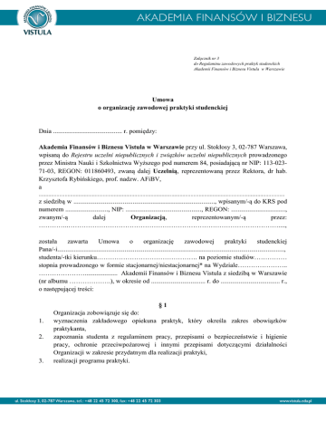 Załącznik nr 3 do Regulaminu zawodowych praktyk studenckich Akademii Finansów i Biznesu Vistula w Warszawie Umowa o organizację zawodowej praktyki studenckiej Dnia .......................................... r. pomiędzy: Akademia Finansów i Biznesu Vistula w Warszawie przy ul. Stokłosy 3, 02-787 Warszawa, wpisaną do Rejestru uczelni niepublicznych i związków uczelni niepublicznych prowadzonego przez Ministra Nauki i Szkolnictwa Wyższego pod numerem 84, posiadającą nr NIP: 113-02371-03, REGON: 011860493, zwaną dalej Uczelnią, reprezentowaną przez Rektora, dr hab. Krzysztofa Rybińskiego, prof. nadzw. AFiBV, a .................................................................................................................................................................................... z siedzibą w ......................................................................................, wpisanym/-ą do KRS pod numerem .........................., NIP: .............................................., REGON: ................................., zwanym/-ą dalej Organizacją, reprezentowanym/-ą przez: …………..……………………………………………………………………………………...., została zawarta Umowa o organizację zawodowej praktyki studenckiej Pana/-i.........................................................................................................................................., studenta/-tki kierunku………………………………………. na poziomie studiów…………… stopnia prowadzonego w formie stacjonarnej/niestacjonarnej* na Wydziale………………….. ………………….................... Akademii Finansów i Biznesu Vistula z siedzibą w Warszawie (nr albumu ……………….), w okresie od ................................. r. do .................................... r., o następującej treści: §1 1. 2. 3. Organizacja zobowiązuje się do: wyznaczenia zakładowego opiekuna praktyk, który określa zakres obowiązków praktykanta, zapoznania studenta z regulaminem pracy, przepisami o bezpieczeństwie i higienie pracy, ochronie przeciwpożarowej i innymi przepisami dotyczącymi działalności Organizacji w zakresie przydatnym dla realizacji praktyki, realizacji programu praktyki. 1. 2. 1. 2. 3. §2 Uczelnia zobowiązuje się do sprawowania opieki merytorycznej i organizacyjnej nad przebiegiem praktyki. Uczelnia nie pokrywa związanych z realizacją praktyki kosztów ponoszonych przez studentów i Organizację. §3 Praktyka nie może odbywać się w warunkach szkodliwych dla zdrowia. Student odbywający praktykę ma obowiązek ubezpieczyć się od następstw nieszczęśliwych wypadków (NNW) we własnym zakresie. Student odbywający praktykę powinien ubezpieczyć się we własnym zakresie od odpowiedzialności cywilnej (OC). §4 Organizacja nie jest zobowiązana do wypłaty wynagrodzenia za czynności wykonywane przez studenta w ramach praktyki i nie ponosi kosztów leczenia praktykanta. §5 Wszelkie spory mogące wynikać z niniejszej Umowy rozstrzygają: ze strony Uczelni – Wydziałowy Opiekun Praktyk Studenckich, a ze strony Organizacji wyznaczona osoba właściwa ds. praktyk zawodowych. §6 Niniejsza Umowa może zostać w każdym czasie rozwiązana za porozumieniem Stron. §7 Wszelkie zmiany niniejszej Umowy wymagają formy pisemnej w postaci aneksu pod rygorem nieważności. §8 Niniejszą Umowę sporządzono w dwóch jednobrzmiących egzemplarzach, po jednym dla każdej ze Stron. .......................................... Uczelnia *niepotrzebne skreślić .................................................... Organizacja