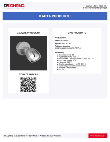 telefon: +48 61 4367 481 e-mail: [email protected] KARTA PRODUKTU ZDJĘCIE PRODUKTU OPIS PRODUKTU Producent RL Nazwa NANTES Symbol R82101107 Rekomendowana cena konsumencka 78.72 PLN Parametry ● średnica (mm): 80 ● wysokość (mm): 125 ● ilość źródeł / rodzaj trzonka: 1 x GU10 LED ● max moc źródła: 3 W ● napięcie: 230 V ● źródło w zestawie: 1 x 3W GU10 ● kolor lampy: nikiel mat/nikiel mat ● materiał: metal/metal ● IP: 20 ZOBACZ WIĘCEJ DELighting ul.Budowlana 10 Psary Małe k. Wrześni, 62-300 Września www.delighting.pl