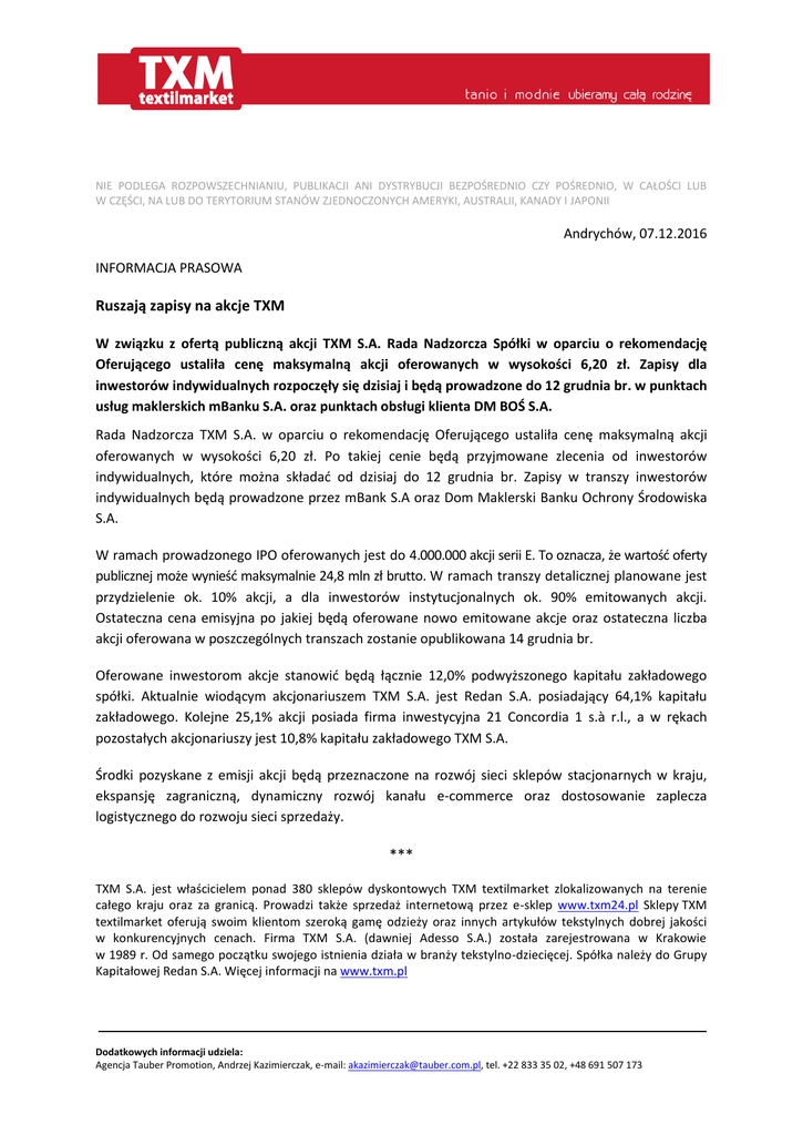 NIE PODLEGA ROZPOWSZECHNIANIU, PUBLIKACJI ANI DYSTRYBUCJI BEZPOŚREDNIO CZY POŚREDNIO, W CAŁOŚCI LUB W CZĘŚCI, NA LUB DO TERYTORIUM STANÓW ZJEDNOCZONYCH AMERYKI, AUSTRALII, KANADY I JAPONII Andrychów, 07.12.2016 INFORMACJA PRASOWA Ruszają zapisy na akcje TXM W związku z ofertą publiczną akcji TXM S.A. Rada Nadzorcza Spółki w oparciu o rekomendację Oferującego ustaliła cenę maksymalną akcji oferowanych w wysokości 6,20 zł. Zapisy dla inwestorów indywidualnych rozpoczęły się dzisiaj i będą prowadzone do 12 grudnia br. w punktach usług maklerskich mBanku S.A. oraz punktach obsługi klienta DM BOŚ S.A. Rada Nadzorcza TXM S.A. w oparciu o rekomendację Oferującego ustaliła cenę maksymalną akcji oferowanych w wysokości 6,20 zł. Po takiej cenie będą przyjmowane zlecenia od inwestorów indywidualnych, które można składać od dzisiaj do 12 grudnia br. Zapisy w transzy inwestorów indywidualnych będą prowadzone przez mBank S.A oraz Dom Maklerski Banku Ochrony Środowiska S.A. W ramach prowadzonego IPO oferowanych jest do 4.000.000 akcji serii E. To oznacza, że wartość oferty publicznej może wynieść maksymalnie 24,8 mln zł brutto. W ramach transzy detalicznej planowane jest przydzielenie ok. 10% akcji, a dla inwestorów instytucjonalnych ok. 90% emitowanych akcji. Ostateczna cena emisyjna po jakiej będą oferowane nowo emitowane akcje oraz ostateczna liczba akcji oferowana w poszczególnych transzach zostanie opublikowana 14 grudnia br. Oferowane inwestorom akcje stanowić będą łącznie 12,0% podwyższonego kapitału zakładowego spółki. Aktualnie wiodącym akcjonariuszem TXM S.A. jest Redan S.A. posiadający 64,1% kapitału zakładowego. Kolejne 25,1% akcji posiada firma inwestycyjna 21 Concordia 1 s.à r.l., a w rękach pozostałych akcjonariuszy jest 10,8% kapitału zakładowego TXM S.A. Środki pozyskane z emisji akcji będą przeznaczone na rozwój sieci sklepów stacjonarnych w kraju, ekspansję zagraniczną, dynamiczny rozwój kanału e-commerce oraz dostosowanie zaplecza logistycznego do rozwoju sieci sprzedaży. *** TXM S.A. jest właścicielem ponad 380 sklepów dyskontowych TXM textilmarket zlokalizowanych na terenie całego kraju oraz za granicą. Prowadzi także sprzedaż internetową przez e-sklep www.txm24.pl Sklepy TXM textilmarket oferują swoim klientom szeroką gamę odzieży oraz innych artykułów tekstylnych dobrej jakości w konkurencyjnych cenach. Firma TXM S.A. (dawniej Adesso S.A.) została zarejestrowana w Krakowie w 1989 r. Od samego początku swojego istnienia działa w branży tekstylno-dziecięcej. Spółka należy do Grupy Kapitałowej Redan S.A. Więcej informacji na www.txm.pl Dodatkowych informacji udziela: Agencja Tauber Promotion, Andrzej Kazimierczak, e-mail: [email protected], tel. +22 833 35 02, +48 691 507 173 *** Zastrzeżenie: Niniejszy materiał ma charakter wyłącznie promocyjny i w żadnym wypadku nie powinien stanowić podstawy do podejmowania decyzji o nabyciu papierów wartościowych spółki TXM S.A. („Spółka”). Prospekt („Prospekt”) przygotowany w związku z ofertą publiczną papierów wartościowych Spółki i ich dopuszczeniem i wprowadzeniem do obrotu na rynku regulowanym prowadzonym przez Giełdę Papierów Wartościowych w Warszawie S.A. („GPW”) jest jedynym prawnie wiążącym dokumentem zawierającym informacje o Spółce oraz ofercie publicznej papierów wartościowych Spółki w Polsce („Oferta”). Prospekt został zatwierdzony przez Komisję Nadzoru Finansowego, będącą organem nadzoru nad rynkiem kapitałowym w Polsce oraz opublikowany na stronie internetowej Spółki www.txm.pl oraz na stronie internetowej mBanku S.A. pełniącego w ramach Oferty funkcję oferującego (www.mdm.pl). Niniejszy materiał nie jest przeznaczony do rozpowszechniania, bezpośrednio albo pośrednio, na terytorium albo do Stanów Zjednoczonych Ameryki albo w innych państwach, w których publiczne rozpowszechnianie informacji zawartych w niniejszym materiale może podlegać ograniczeniom lub być zakazane przez prawo. Niniejszy materiał nie stanowi oferty sprzedaży papierów wartościowych ani zaproszenia do składania zapisów na lub nabywania papierów wartościowych. Niniejszy materiał nie stanowi oferty sprzedaży ani zaproszenia do złożenia oferty zakupu papierów wartościowych na terytorium Stanów Zjednoczonych Ameryki. Papiery wartościowe mogą być oferowane i zbywane na terytorium Stanów Zjednoczonych Ameryki po ich zarejestrowaniu zgodnie z amerykańską ustawą o papierach wartościowych z 1933 r. ze zmianami (U.S. Securities Act of 1933, „Amerykańska Ustawa o Papierach Wartościowych”) albo na podstawie wyjątku od obowiązku rejestracyjnego przewidzianego w Amerykańskiej Ustawie o Papierach Wartościowych. Spółka nie zamierza rejestrować żadnej części Oferty w Stanach Zjednoczonych Ameryki. Niniejszy materiał ani żadna jego kopia nie może być przekazany lub w jakikolwiek sposób przesłany lub udostępniony na terytorium Stanów Zjednoczonych Ameryki, Kanady, Japonii lub Australii. Dodatkowych informacji udziela: Agencja Tauber Promotion, Andrzej Kazimierczak, e-mail: [email protected], tel. +22 833 35 02, +48 691 507 173