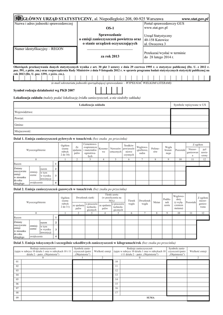 GŁÓWNY URZĄD STATYSTYCZNY, al. Niepodległości 208, 00-925 Warszawa Nazwa i adres jednostki sprawozdawczej www.stat.gov.pl Portal sprawozdawczy GUS www.stat.gov.pl OS-1 Sprawozdanie Urząd Statystyczny o emisji zanieczyszczeń powietrza oraz 40-158 Katowice o stanie urządzeń oczyszczających ul. Owocowa 3 Numer identyfikacyjny – REGON Przekazać/wysłać w terminie do 28 lutego 2014 r. za rok 2013 Obowiązek przekazywania danych statystycznych wynika z art. 30 pkt 3 ustawy z dnia 29 czerwca 1995 r. o statystyce publicznej (Dz. U. z 2012 r. poz. 591, z późn. zm.) oraz rozporządzenia Rady Ministrów z dnia 9 listopada 2012 r. w sprawie programu badań statystycznych statystyki publicznej na rok 2013 (Dz. U. poz. 1391, z późn. zm.). (e-mail sekretariatu jednostki sporządzającej sprawozdanie – WYPEŁNIAĆ WIELKIMI LITERAMI) Symbol rodzaju działalności wg PKD 2007 Lokalizacja zakładu (należy podać lokalizację źródła zanieczyszczeń, a nie siedziby zakładu) Lokalizacja zakładu Symbole wpisywane w US Województwo: Powiat: Gmina: Miejscowość: Dział 1. Emisja zanieczyszczeń pyłowych w tonach/rok (bez znaku po przecinku) Ogółem (suma rubryk 2 do 10) Wyszczególnienie 0 1 Razem Zmiany rzeczywiste emisji w stosunku do roku ubiegłego CementowoŚrodków WęglowoZe -wapiennicze Krzemo- Nawozów powierzch-grafitowe, spalania i materiałów niowo we sztucznych sadza paliw ogniotrwaczynnych łych 2 3 4 5 6 7 Z ogółem Polimerów Węgla brunatnego Pozostałe Niezorganizowan a pył zawieszony 8 9 10 11 12 1 razem w tym w wyniku inwestycji zwiększenie zmniejszenie 2 3 4 Dział 2. Emisja zanieczyszczeń gazowych w tonach/rok (bez znaku po przecinku) Wyszczególnienie Ogółem (suma rubryk 2 do 11) 0 1 Razem Zmiany rzeczywiste emisji w stosunku do roku ubiegłego Tlenki azotu (w przeliczeniu na NO2) z procesów z procesów ze spalania ze spalania technolotechnolopaliw paliw gicznych gicznych 2 3 4 5 Dwutlenek siarki Tlenek węgla Dwutlenek węgla Metan Podtlenek azotu 6 7 8 9 WęglowoZ ogółem dory niezor(z wyłą- Pozostałe ganizoczeniem wana metanu) 10 11 12 1 zmniejszenie razem w tym w wyniku inwestycji zwiększenie 2 3 4 Dział 3. Emisja toksycznych i szczególnie szkodliwych zanieczyszczeń w kilogramach/rok (bez znaku po przecinku) Rodzaje zanieczyszczeń Symbole zanie(ujęte w rubryce 10 działu 1 oraz w rubrykach 10 i 11 czyszczeń (patrz działu 2 – patrz „Objaśnienia”) „Objaśnienia”) 0 1 Wielkość emisji 2 Rodzaje zanieczyszczeń (ujęte w rubryce 10 działu 1 oraz w rubrykach 10 i 11 działu 2 – patrz „Objaśnienia”) 0 01 10 02 11 03 12 04 13 05 14 06 15 07 16 08 17 09 SUMA Symbole zanieczyszczeń (patrz „Objaśnienia”) 1 Wielkość emisji 2 Dział 4. Zanieczyszczenia zatrzymane lub zneutralizowane w urządzeniach oczyszczających w tonach/rok (bez znaku po przecinku) Pyłowe Gazowe według rodzajów zanieczyszczeń ogółem (rubryki 3 do 7) dwutlenek siarki 2 3 1 tlenki azotu (w przeliczeniu na NO2) 4 tlenek węgla węglowodory inne 5 6 7 Dział 5. Liczba urządzeń czynnych w ciągu roku, skuteczność, przepływ gazów odlotowych w dam3 (tys. m3)/godz. oraz średnia dyspozycyjność eksploatacyjna w % (bez znaku po przecinku) Urządzenia o skuteczności Ogółem średniej niskiej Rodzaj urządzeń szt. (rubryki 3+5+7) 1 0 Cyklony 1 Multicyklony 2 Filtry tkaninowe 3 Elektrofiltry 4 Urządzenia mokre 5 Inne 6 Średnia dyspozycyjność w% wysokiej 3 dam /h (rubryki 4+6+8) 2 szt. dam3/h szt. dam3/h szt. dam3/h 3 4 5 6 7 8 9 Dział 6. Emitory na terenie zakładu (bez znaku po przecinku) Wyszczególnienie Ogółem (rubryki 2+3+4) 0 1 Liczba emitorów Emitory o wysokości do 50 m 51– 99 m od 100 m 2 3 4 1 Udział w ogólnej emisji zorganizowanej w % pyłów 2 100 gazów 3 100 Dział 7. Emisja dopuszczalna, pomiary emisji i imisji oraz otoczenie zakładu 1. Czy zakład ma określoną emisję dopuszczalną? (otoczyć kółkiem symbol właściwej odpowiedzi) • nie 0 • tak, częściowo 1 • tak, całkowicie 2 2. Czy zakład ma określoną emisję dopuszczalną dla: (otoczyć kółkiem symbol właściwej odpowiedzi) pyłów SO2 1 NO2 2 5. Liczba stałych punktów pomiarów stężeń 1. razem 2. 1-godzinnych 2. SO2 w tym dla CO 3 1. 24-godzinnych CO2 4 CnHm 5 3. NO2 6 nie tak nie tak nie tak nie tak nie tak nie tak 0 1 0 1 0 1 0 1 0 1 0 1 1. 24-godzinnych 6. Liczba manualnie wykonywanych pomiarów stężeń 2. 1-godzinnych • 3. Czy zakład ma mierzoną emisję? (otoczyć kółkiem symbol właściwej odpowiedzi) 1. • pyłów • • 2. • gazów • 1.pyłów • 4. Czy zakład ma mierzoną • imisję? (otoczyć kółkiem symbol 2.gazów • właściwej odpowiedzi) • nie 0 tak, pomiary ciągłe 1 tak, pomiary okresowe 2 nie 0 tak, pomiary ciągłe 1 tak, pomiary okresowe 2 0 1 nie tak 8. Zabudowa mieszkalna znajduje się w odległości od zakładu (otoczyć kółkiem symbol właściwej odpowiedzi) • do 0,5 km 1 • 0,6 – 2 km 2 • ponad 2 km 3 0 1 nie tak Proszę podać szacunkowy czas (w minutach) przeznaczony na przygotowanie danych dla potrzeb wypełnianego formularza 7. Pomiary automatyczne stężeń w % czasu w roku (bez znaku po przecinku) 1 Proszę podać szacunkowy czas (w minutach) przeznaczony na wypełnienie formularza 2 (e-mail osoby sporządzającej sprawozdanie – WYPEŁNIAĆ WIELKIMI LITERAMI) ..................................................................... (imię, nazwisko i telefon osoby sporządzającej sprawozdanie) ......................................................... (miejscowość, data) .................................................................................. (pieczątka imienna i podpis osoby działającej w imieniu sprawozdawcy) Uwagi (opisać przede wszystkim przyczyny znaczących różnic w danych w stosunku do roku poprzedniego): Objaśnienia do formularza OS-1 Zakres i rodzaje zanieczyszczeń, jakie należy ujmować w sprawozdaniu, określa rozporządzenie Rady Ministrów z dnia 14