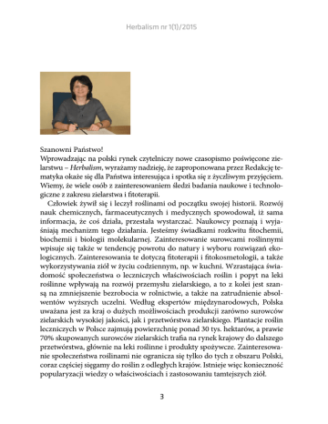 Herbalism nr 1(1)/2015 Szanowni Państwo! Wprowadzając na polski rynek czytelniczy nowe czasopismo poświęcone zielarstwu – Herbalism, wyrażamy nadzieję, że zaproponowana przez Redakcję tematyka okaże się dla Państwa interesująca i spotka się z życzliwym przyjęciem. Wiemy, że wiele osób z zainteresowaniem śledzi badania naukowe i technologiczne z zakresu zielarstwa i fitoterapii. Człowiek żywił się i leczył roślinami od początku swojej historii. Rozwój nauk chemicznych, farmaceutycznych i medycznych spowodował, iż sama informacja, że coś działa, przestała wystarczać. Naukowcy poznają i wyjaśniają mechanizm tego działania. Jesteśmy świadkami rozkwitu fitochemii, biochemii i biologii molekularnej. Zainteresowanie surowcami roślinnymi wpisuje się także w tendencję powrotu do natury i wyboru rozwiązań ekologicznych. Zainteresowania te dotyczą fitoterapii i fitokosmetologii, a także wykorzystywania ziół w życiu codziennym, np. w kuchni. Wzrastająca świadomość społeczeństwa o leczniczych właściwościach roślin i popyt na leki roślinne wpływają na rozwój przemysłu zielarskiego, a to z kolei jest szansą na zmniejszenie bezrobocia w rolnictwie, a także na zatrudnienie absolwentów wyższych uczelni. Według ekspertów międzynarodowych, Polska uważana jest za kraj o dużych możliwościach produkcji zarówno surowców zielarskich wysokiej jakości, jak i przetwórstwa zielarskiego. Plantacje roślin leczniczych w Polsce zajmują powierzchnię ponad 30 tys. hektarów, a prawie 70% skupowanych surowców zielarskich trafia na rynek krajowy do dalszego przetwórstwa, głównie na leki roślinne i produkty spożywcze. Zainteresowanie społeczeństwa roślinami nie ogranicza się tylko do tych z obszaru Polski, coraz częściej sięgamy do roślin z odległych krajów. Istnieje więc konieczność popularyzacji wiedzy o właściwościach i zastosowaniu tamtejszych ziół. 3 Herbalism nr 1(1)/2015 Czasopismo Herbalism może spełniać ważną rolę w transferze wiedzy między ośrodkami akademickimi i przemysłem oraz w jej upowszechnianiu. Będziemy zamieszczać artykuły dotyczące badań nad właściwościami surowców roślinnych z różnych kontynentów, ich składu, mechanizmu działania, a także informacje o technologii upraw zielarskich. Warto pokazać praktyczne zastosowanie ziół w medycynie naturalnej, kosmetologii czy sztuce kulinarnej. Chcemy także zamieszczać artykuły o historii ziołolecznictwa i sylwetkach znanych postaci, które ją tworzyły, w tym numerze informacje o O. Andrzeju Klimuszce. Niniejszemu wydawnictwu o charakterze popularno-naukowy, patronuje Polskie Towarzystwo Zielarzy i Fitoterapeutów, które będzie dbało o wysoki poziom merytoryczny i aktualność publikowanych doniesień. Wydawcą czasopisma jest Państwowa Wyższa Szkoła Zawodowa im. S. Pigonia w Krośnie oraz Polskie Towarzystwo Zielarzy i Fititerapeutów. Mam nadzieję że Herbalism umożliwi Państwu zdobywanie potrzebnych informacji, które są przygotowane przez fachowców z myślą o szerokim gronie czytelników. Redaktor naczelna dr inż. Barbara Krochmal-Marczak 4
