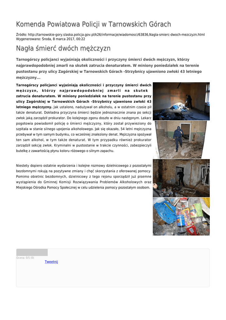 Komenda Powiatowa Policji w Tarnowskich Górach Źródło: http://tarnowskie-gory.slaska.policja.gov.pl/k26/informacje/wiadomosci/63836,Nagla-smierc-dwoch-mezczyzn.html Wygenerowano: Środa, 8 marca 2017, 00:22 Nagła śmierć dwóch mężczyzn Tarnogórscy policjanci wyjaśniają okoliczności i przyczyny śmierci dwóch mężczyzn, którzy najprawdopodobniej zmarli na skutek zatrucia denaturatem. W miniony poniedziałek na terenie pustostanu przy ulicy Zagórskiej w Tarnowskich Górach -Strzybnicy ujawniono zwłoki 43 letniego mężczyzny... Tarnogórscy policjanci wyjaśniają okoliczności i przyczyny śmierci dwóch mężczyzn, którzy najprawdopodobniej zmarli na skutek zatrucia denaturatem. W miniony poniedziałek na terenie pustostanu przy ulicy Zagórskiej w Tarnowskich Górach -Strzybnicy ujawniono zwłoki 43 letniego mężczyzny. Jak ustalono, nadużywał on alkoholu, a w ostatnim czasie pił także denaturat. Dokładna przyczyna śmierci będzie jednoznacznie znana po sekcji zwłok jaką zarządził prokurator. Do kolejnego zgonu doszło w dniu następnym. Lekarz pogotowia powiadomił policję o śmierci mężczyzny, który został przywieziony do szpitala w stanie silnego upojenia alkoholowego. Jak się okazało, 54 letni mężczyzna przebywał w tym samym budynku, co wcześniej znaleziony denat. Mężczyzna spożywał ten sam alkohol, w tym także denaturat. W tym przypadku również prokurator zarządził sekcję zwłok. Kryminalni w pustostanie w trakcie czynności, zabezpieczyli butelkę z zawartością płynu koloru różowego o silnym zapachu. Niestety dopiero ostatnie wydarzenia i kolejne rozmowy dzielnicowego z pozostałymi bezdomnymi rokują na pozytywne zmiany i chęć skorzystania z oferowanej pomocy. Pomimo obietnic bezdomnych, dzielnicowy z tego rejonu sporządził już pisemne wystąpienia do Gminnej Komisji Rozwiązywania Problemów Alkoholowych oraz Miejskiego Ośrodka Pomocy Społecznej w celu udzielenia pomocy pozostałym osobom. Ocena: 0/5 (0) Tweetnij