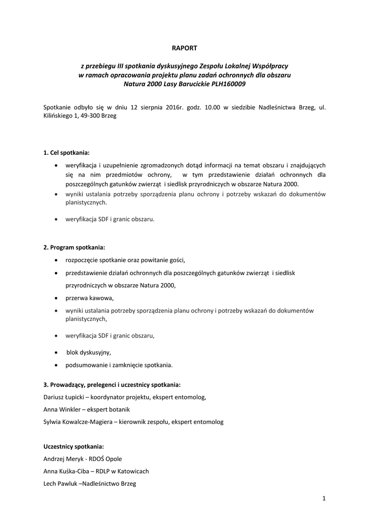 RAPORT z przebiegu III spotkania dyskusyjnego Zespołu Lokalnej Współpracy w ramach opracowania projektu planu zadań ochronnych dla obszaru Natura 2000 Lasy Barucickie PLH160009 Spotkanie odbyło się w dniu 12 sierpnia 2016r. godz. 10.00 w siedzibie Nadleśnictwa Brzeg, ul. Kilińskiego 1, 49-300 Brzeg 1. Cel spotkania: weryfikacja i uzupełnienie zgromadzonych dotąd informacji na temat obszaru i znajdujących się na nim przedmiotów ochrony, w tym przedstawienie działań ochronnych dla poszczególnych gatunków zwierząt i siedlisk przyrodniczych w obszarze Natura 2000. wyniki ustalania potrzeby sporządzenia planu ochrony i potrzeby wskazań do dokumentów planistycznych. weryfikacja SDF i granic obszaru. 2. Program spotkania: rozpoczęcie spotkanie oraz powitanie gości, przedstawienie działań ochronnych dla poszczególnych gatunków zwierząt i siedlisk przyrodniczych w obszarze Natura 2000, przerwa kawowa, wyniki ustalania potrzeby sporządzenia planu ochrony i potrzeby wskazań do dokumentów planistycznych, weryfikacja SDF i granic obszaru, blok dyskusyjny, podsumowanie i zamknięcie spotkania. 3. Prowadzący, prelegenci i uczestnicy spotkania: Dariusz Łupicki – koordynator projektu, ekspert entomolog, Anna Winkler – ekspert botanik Sylwia Kowalcze-Magiera – kierownik zespołu, ekspert entomolog Uczestnicy spotkania: Andrzej Meryk - RDOŚ Opole Anna Kuśka-Ciba – RDLP w Katowicach Lech Pawluk –Nadleśnictwo Brzeg 1 Piotr Oleszek – Nadleśnictwo Namysłów Magdalena Wincer – Nadleśnictwo Brzeg Krzysztof Magiera – Komag Consulting 4. Przebieg spotkania: Spotkanie rozpoczął Pan dr Dariusz Łupicki (Komag Consulting), który przywitał uczestników spotkania i przedstawił zgromadzonym cel spotkania oraz otworzył blok prezentacji przedstawiając wyniki prac nad owadami będącymi przedmiotami ochrony obszaru Natura 2000 Lasy Barucickie wraz z działaniami ochronnymi. Następnie prezentację z zakresu siedlisk przyrodniczych przedstawiła Pani mgr Anna Winkler, podczas której omówiła proponowane działania ochronne dla poszczególnych przedmiotów ochrony stwierdzonych w obszarze Natura 2000 Lasy Barucickie. Przerwa kawowa Po przerwie kawowej głos zabrała Pani Sylwia Kowalcze-Magiera (Komag Consulting) przedstawiając zgromadzone dotąd informacje na temat istniejących dokumentów planistycznych, których zapisy mogą mieć negatywny wpływ na przedmioty ochrony w obszarze. Ostatnią prezentację przedstawił Pan Dariusz Łupicki (Komag Consulting) przestawiając zmiany jakie zostaną dokonane w nowej wersji SDF-u oraz korektę granic obszaru. Blok dyskusyjny Pani Anna Kuśka – Ciba (RDLP Katowice) zapytała, która instytucja powinna ponieść koszt budowy mielerza zaproponowanego jako działanie ochronne, związane z ochroną czynną jelonka rogacza. Pan Dariusz Łupicki (Komag Consulting) stwierdził, iż nie ma alternatywnego sposobu ochrony dla tego gatunku w Rezerwacie Lubsza i koszty wykonania mielerza najprawdopodobniej będą ponosić Lasy Państwowe, jednak Pan Andrzej Meryk (RDOŚ Opole) zasugerował, że koszty utworzenia mielerza mogą być przejęte przez RDOŚ Opole. Pani Anna Kuśka –Ciba zapytała, jakie są perspektywy sukcesu ochrony dla jelonka rogacza w obszarze? Pan Dariusz Łupicki odpowiedział, że w rejonie rezerwatu Lubsza jest wystarczająco dużo dębów, które mogłyby być zasiedlone przez jelonki. Pan Łupicki zasugerował, że dobrym pomysłem na utworzenie miejsc zasiedlania jelonka może być pozostawienie w czasie wycinki dębów odrobinę wyższe pniaki. Pani Anna Kuśka – Ciba stwierdziła, że takie zalecenie powinno znaleźć się w projekcie PZO, ponieważ lasy mają swoje zalecenia wysokości pniaków. Wykonawca musi określić konkretną wysokość pozostawionych pniaków. Pan Piotr Oleszek powiedział, że zalecenia lasów co do wysokości pniaka to ¼ średnicy pniaka. Pan Andrzej Meryk zasugerował, że wykonawcy powinni określić ile 2 takich pniaków należy pozostawić dla jelonka rogacza. Pan Dariusz Łupicki stwierdził, iż wystarczającą ilością będzie pozostawienie kilka sztuk. Zauważył także, że siedliska jelonka rogacza pokrywają się w dużym stopniu z siedliskami kozioroga dębosza, więc działania ochronne dla jelonka w pewnym stopniu związane są z działaniami ochronnymi kozioroga dębosza. Pan Lech Pawluk (Nadleśnictwo Brzeg) zauważył, że drzewostan łęgowy w obszarze w wybranych miejscach uległ grądowieniu i należałoby zmienić kwalifikacje niektórych płatów siedliska. Pani Anna Winkler (Komag Consulting) wyjaśniła, że została wykonana weryfikacja niektórych płatów siedlisk. Pan Krzysztof Magiera (Komag Consulting) wyjaśnił, że razem z pracownikiem Nadleśnictwa Namysłów zostały zweryfikowane płaty siedlisk, znajdujące się w obrębie nadleśnictwa. Została kwestia weryfikacji siedlisk z Nadleśnictwem Brzeg, która zostanie dokonana po dzisiejszym spotkaniu. Pan Andrzej Meryk (RDOŚ Opole) zauważył , że w siedlisku 6510 - Ekstensywnie użytkowane niżowe łąki świeże, w proponowanych działaniach fakultatywnych przy zaleceniu „Użytkowanie zgodne z wymogami odpowiedniego pakietu rolno-środowiskowo-klimatycznego” wykonawca powinien wpisać dokładną nazwę pakietu rolnośrodowiskowego. Pakiety rolnośrodowiskowe obowiązują przez określony przedział czasu, więc w celu uniknięcia sytuacji przedawnienia pakietu rolnośrodowiskowego i nie wdrożenia go ponownie, wykonawca powinien zaznaczyć, iż w następnym obowiązującym pakiecie siedlisko użytkować w sposób zbliżony do zaproponowanego w tym projekcie pakietu. 5. Podsumowanie spotkania: Podczas dyskusji zebrano od uczestników spotkania cenne informacje na temat obszaru Natura 2000 Lasy Barucickie oraz objętych nim przedmiotów ochrony. Tym samym stwierdzić należy, że spotkanie przebiegło zgodnie z założeniami, a cele wynikające z realizacji tego etapu projektu z