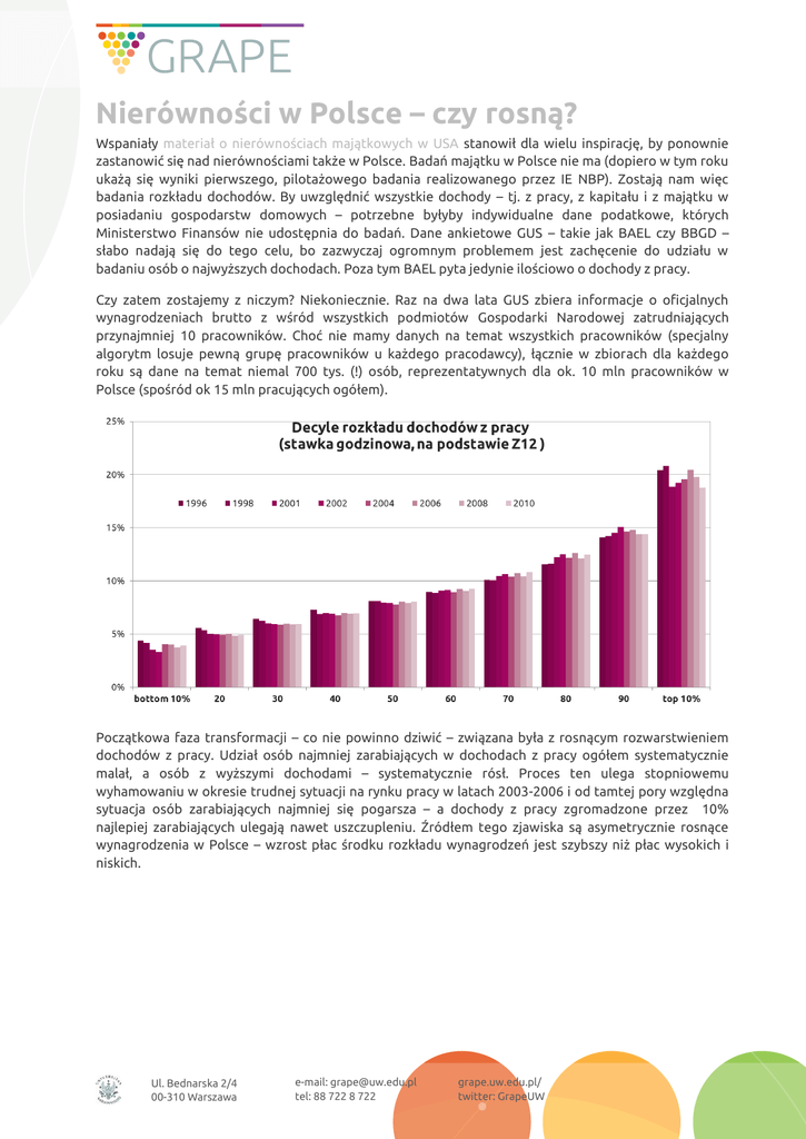 Nierówności w Polsce – czy rosną? Wspaniały materiał o nierównościach majątkowych w USA stanowił dla wielu inspirację, by ponownie zastanowić się nad nierównościami także w Polsce. Badań majątku w Polsce nie ma (dopiero w tym roku ukażą się wyniki pierwszego, pilotażowego badania realizowanego przez IE NBP). Zostają nam więc badania rozkładu dochodów. By uwzględnić wszystkie dochody – tj. z pracy, z kapitału i z majątku w posiadaniu gospodarstw domowych – potrzebne byłyby indywidualne dane podatkowe, których Ministerstwo Finansów nie udostępnia do badań. Dane ankietowe GUS – takie jak BAEL czy BBGD – słabo nadają się do tego celu, bo zazwyczaj ogromnym problemem jest zachęcenie do udziału w badaniu osób o najwyższych dochodach. Poza tym BAEL pyta jedynie ilościowo o dochody z pracy. Czy zatem zostajemy z niczym? Niekoniecznie. Raz na dwa lata GUS zbiera informacje o oficjalnych wynagrodzeniach brutto z wśród wszystkich podmiotów Gospodarki Narodowej zatrudniających przynajmniej 10 pracowników. Choć nie mamy danych na temat wszystkich pracowników (specjalny algorytm losuje pewną grupę pracowników u każdego pracodawcy), łącznie w zbiorach dla każdego roku są dane na temat niemal 700 tys. (!) osób, reprezentatywnych dla ok. 10 mln pracowników w Polsce (spośród ok 15 mln pracujących ogółem). Początkowa faza transformacji – co nie powinno dziwić – związana była z rosnącym rozwarstwieniem dochodów z pracy. Udział osób najmniej zarabiających w dochodach z pracy ogółem systematycznie malał, a osób z wyższymi dochodami – systematycznie rósł. Proces ten ulega stopniowemu wyhamowaniu w okresie trudnej sytuacji na rynku pracy w latach 2003-2006 i od tamtej pory względna sytuacja osób zarabiających najmniej się pogarsza – a dochody z pracy zgromadzone przez 10% najlepiej zarabiających ulegają nawet uszczupleniu. Źródłem tego zjawiska są asymetrycznie rosnące wynagrodzenia w Polsce – wzrost płac środku rozkładu wynagrodzeń jest szybszy niż płac wysokich i niskich. Ul. Bednarska 2/4 00-310 Warszawa e-mail: [email protected] tel: 88 722 8 722 grape.uw.edu.pl/ twitter: GrapeUW bottom 10% top 10% 5% 30% 4% 25% 20% 3% 15% 2% 10% 1% 0% 5% 0% 1996 1998 2001 2002 2004 2006 2008 2010 1996 1998 2001 2002 2004 2006 2008 2010 Zgodnie z danymi, 10% najlepiej zarabiających Polaków gromadziło w 1996 roku ok 20% dochodów z pracy, a 10% najgorzej zarabiających – ok 4%. Różnica wynosiła więc ok. 19% w 1996 roku – do 2008 wzrosła do 21%. Jednak po pierwsze – dane z 1996 i 1998 r. nie uwzględniają liczby przepracowanych godzin, a wiemy z BAEL, że osoby mniej zarabiające pracują średnio nieco mniej niż pozostali pracownicy. Poza tym, kolosalna jest różnica w poziomie wykształcenia (wśród najwięcej zarabiających nie ma niemal osób bez dyplomu uczelni wyższej, wśród najmniej zarabiających spory udział stanowią osoby z wykształceniem podstawowym). top 1% I jeszcze ciekawostka - najwięcej zarabiający Najgorzej zarabiająca grupa w Polsce otrzymywała w analizowanym okresie przeciętnie 3-6% dochodu z pracy całej analizowanej populacji (tj. pracujących w podmiotach Gospodarki Narodowej zatrudniających przynajmniej 10 pracowników w przeliczeniu na pełne etaty). 6% 4% 2% 0% 1996 1998 2001 2002 2004 2006 2008 2010 Komentarz GRAPE Czy rozwarstwienie dochodów z pracy w Polsce występuje? Tak. Czy jest duże? Na tle innych krajów rozwiniętych – nieszczególnie. Czy rośnie? Nie ma podstaw do takiego stwierdzenia, choć nie ma żadnych wiarygodnych danych na temat rozwarstwienia dochodów z pracy wśród osób pracujących w mikroprzedsiębiorstwach, ani osób takie właśnie firmy prowadzących. Tego typu analizę dałoby się przeprowadzić tylko na danych ze sprawozdań podatkowych, a tych MF nie udostępnia. Dodajmy przy tym, że jest jednym z nielicznych krajów w UE, w którym wciąż naukowcy nie mogą analizować zanonimizowanych danych o dochodach podatników. Co to mówi o nierównościach w Polsce? Analiza objęła tylko dochody z pracy. By mówić o nierównościach (w tym także o biedzie) musielibyśmy wiedzieć więcej o strukturze gospodarstwa domowego (liczba członków, zarobki wszystkich członków) – czego na podstawie danych ze sprawozdawczości przedsiębiorstw nie da się zrobić. Wiemy więc, że nie rośnie zróżnicowanie płac osób, ale niewiele wiemy o nierównościach dochodów gospodarstw domowych i nierównościach w konsumpcji. Notka metodologiczna: na podstawie danych z formularzy Z12 wyliczono stawkę godzinową. Następnie ułożono wszystkich pracowników wg tej zmiennej i podzielono na percentyle rozkładu. Udział danego percentyla w funduszu płac szacowano na podstawie wynagrodzenia ogółem. Dane za 1996 r. i za 1998 r. nie zawierają informacji o liczbie przepracowanych godzin, więc analiza odnosi się w całości do wynagrodzenia ogółem. Ul. Bednarska 2/4 00-310 Warszawa e-mail: [email protected] tel: 88 722 8 722 grape.uw.edu.pl/ twitter: GrapeUW