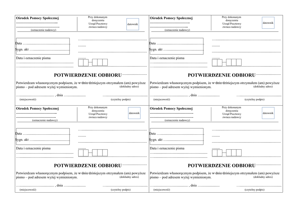 Przy dokonanym doręczeniu Urząd Pocztowy zwraca nadawcy Ośrodek Pomocy Społecznej ……………………………... ………………………………. (oznaczenie nadawcy) datownik (oznaczenie nadawcy) ….......................................................................... Data ….................................................. Sygn. akt ….......................................... Data i oznaczenie pisma …............................................................. …............................................................. .............................................................................. Sygn. akt ….......................................... ......... Data i oznaczenie pisma …............................................................. .............................................................................. …............................................................. ......... POTWIERDZENIE ODBIORU ............................ Potwierdzam własnoręcznym podpisem, że ................... w dniu dzisiejszym otrzymałem (am) powyższe (dokładny adres) pismo – pod adresem wyżej wymienionym. (czytelny podpis) Przy dokonanym doręczeniu Urząd Pocztowy zwraca nadawcy Ośrodek Pomocy Społecznej …………………………….. ……………………………. (oznaczenie nadawcy) Sygn. akt ….......................................... Data i oznaczenie pisma …............................................................. …............................................................. datownik .............................................................................. Potwierdzam własnoręcznym podpisem, że ................... w dniu dzisiejszym otrzymałem (am) powyższe (dokładny adres) pismo – pod adresem wyżej wymienionym. (czytelny podpis) Przy dokonanym doręczeniu Urząd Pocztowy zwraca nadawcy Ośrodek Pomocy Społecznej ………………………………. ………………………………. Sygn. akt ….......................................... ......... Data i oznaczenie pisma …............................................................. .............................................................................. …............................................................. Potwierdzam własnoręcznym podpisem, że ................... w dniu dzisiejszym otrzymałem (am) powyższe (dokładny adres) pismo – pod adresem wyżej wymienionym. ......... .............................................................................. ......... .............................................................................. ......... POTWIERDZENIE ODBIORU ............................ Potwierdzam własnoręcznym podpisem, że ................... w dniu dzisiejszym otrzymałem (am) powyższe (dokładny adres) pismo – pod adresem wyżej wymienionym. …............................................... …....................................... , dnia …..................... (czytelny podpis) datownik ….......................................................................... Data ….................................................. .............................................................................. …............................................... (miejscowość) ......... POTWIERDZENIE ODBIORU ............................ (miejscowość) ......... (oznaczenie nadawcy) ......... …....................................... , dnia …..................... .............................................................................. ......... POTWIERDZENIE ODBIORU ............................ ….......................................................................... Data ….................................................. ......... …............................................... …....................................... , dnia …..................... (miejscowość) datownik ….......................................................................... Data ….................................................. ......... …....................................... , dnia …..................... Przy dokonanym doręczeniu Urząd Pocztowy zwraca nadawcy Ośrodek Pomocy Społecznej ……………………………. …………………………... (miejscowość) …............................................... (czytelny podpis) Pismo doręczyłem *) a) adresatowi, b) osobie upoważnionej do odbioru korespondencji w miejscu stałego zatrudnienia adresata …................................................................................................................................................................. (nazwisko i mię) c) z powodu nieobecności adresata – dorosłemu domownikowi – administracji domu gospodarzowi domu lub sołtysowi, jeżeli podejmą się oddać pismo adresatowi. Pisma nie doręczyłem w sposób określony w pkt. 1, pismo pozostawiłem w: *) a) Urzędzie Gminy ….................................................................................................................................. b) Terenowej Komendzie Policji …............................................................................................................ c) Urzędzie Pocztowym ….......................................................................................................................... o czym umieściłem zawiadomienie na drzwiach mieszkania adresata ze wskazaniem, gdzie i kiedy pismo pozostawiono. Pisma nie doręczyłem, gdyż: *) a) adresat odmówił przyjęcia b) nie mógł pokwitować odbioru pisma Pisma nie doręczyłem, ponieważ **) …..................................................................................................... …................................................................................................................................................................. …............................................. ….. …