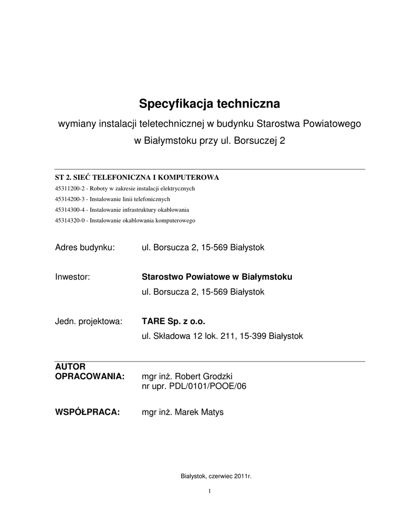 Specyfikacja techniczna wymiany instalacji teletechnicznej w budynku Starostwa Powiatowego w Białymstoku przy ul. Borsuczej 2 ST 2. SIEĆ TELEFONICZNA I KOMPUTEROWA 45311200-2 - Roboty w zakresie instalacji elektrycznych 45314200-3 - Instalowanie linii telefonicznych 45314300-4 - Instalowanie infrastruktury okablowania 45314320-0 - Instalowanie okablowania komputerowego Adres budynku: ul. Borsucza 2, 15-569 Białystok Inwestor: Starostwo Powiatowe w Białymstoku ul. Borsucza 2, 15-569 Białystok Jedn. projektowa: TARE Sp. z o.o. ul. Składowa 12 lok. 211, 15-399 Białystok AUTOR OPRACOWANIA: WSPÓŁPRACA: mgr inż. Robert Grodzki nr upr. PDL/0101/POOE/06 mgr inż. Marek Matys Białystok, czerwiec 2011r. 1 ST 2. SIEĆ TELEFONICZNA I KOMPUTEROWA 1.1 Przedmiot Specyfikacji Technicznej (ST) Przedmiotem Specyfikacji Technicznej są wymagania dotyczące wykonania robót związanych z budową teleinformatycznej sieci strukturalnej w budynku Starostwa Powiatowego w Białymstoku przy ulicy Borsuczej 2. Instalacja teleinformatycznej sieci strukturalnej musi być wykonana zgodnie z projektem technicznym i zgodnie ze specyfikacją materiałową. Firma wykonująca musi wykazać się odpowiednim doświadczeniem. 1.2 Zakres stosowania ST Specyfikacja techniczna jest stosowana jako dokument przetargowy i kontraktowy przy zlecaniu i realizacji robót wymienionych w pkt. 1.1. 1.3 Zakres robót objętych ST Roboty, których Specyfikacja obejmują wszystkie czynności umożliwiające i mające na celu budowę teleinformatycznej sieci strukturalnej w budynku Starostwa Powiatowego w Białymstoku przy ulicy Borsuczej 2. 1.4 Wymagania ogólne Wykonawca powinien wykazać się zatrudnieniem personelu posiadającego certyfikat instalatora w oferowanej technologii. Pracownicy powinni posiadać certyfikaty zawodowe z zakresu instalowania sieci teleinformatycznych. Para - Skrętka lub jednostronne połączenia (dwa przewodniki o przekroju kołowym) w gwieździstej czwórce. Przewód krosujący - Elastyczna jednostka kabla lub element ze złączem przeznaczony do zestawienia połączeń na panelu krosującym. Panel krosujący - Przełącznica przystosowana do użycia przewodów krosujących. Ułatwia administracje przesunięć i zmian w okablowaniu. Interfejs do sieci publicznej - Punkt rozgraniczający sieć publiczną i prywatną. W wielu przypadkach interfejs do sieci publicznej jest punktem połączenia między urządzeniami dostawcy do okablowania siedziby klientów. Kabel ekranowany - Zespół dwu lub więcej symetrycznych elementów skrętek lub jednego elementu, lub wielu, kabla czterożyłowego owiniętych we wspólny ekran lub ekran zawarty między wspólną powłoką lub tubą. Kabel ze skrętką ekranowaną - Elektrycznie przewodzący kabel zawierający jeden lub wiele elementów, z których każdy jest osobno ekranowany. Ekran może być również wspólny i w tym przypadku kabel nazywany jest kablem ze skrętki ekranowanej ze wspólnym ekranem.. Połączenie splatane - Połączenie przewodników (w przypadku łączenia światłowodów połączenie jest spawane), zwykle z osobnych kabli. Gwieździsta czwórka - Element kabla zawierający cztery izolowane przewodniki skręcone razem. Dwa skrajnie położone przewodniki tworzą parę transmisyjną. Telekomunikacja - Gałąź technologii zajmująca się transmisją nadawaniem i odbieraniem znaków, sygnałów, pisma, obrazów i dźwięków, to znaczy wszelkiego rodzaju informacji przekazywanych kablem, drogą radiową, systemami optycznymi lub elektromagnetycznymi. Termin telekomunikacja nie jest używany w tym dokumencie w sensie prawnym. Szafka telekomunikacyjna - Zamknięta przestrzeń do przechowywania sprzętu telekomunikacyjnego, zakończeń kablowych i okablowania połączeniowego. szafka telekomunikacyjna jest uważana za punkt połączeniowy między podsystemami okablowania kręgosłupowego i poziomego. Gniazdko telekomunikacyjne - Urządzenie połączeniowe stałe, w którym jest zakończenie kabla poziomego. Gniazdko telekomunikacyjne jest interfejsem okablowania obszaru roboczego. Punkt przejścia - Miejsce w okablowaniu poziomym, w którym następuje zmiana kabla. Kabel ze skrętki nieekranowanej - Elektrycznie przewodzący kabel składający się z jednej lub wielu par, z których żadna nie jest ekranowana. Obszar roboczy - Obszar w budynku, na którym lokatorzy wykorzystują końcowe urządzenia telekomunikacyjne. Kabel obszaru roboczego - Kabel łączący gniazdko telekomunikacyjne z telekomunikacyjnymi urządzeniami końcowymi. Sprzęt aktywny - urządzenia umożliwiające dostęp do sieci komputerowej. Przewody – wyroby składające się z jednego lub kilku skręconych drutów albo jednej większej liczby żył izolowanych bez powłoki, lub w zależności od warunków, w których mają być zastosowane – zaopatrzone w powłokę niemetalową. Linia kablowa – kabel wielożyłowy lub wiązka kabli jednożyłowych w układzie wielofazowym albo kilka kabli jedno lub wielożyłowych połączonych równolegle łącznie z osprzętem, ułożone na wspólnej trasie i łączące zaciski tych samych dwóch urządzeń elektrycznych jedno lub wielofazowych. Trasa kablowa – pas terenu w którym ułożone są jedna lub więcej linii kablowych. Napięcie znamionowe linii – napięcie międzyprzewodowe, na które linia kablowa została zbudowana. Osprzęt linii kablowej – zbiór elementów przeznaczonych do łączenia, rozgałęzienia lub zakończenia kabli. Przepust kablowy – konstrukcja o przekroju najczęściej okrągłym przeznaczona do ochrony kabla przed uszkodzeniami mechanicznymi, chemicznymi, i działaniem łuku elektrycznego. 1.5. Wymagania ogólne Wymagania ogólne w stosunku do wykonania robót zgodnie z ST-00.00.00 Wymagania ogólne. 2 2. MATERIAŁY I URZĄDZENIA 2.1 Ogólne wymagania . Ogólne wymagania dotyczące materiałów podano w dokumentacji technicznej. Producent tego systemu powinien posiadać aktualne certyfikaty odpowi