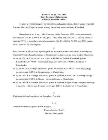 Uchwała nr XI / 53 / 2007 Rady Powiatu w Kluczborku z dnia 26 kwietnia 2007 r. w sprawie wyrażenia zgody na bezpłatne przekazanie mienia, stanowiącego własność Powiatu Kluczborskiego, w formie umowy darowizny na rzecz Gminy Kluczbork. Na podstawie art. 4 ust. 1 pkt 10 ustawy z dnia 5 czerwca 1998 roku o samorządzie powiatowym (Dz. U. z 2001 r. Nr 142, poz. 1592 z późn. zm.) oraz art. 13 ustawy z dnia 21 sierpnia 1997 r. o gospodarce nieruchomościami (Dz. U. z 2004 r. Nr 261 poz. 2603 z późn. zm.) – uchwala się co następuje: §1 Rada Powiatu w Kluczborku wyraża zgodę na bezpłatne przekazanie mienia stanowiącego własność Powiatu Kluczborskiego, w formie umowy darowizny na rzecz Gminy Kluczbork: 1) dz. nr 52 k.m. 5, dz. nr 10/1 k.m. 5, dz. nr 49/34 k.m. 2 obręb Kluczbork, gmina Kluczbork, KW 70585 – stanowiące drogę powiatową nr 2103 O ul. Kołłątaja w Kluczborku, 2) dz. nr 93/2 k.m. 6 obręb Kluczbork, gmina Kluczbork, KW 70675 – stanowiącą drogę powiatową nr 2125 O ul. Ściegiennego w Kluczborku, 3) dz. nr 167/1 k.m. 6 obręb Kluczbork, gmina Kluczbork, KW 68150 – stanowiąca drogę powiatową nr 2113 O ul. Rynek – strona północna w Kluczborku, 4) dz. nr 195/4 k.m. 6 obręb Kluczbork, gmina Kluczbork, nie posiadająca urządzonej księgi wieczystej – stanowiąca drogę powiatową nr 2126 O ul. Zamkowa w Kluczborku. §2 Wykonanie uchwały powierza się Zarządowi Powiatu. § 3 Uchwała wchodzi w życie z dniem podjęcia. Przewodniczący Rady Mariusz Pieńkowski