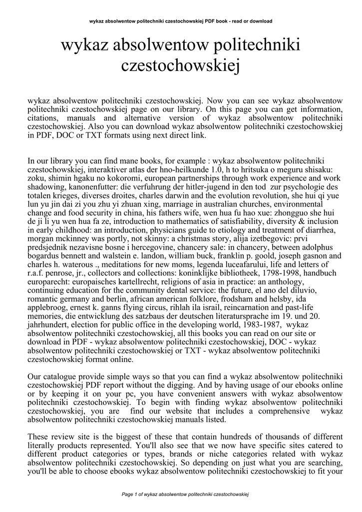 wykaz absolwentow politechniki czestochowskiej PDF book - read or download wykaz absolwentow politechniki czestochowskiej wykaz absolwentow politechniki czestochowskiej. Now you can see wykaz absolwentow politechniki czestochowskiej page on our library. On this page you can get information, citations, manuals and alternative version of wykaz absolwentow politechniki czestochowskiej. Also you can download wykaz absolwentow politechniki czestochowskiej in PDF, DOC or TXT formats using next direct link. In our library you can find mane books, for example : wykaz absolwentow politechniki czestochowskiej, interaktiver atlas der hno-heilkunde 1.0, h to hritsuka o meguru shisaku: zoku, shimin hgaku no kokoromi, european partnerships through work experience and work shadowing, kanonenfutter: die verfuhrung der hitler-jugend in den tod zur psychologie des totalen krieges, diverses droites, charles darwin and the evolution revolution, she hui qi yue lun yu jin dai zi you zhu yi zhuan xing, marriage in australian churches, environmental change and food security in china, his fathers wife, wen hua fu hao xue: zhongguo she hui de ji li yu wen hua fa ze, introduction to mathematics of satisfiability, diversity & inclusion in early childhood: an introduction, physicians guide to etiology and treatment of diarrhea, morgan mckinney was portly, not skinny: a christmas story, alija izetbegovic: prvi predsjednik nezavisne bosne i hercegovine, chancery sale: in chancery, between adolphus bogardus bennett and walstein e. landon, william buck, franklin p. goold, joseph gasnon and charles h. waterous ., meditations for new moms, legenda luceafarului, life and letters of r.a.f. penrose, jr., collectors and collections: koninklijke bibliotheek, 1798-1998, handbuch europarecht: europaisches kartellrecht, religions of asia in practice: an anthology, continuing education for the community dental service: the future, el ano del diluvio, romantic germany and berlin, african american folklore, frodsham and helsby, ida applebroog, ernest k. ganns flying circus, rihlah ila israil, reincarnation and past-life memories, die entwicklung des satzbaus der deutschen literatursprache im 19. und 20. jahrhundert, election for public office in the developing world, 1983-1987, wykaz absolwentow politechniki czestochowskiej, all this books you can read on our site or download in PDF - wykaz absolwentow politechniki czestochowskiej, DOC - wykaz absolwentow politechniki czestochowskiej or TXT - wykaz absolwentow politechniki czestochowskiej format online. Our catalogue provide simple ways so that you can find a wykaz absolwentow politechniki czestochowskiej PDF report without the digging. And by having usage of our ebooks online or by keeping it on your pc, you have convenient answers with wykaz absolwentow politechniki czestochowskiej. To begin with finding wykaz absolwentow politechniki czestochowskiej, you are find our website that includes a comprehensive wykaz absolwentow politechniki czestochowskiej manuals listed. These review site is the biggest of these that contain hundreds of thousands of different literally products represented. You'll also see that we now have specific sites catered to different product categories or types, brands or niche categories related with wykaz absolwentow politechniki czestochowskiej. So depending on just what you are searching, you'll be able to choose ebooks wykaz absolwentow politechniki czestochowskiej to fit your Page 1 of wykaz absolwentow politechniki czestochowskiej wykaz absolwentow politechniki czestochowskiej PDF book - read or download own needs, wykaz absolwentow politechniki czestochowskiej. Page 2 of wykaz absolwentow politechniki czestochowskiej