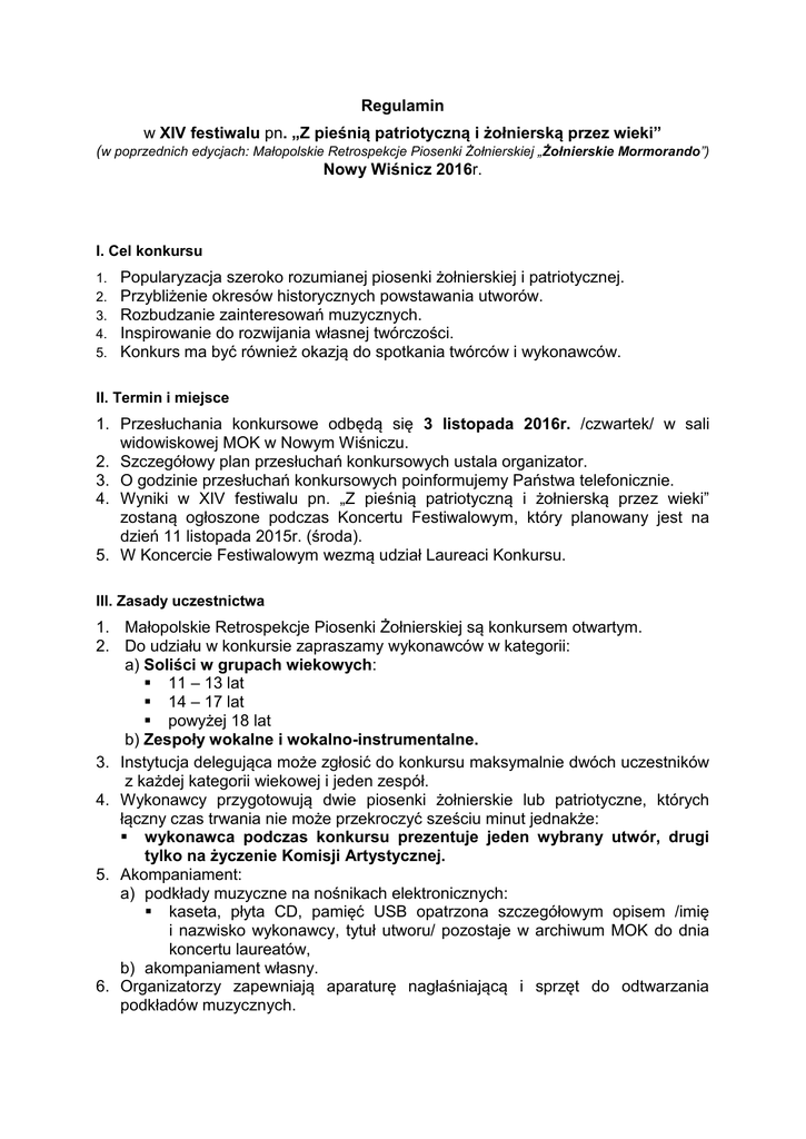 Regulamin w XIV festiwalu pn. „Z pieśnią patriotyczną i żołnierską przez wieki” (w poprzednich edycjach: Małopolskie Retrospekcje Piosenki Żołnierskiej „Żołnierskie Mormorando”) Nowy Wiśnicz 2016r. I. Cel konkursu 1. 2. 3. 4. 5. Popularyzacja szeroko rozumianej piosenki żołnierskiej i patriotycznej. Przybliżenie okresów historycznych powstawania utworów. Rozbudzanie zainteresowań muzycznych. Inspirowanie do rozwijania własnej twórczości. Konkurs ma być również okazją do spotkania twórców i wykonawców. II. Termin i miejsce 1. Przesłuchania konkursowe odbędą się 3 listopada 2016r. /czwartek/ w sali widowiskowej MOK w Nowym Wiśniczu. 2. Szczegółowy plan przesłuchań konkursowych ustala organizator. 3. O godzinie przesłuchań konkursowych poinformujemy Państwa telefonicznie. 4. Wyniki w XIV festiwalu pn. „Z pieśnią patriotyczną i żołnierską przez wieki” zostaną ogłoszone podczas Koncertu Festiwalowym, który planowany jest na dzień 11 listopada 2015r. (środa). 5. W Koncercie Festiwalowym wezmą udział Laureaci Konkursu. III. Zasady uczestnictwa 1. Małopolskie Retrospekcje Piosenki Żołnierskiej są konkursem otwartym. 2. Do udziału w konkursie zapraszamy wykonawców w kategorii: a) Soliści w grupach wiekowych: 11 – 13 lat 14 – 17 lat powyżej 18 lat b) Zespoły wokalne i wokalno-instrumentalne. 3. Instytucja delegująca może zgłosić do konkursu maksymalnie dwóch uczestników z każdej kategorii wiekowej i jeden zespół. 4. Wykonawcy przygotowują dwie piosenki żołnierskie lub patriotyczne, których łączny czas trwania nie może przekroczyć sześciu minut jednakże: wykonawca podczas konkursu prezentuje jeden wybrany utwór, drugi tylko na życzenie Komisji Artystycznej. 5. Akompaniament: a) podkłady muzyczne na nośnikach elektronicznych: kaseta, płyta CD, pamięć USB opatrzona szczegółowym opisem /imię i nazwisko wykonawcy, tytuł utworu/ pozostaje w archiwum MOK do dnia koncertu laureatów, b) akompaniament własny. 6. Organizatorzy zapewniają aparaturę nagłaśniającą i sprzęt do odtwarzania podkładów muzycznych. IV. Kryteria oceny 1. Prezentacje konkursowe oceni powołana przez organizatorów Komisja Artystyczna. 2. Komisja Artystyczna dokona oceny według następujących kryteriów: walory wokalne, kreatywność i twórczość własna, dobór repertuaru do wieku i możliwości wykonawcy, staranność wykonania (intonacja, dykcja, interpretacja), kompozycja i aranżacja, prezentacja – ogólny wyraz artystyczny. 3. Podstawą do sformułowania werdyktu jest wysłuchanie przez Jury wszystkich uczestników konkursu. 4. Decyzja Komisji jest ostateczna i nieodwołalna. 5. Uczestnicy konkursu mają prawo zwracania się do Komisji o uzasadnienie swojej oceny. V. Nagrody 1. Laureaci otrzymają nagrody i wyróżnienia ufundowane przez organizatorów konkursu. 2. Wszyscy uczestnicy konkursu otrzymają pamiątkowe dyplomy. VI. Zasady organizacyjne 1. Organizatorzy: Burmistrz Nowego Wiśnicza, Miejski Ośrodek Kultury w Nowym Wiśniczu, 2. Karty zgłoszeń należy przesłać do dnia 24 października 2016r., (termin ostateczny) na adres biura organizacyjnego. 3. Organizatorzy nie pokrywają kosztów przejazdu uczestników konkursu. 4. Wykonawcy oraz ich opiekunowie otrzymuje posiłek regenerujący. 5. Wykonawcy proszeni są o przybycie, co najmniej na pół godziny przed wyznaczoną godziną występu w celu załatwienia spraw organizacyjnych i przygotowania się do konkursu. 6. O ewentualnych zmianach organizacyjno-regulaminowych uczestnicy zostaną powiadomieni. 7. Uczestnik wyraża zgodę na przetwarzanie swoich danych osobowych (Dz. U. Nr 133, poz. 833) 8. Sprawy nie objęte niniejszym Regulaminem rozstrzyga organizator. 9. Biuro Organizacyjne: Miejski Ośrodek Kultury Rynek 16 32-720 Nowy Wiśnicz tel. 14-61-28-704, 14-68-50-933 e-mail: [email protected]