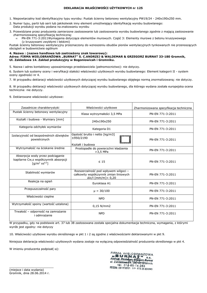 DEKLARACJA WŁAŚCIWOŚCI UŻYTKOWYCH nr 125 1. Niepowtarzalny kod identyfikacyjny typu wyrobu: Pustak ścienny betonowy wentylacyjny PW19/24 - 240x190x250 mm. 2. Numer typu, partii lub serii lub jakikolwiek inny element umożliwiający identyfikację wyrobu budowlanego: Data produkcji wyrobu podana na znakowaniu wyrobu 3. Przewidziane przez producenta zamierzone zastosowanie lub zastosowania wyrobu budowlanego zgodnie z mającą zastosowanie zharmonizowaną specyfikacją techniczną: • PN-EN 771-3:2011Wymagania dotyczące elementów murowych. Część 3: Elementy murowe z betonu kruszywowego (z kruszywami zwykłymi i lekkimi) Pustak ścienny betonowy wentylacyjny przeznaczony do wznoszeniu obudów pionów wentylacyjnych tynkowanych nie przenoszących obciążeń w budownictwie ogólnym 4. Nazwa : (nazwa handlowa lub zastrzeżony znak towarowy): Adres: FIRMA WIELOBRANŻOWA „BURNAT” S. C.ANDRZEJ & WALDEMAR & GRZEGORZ BURNAT 33-180 Gromnik, Ul. Zakładowa 14. Zakład produkcyjny w Bogoniowicah i Gromniku. 5. Nazwa i adres kontaktowy upoważnionego przedstawiciela (pełnomocnictwo): nie dotyczy. 6. System lub systemy oceny i weryfikacji stałości właściwości użytkowych wyrobu budowlanego: Element kategorii II - system oceny zgodności nr 4. 7. W przypadku deklaracji właściwości użytkowych dotyczącej wyrobu budowlanego objętego normą znormalizowaną: nie dotyczy. 8. W przypadku deklaracji właściwości użytkowych dotyczącej wyrobu budowlanego, dla którego wydana została europejska ocena techniczna: nie dotyczy. 9. Deklarowane właściwości użytkowe: Zasadnicze charakterystyki Pustak ścienny betonowy wentylacyjny Kształt i budowa - Wymiary [mm] Kategoria odchyłek wymiarów Izolacyjność od bezpośrednich dźwięków powietrznych Wytrzymałość na ściskanie średnie Absorpcja wody przez podciąganie kapilarne Cw,s współczynnik absorpcji [g/m2 xs0,5] Stabilność wymiarów Reakcja na ogień Przepuszczalność pary Właściwości cieplne Wytrzymałość spoiny (wartość ustalona) Trwałość – odporność na zamrażanie i odmrażanie Właściwości użytkowe Zharmonizowana specyfikacja techniczna Klasa wytrzymałości 3,5 MPa PN-EN 771-3:2011 240x190x250 PN-EN 771-3:2011 Kategoria D1 PN-EN 771-3:2011 Gęstość brutto i netto [kg/m3] ≤950/2190 Kształt i budowa Prostopadle do powierzchni kładzenia >3,5 MPa PN-EN 771-3:2011 PN-EN 771-3:2011 ≤ 15 PN-EN 771-3:2011 Rozszerzalność pod wpływem wilgoci – całkowity współczynnik zmian liniowych ∆lc/l [mm/m]< 0,20 PN-EN 771-3:2011 Euroklasa A1 PN-EN 771-3:2011 µ = 30/100 PN-EN 771-3:2011 NPD PN-EN 771-3:2011 0,15 N/mm2 PN-EN 771-3:2011 NPD PN-EN 771-3:2011 W przypadku, gdy na podstawie art. 37 lub 38 zastosowana została specjalna dokumentacja techniczna, wymagania, z którymi wyrób jest zgodny: nie dotyczy 10. Właściwości użytkowe wyrobu określonego w pkt 1 i 2 są zgodne z właściwościami deklarowanymi w pkt 9. Niniejsza deklaracja właściwości użytkowych wydana zostaje na wyłączną odpowiedzialność producenta określonego w pkt 4. W imieniu producenta podpisał(-a): ________________________ (nazwisko i stanowisko) _________________________ (miejsce i data wydania) Gromnik, dnia 28.06.2014 r.