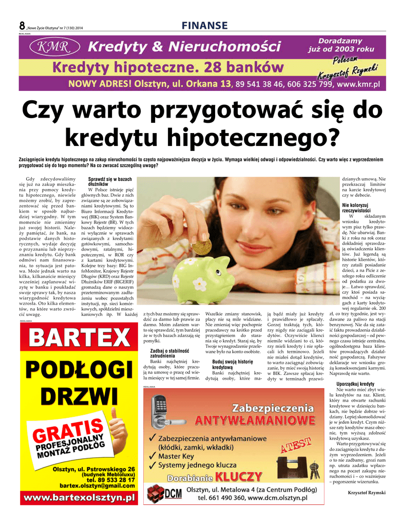 8 finanse “Nowe Życie Olsztyna” nr 7 (130) 2014 Czy warto przygotować się do kredytu hipotecznego? Zaciągnięcie kredytu hipotecznego na zakup nieruchomości to często najpoważniejsza decyzja w życiu. Wymaga wielkiej odwagi i odpowiedzialności. Czy warto więc z wyprzedzeniem przygotować się do tego momentu? Na co zwracać szczególną uwagę? Gdy zdecydowaliśmy się już na zakup mieszkania przy pomocy kredytu hipotecznego, niewiele możemy zrobić, by zaprezentować się przed bankiem w sposób najbardziej wiarygodny. W tym momencie nie zmienimy już swojej historii. Należy pamiętać, że bank, na podstawie danych historycznych, wydaje decyzję o przyznaniu lub nieprzyznaniu kredytu. Gdy bank odmówi nam finansowania, to sytuacja jest patowa. Może jednak warto na kilka, kilkanaście miesięcy wcześniej zaplanować wizytę w banku i poukładać swoje sprawy tak, by nasza wiarygodność kredytowa wzrosła. Oto kilka elementów, na które warto zwrócić uwagę. REKLAMA dzianych umową. Nie przekraczaj limitów na karcie kredytowej czy w debecie. Sprawdź się w bazach dłużników W Polsce istnieje pięć głównych baz. Dwie z nich związane są ze zobowiązaniami kredytowymi. Są to Biuro Informacji Kredytowej (BIK) oraz System Bankowy Rejestr (BR). W tych bazach będziemy widoczni wyłącznie w sprawach związanych z kredytami: gotówkowymi, samochodowymi, ratalnymi, hipotecznymi, w ROR czy z kartami kredytowymi. Kolejne trzy bazy: BIG InfoMonitor, Krajowy Rejestr Długów (KRD) oraz Rejestr Dłużników ERIF (BIGERIF) gromadzą dane o naszym przeterminowanym zadłużeniu wobec pozostałych instytucji, np. sieci komórkowych, spółdzielni mieszkaniowych itp. W każdej Nie koloryzuj rzeczywistości z tych baz możemy się sprawdzić za darmo lub prawie za darmo. Moim zdaniem warto się sprawdzić, tym bardziej że w tych bazach zdarzają się pomyłki. Zadbaj o stabilność zatrudnienia Banki najchętniej kredytują osoby, które pracują na umowę o pracę od wielu miesięcy w tej samej firmie. REKLAMA Wszelkie zmiany stanowisk, płacy nie są mile widziane. Nie zmieniaj więc pochopnie pracodawcy na krótko przed przystąpieniem do starania się o kredyt. Staraj się, by Twoje wynagrodzenie przelewane było na konto osobiste. Buduj swoją historię kredytową Banki najchętniej kredytują osoby, które ma- ją bądź miały już kredyty i prawidłowo je spłacały. Gorzej traktują tych, którzy nigdy nie zaciągali kredytów. Oczywiście klienci niemile widziani to ci, którzy mieli kredyty i nie spłacali ich terminowo. Jeżeli nie miałeś dotąd kredytów, to warto zaciągnąć zobowiązanie, by mieć swoją historię w BIK. Zawsze spłacaj kredyty w terminach przewi- W składanym wniosku kredytowym pisz tylko prawdę. Nie ubarwiaj. Banki z roku na rok coraz dokładniej sprawdzają oświadczenia klientów. Już legendą są historie klientów, którzy zataili posiadanie dzieci, a na Picie z zeszłego roku odliczenie od podatku za dwoje… Łatwo sprawdzić, czy ktoś posiada samochód – na wyciągach z karty kredytowej regularnie ok. 200 zł, co trzy tygodnie, jest wydawane za paliwo na stacji benzynowej. Nie da się zataić faktu prowadzenia działalności gospodarczej – od pewnego czasu istnieje centralna, ogólnodostępna baza klientów prowadzących działalność gospodarczą. Fałszywe deklaracje we wniosku grożą konsekwencjami karnymi. Naprawdę nie warto. Uporządkuj kredyty Nie warto mieć zbyt wielu kredytów na raz. Klient, który ma otwarte rachunki kredytowe w dziesięciu bankach, nie będzie dobrze widziany. Lepiej skonsolidować je w jeden kredyt. Czym niższe raty kredytów masz obecnie, tym wyższą zdolność kredytową uzyskasz. Warto przygotowywać się do zaciągnięcia kredytu z dużym wyprzedzeniem. Jeżeli o to nie zadbamy, grozi nam np. utrata zadatku wpłaconego na poczet zakupu nieruchomości i – co ważniejsze – pogorszenie wizerunku. Krzysztof Rzymski