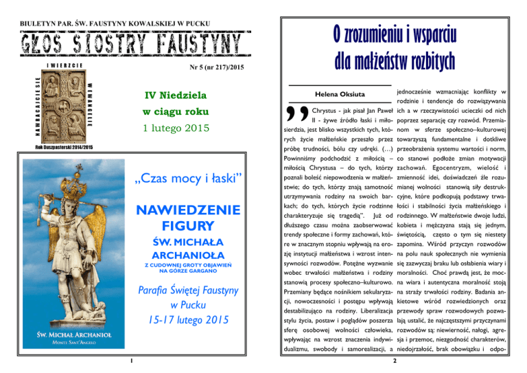 BIULETYN PAR. ŚW. FAUSTYNY KOWALSKIEJ W PUCKU Głos Siostry FaustynY Nr 5 (nr 217)/2015 IV Niedziela w ciągu roku 1 lutego 2015 „Czas mocy i łaski” NAWIEDZENIE FIGURY ŚW. MICHAŁA ARCHANIOŁA Z CUDOWNEJ GROTY OBJAWIEŃ NA GÓRZE GARGANO Parafia Świętej Faustyny w Pucku 15-17 lutego 2015 1 „ O zrozumieniu i wsparciu dla małżeństw rozbitych jednocześnie wzmacniając konflikty w rodzinie i tendencje do rozwiązywania ich a w rzeczywistości ucieczki od nich poprzez separację czy rozwód. Przemianom w sferze społeczno–kulturowej towarzyszą fundamentalne i dotkliwe przeobrażenia systemu wartości i norm, co stanowi podłoże zmian motywacji zachowań. Egocentryzm, wielość i zmienność idei, doświadczeń źle rozumianej wolności stanowią siły destrukcyjne, które podkopują podstawy trwałości i stabilności życia małżeńskiego i rodzinnego. W małżeństwie dwoje ludzi, kobieta i mężczyzna stają się jednym, świętością, często o tym się niestety zapomina. Wśród przyczyn rozwodów na polu nauk społecznych nie wymienia się zazwyczaj braku lub osłabienia wiary i moralności. Choć prawdą jest, że mocna wiara i autentyczna moralność stoją na straży trwałości rodziny. Badania ankietowe wśród rozwiedzionych oraz przewody spraw rozwodowych pozwalają ustalić, że najczęstszymi przyczynami rozwodów są: niewierność, nałogi, agresja i przemoc, niezgodność charakterów, niedojrzałość, brak obowiązku i odpo- Helena Oksiuta Chrystus - jak pisał Jan Paweł II - żywe źródło łaski i miłosierdzia, jest blisko wszystkich tych, których życie małżeńskie przeszło przez próbę trudności, bólu czy udręki. (…) Powinniśmy podchodzić z miłością – miłością Chrystusa – do tych, którzy poznali boleść niepowodzenia w małżeństwie; do tych, którzy znają samotność utrzymywania rodziny na swoich barkach; do tych, których życie rodzinne charakteryzuje się tragedią”. Już od dłuższego czasu można zaobserwować trendy społeczne i formy zachowań, które w znacznym stopniu wpływają na erozję instytucji małżeństwa i wzrost intensywności rozwodów. Potężne wyzwanie wobec trwałości małżeństwa i rodziny stanowią procesy społeczno–kulturowo. Przemiany będące nośnikiem sekularyzacji, nowoczesności i postępu wpływają destabilizująco na rodziny. Liberalizacja stylu życia, postaw i poglądów poszerza sferę osobowej wolności człowieka, wpływając na wzrost znaczenia indywidualizmu, swobody i samorealizacji, a 2 wiedzialności, częste i długie rozłąki. Badania naukowe wskazują, iż rozwód zdarza się częściej wśród osób, które zawarły związek małżeński stosunkowe wcześnie. Jest też bardziej powszechnym zjawiskiem dla osób w tzw. kryzysie wieku średniego. Rozwody częściej się zdarzają również wśród osób geograficznie, mentalnie i poglądowo ruchliwych, co wynika z utraty stabilizującego wpływu więzi rodzinnych i środowiskowych. Choć czasem rzeczywiście rozwód jest jedynym wyjściem z „chorej” sytuacji, to jednak należy podkreślić, że decyzja o rozwodzie niesie za sobą trudne i długotrwałe konsekwencje, dla jednostki i co ważniejsze dla całej rodziny. Coraz liczniejsze rozwody stanowią jakże bolesną, delikatną i ważną kwestię dla Kościoła. Warto w tym miejscu przytoczyć słowa papieża Franciszka, które w ostatnim czasie w sposób szczególny zachęcają do dyskusji: „(…) to prawda, że rozwodnicy nie są ekskomunikowani, ale nie mogą być rodzicami chrzestnymi, nie mogą czytać Pisma Świętego podczas mszy, nie mają prawa do Komunii ani nie mogą prowadzić katechezy. Cała lista zakazów. Wydaje się, że oni są de facto ekskomunikowani. Kiedy Kościół promuje jedynie taki stan, to w rzeczywistości pozbawia siły moralnej i duchowej człowieka”. Zatem czy w Kościele jest miejsce dla rozwodników? „Żona niech nie odchodzi od swego męża! Gdyby zaś odeszła, niech pozostanie samotną albo niech się pojedna ze swym mężem. Mąż również niech nie oddala żony” ( 1 Kor 7, 10-11). Te słowa mogą boleć, ale lepiej, żeby słowo Boże przeraziło i dało do myślenia, niż szukać mądrości życiowej wbrew Chrystusowi. Lepiej uznać, że dana sytuacja życiowa jest niezgodna z wolą Bożą, niż tłumaczyć sobie, że jest w porządku, że tylko zacofany Kościół nie idzie z duchem czasu. Bardzo ważne w tej kwestii jest zrozumienie i wsparcie Kościoła. Ale pamiętajmy Kościół i duszpasterze są od tego, aby nazywać rzeczy po imieniu, grzech to grzech. Kościół NIE jest od tego, aby usprawiedliwiać i tłumaczyć każdy nasz zły czyn i jeszcze pewnie „pogłaskać po głowie” i powiedzieć nic się nie stało, rób tak dalej . Grzech i zanik poczucia grzechu skutkuje jedynie duchową atrofią i pustką serca. Prawdą jest, że człowiek po rozwodzie mimo pewnych ograniczeń nie znajduje się poza nawiasem Kościoła. Odwrotnie, raczej razem z niepowodzeniami człowieka następuje jego odwrócenie od Kościoła, osłabienie wiary. Każdy wierzący powinien uczestniczyć w życiu religijnym Kościoła w stopniu dla niego dostępnym. Zawsze potrzebny jest kontakt z Bogiem, ze słowem Bożym głoszonym w różnej formie przez Kościół zarówno w celu podtrzymania wiary otrzymanej na chrzcie, jak również nawrócenia i ducha pokuty. Dla życia i roz3 woju wiary niezastąpiona jest modlitwa. Kościół powinien zachęcać osoby „po przejściach” do modlitwy, do podejmowania różnych działań w zakresie miłości chrześcijańskiej, działalności charytatywnej, czy apostolatu. Być rozwiedzionym nie oznacza być złym, zepsutym moralnie. Rozwód stanowi zawsze dramat, ale nie oznacza końca. Najważniejsze odnaleźć właściwą drogę, powrócić do Boga. Człowiek bez wiary zawsze będzie doświadczał ciemności. Nasz Wielki Rodak Jan Paweł II mówił „(…) niech Kościół modli się 
