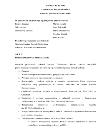 Protokół Nr 22/2003 z posiedzenia Zarządu Powiatu z dnia 15