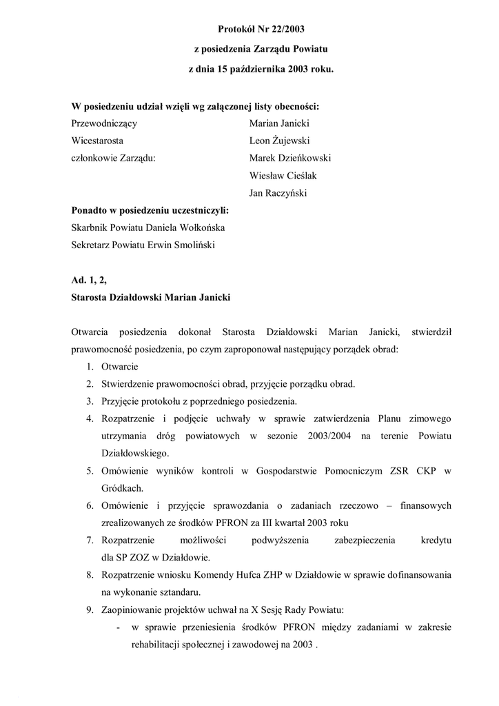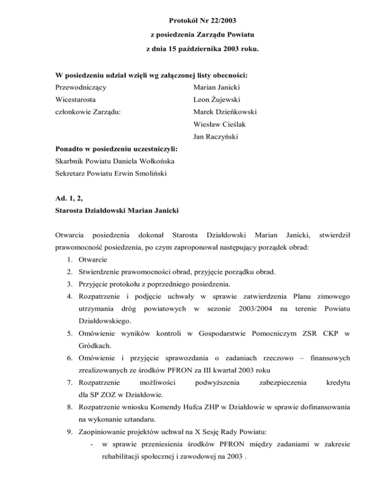 Protokół Nr 22/2003 z posiedzenia Zarządu Powiatu z dnia 15 października 2003 roku. W posiedzeniu udział wzięli wg załączonej listy obecności: Przewodniczący Marian Janicki Wicestarosta Leon Żujewski członkowie Zarządu: Marek Dzieńkowski Wiesław Cieślak Jan Raczyński Ponadto w posiedzeniu uczestniczyli: Skarbnik Powiatu Daniela Wołkońska Sekretarz Powiatu Erwin Smoliński Ad. 1, 2, Starosta Działdowski Marian Janicki Otwarcia posiedzenia dokonał Starosta Działdowski Marian Janicki, stwierdził prawomocność posiedzenia, po czym zaproponował następujący porządek obrad: 1. Otwarcie 2. Stwierdzenie prawomocności obrad, przyjęcie porządku obrad. 3. Przyjęcie protokołu z poprzedniego posiedzenia. 4. Rozpatrzenie i podjęcie uchwały w sprawie zatwierdzenia Planu zimowego utrzymania dróg powiatowych w sezonie 2003/2004 na terenie Powiatu Działdowskiego. 5. Omówienie wyników kontroli w Gospodarstwie Pomocniczym ZSR CKP w Gródkach. 6. Omówienie i przyjęcie sprawozdania o zadaniach rzeczowo – finansowych zrealizowanych ze środków PFRON za III kwartał 2003 roku 7. Rozpatrzenie możliwości podwyższenia zabezpieczenia kredytu dla SP ZOZ w Działdowie. 8. Rozpatrzenie wniosku Komendy Hufca ZHP w Działdowie w sprawie dofinansowania na wykonanie sztandaru. 9. Zaopiniowanie projektów uchwał na X Sesję Rady Powiatu: - w sprawie przeniesienia środków PFRON między zadaniami w zakresie rehabilitacji społecznej i zawodowej na 2003 . - w sprawie przyjęcia programu przeciwdziałania przestępczości i patologiom społecznym w powiecie działdowskim w latach 2003 – 2006 – „Bezpieczny Powiat Działdowski” - w sprawie zmiany w Regulaminie Organizacyjnym Starostwa Powiatowego w Działdowie - w sprawie zmiany budżetu Powiatu na 2003 rok. 10. Sprawy różne. 11. Wolne wnioski. Skarbnik Powiatu Daniela Wołkońska Proszę o wprowadzenie do porządku obrad pkt. : - rozpatrzenie i podjęcie uchwały w sprawie założeń do projektu budżetu Powiatu Działdowskiego na 2004 r., - rozpatrzenie i podjęcie uchwały w sprawie założeń i materiałów planistycznych do projektu budżetu Powiatu Działdowskiego na 2004 r. dla jednostek organizacyjnych Powiatu. Zarząd jednogłośnie przyjął porządek posiedzenia. 1. Otwarcie 2. Stwierdzenie prawomocności obrad, przyjęcie porządku obrad. 3. Przyjęcie protokołu z poprzedniego posiedzenia. 4. Rozpatrzenie i podjęcie uchwały w sprawie zatwierdzenia Planu zimowego utrzymania dróg powiatowych w sezonie 2003/2004 na terenie Powiatu Działdowskiego. 5. Omówienie wyników kontroli w Gospodarstwie Pomocniczym ZSR CKP w Gródkach. 6. Omówienie i przyjęcie sprawozdania o zadaniach rzeczowo – finansowych zrealizowanych ze środków PFRON za III kwartał 2003 roku 7. Rozpatrzenie możliwości podwyższenia zabezpieczenia kredytu dla SP ZOZ w Działdowie. 8. Rozpatrzenie wniosku Komendy Hufca ZHP w Działdowie w sprawie dofinansowania na wykonanie sztandaru. 9. Zaopiniowanie projektów uchwał na X Sesję Rady Powiatu: - w sprawie przeniesienia środków PFRON między zadaniami w zakresie rehabilitacji społecznej i zawodowej na 2003 . - w sprawie przyjęcia programu przeciwdziałania przestępczości i patologiom społecznym w powiecie działdowskim w latach 2003 – 2006 – „Bezpieczny Powiat Działdowski” - w sprawie zmiany w Regulaminie Organizacyjnym Starostwa Powiatowego w Działdowie - w sprawie zmiany budżetu Powiatu na 2003 rok. 10. Rozpatrzenie i podjęcie uchwały w sprawie założeń do projektu budżetu Powiatu Działdowskiego na 2004 rok. 11. Rozpatrzenie i podjęcie uchwały w sprawie założeń i materiałów planistycznych do projektu budżetu Powiatu Działdowskiego na 2004 rok dla jednostek organizacyjnych Powiatu. 12. Sprawy różne. 13. Wolne wnioski. Ad.3. Zarząd przyjął protokół z poprzedniego posiedzenia. Ad. 4 (Uczestniczy Pan Jerzy Grochocki – Dyrektor Powiatowego Zarządu Dróg w Działdowie). Jerzy Grochocki Przedstawił projekt uchwały w sprawie zatwierdzenia Planu zimowego utrzymania dróg powiatowych w sezonie 2003/04 na terenie Powiatu Działdowskiego. W planie operacyjnym zimowego utrzymania dróg zawarte zostały: - zakres robót zimowego utrzymania, - wykaz materiałów do zwalczania śliskości, - przewidywalne zakresy i koszty pracy i dyżuru sprzętu przy zimowym utrzymaniu dróg, - przewidywalne zużycie i wartość mieszanki piaskowo – solnej, - planowane koszty zimowego utrzymania dróg, - wykaz dróg powiatowych wg standardów zimowego utrzymania dróg, - wykaz dróg i odcinków dróg powiatowych nie objętych zimowym utrzymaniem, - wykaz tras piaskarek, - wykaz pracowników Powiatowego Zarządu Dróg w Działdowie związanych z akcją zimową w sezonie 2003/04. - wykaz łączności telefonicznej w okresie zimowym 2003/04 z sąsiadującymi Zarządami Dróg oraz z innymi służbami. Ustalając sieć dróg objętych zimowym utrzymaniem kierowano się zasadą, aby objąć nimi wszystkie drogi o nawierzchni twardej, po której odbywa się komunikacja autobusowa i dowóz dzieci do szkół. Sekretarz Powiatu – Erwin Smoliński Czy służby świadczące usługi podczas realizacji ubiegłego planu zimowego utrzymania dróg sumiennie wywiązywały się ze swoich obowiązków? Czy efektywność pracy tych zespołów bierze Pan pod uwagę angażując je do dalszej pracy? Jerzy Grococki Zatrudniamy ludzi, którzy w poprzednich sezonach najlepiej wywiązywali się z powierzonych im obowiązków. Wicestarosta Leon Żujewski Proszę o ujęcia w Planie zimowego utrzymania dróg, w ciągu drogi Powiatowej Iłowo – Białuty, odcinka drogi od granicy Powiatu Działdowskiego do drogi krajowej Nr 7. Jerzy Grococki Odcinek tej drogi ujęty zostanie w Planie zimowego utrzymania dróg. Zarząd jednogłośnie podjął Uchwałę Nr 49/03 w sprawie zatwierdzenia Planu zimowego utrzymania dróg powiatowych w sezonie 2003/2004 na terenie powiatu Działdowskiego. (Uchwała stanowi
