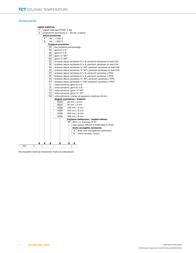 TCT CZUJNIKI TEMPERATURY A B C D E F H I J K L M N O P Q R S T Oznaczenie sygnał wyjściowy P sygnał wyjściowy Pt100, 4 żyły A przetwornik pomiarowy 4 … 20 mA, 2-żyłowy zakres pomiarowy A –50 ... +150°C B –50 ... +250°C Przyłącze procesowe ZZ bez przyłącza procesowego G1 gwint G ¼ B GE gwint G ½ B N4 gwint ¼" NPT N2 gwint ½" NPT S1 śrubowe złącze zaciskowe G ¼ B, pierścień zaciskowy ze stali CrNi SE śrubowe złącze zaciskowe G ½ B, pierścień zaciskowy ze stali CrNi S4 śrubowe złącze zaciskowe ¼" NPT, pierścień zaciskowy ze stali CrNi S2 śrubowe złącze zaciskowe ½" NPT, pierścień zaciskowy ze stali CrNi P1 śrubowe złącze zaciskowe G ¼ B, pierścień zaciskowy z PTFE PE śrubowe złącze zaciskowe G ½ B, pierścień zaciskowy z PTFE P4 śrubowe złącze zaciskowe ¼" NPT, pierścień zaciskowy z PTFE P2 śrubowe złącze zaciskowe ½" NPT, pierścień zaciskowy z PTFE T1 rurka ochronna, gwint G ¼ B TE rurka ochronna, gwint G ½ B T4 rurka ochronna, gwint ¼" NPT T2 rurka ochronna, gwint ½" NPT TW rurka ochronna, króciec do spawania, średnica 18 mm długość montażowa / średnica 25 mm / 3 mm 0253 50 mm / 3 mm 0503 100 mm / 6 mm 1006 150 mm / 6 mm 1506 250 mm / 6 mm 2506 350 mm / 6 mm 3506 Przyłącze elektryczne / stopień ochrony M M12 x 1, 4-pinowy, IP 67 L wtyk kątowy, DIN EN 175301-803 A, IP 65 Cechy szczególne wykonania Z Brak cech szczególnych wykonania G wolne od oleju i smaru TCT - 1 Nie wszystkie warianty oznaczenia można ze sobą łączyć! 1 CZUJNIKI AKP | SICK 2016-09-19 09:51:10 Informacje mogą ulec zmianie bez powiadomienia