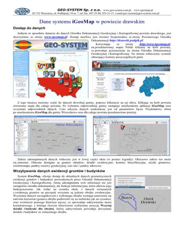 GEO-SYSTEM Sp. z o.o. www.geo-system.com.pl, www.igeomap.pl 02-732 Warszawa, ul. Podbipięty 34 m. 7, tel./fax. 847-35-80, 853-31-15 e-mail:[email protected] Dane systemu iGeoMap w powiecie drawskim Dostęp do danych Jednym ze sposobów dotarcia do danych Ośrodka Dokumentacji Geodezyjnej i Kartograficznej powiatu drawskiego, jest skorzystanie ze strony www.igeomap.pl. Dostęp moŜliwy jest równieŜ bezpośrednio ze strony Powiatowego Ośrodka Dokumentacji http://drawski.podgik.pl. Korzystając ze strony http:/www.igeomap.pl, na przedstawionej mapie Polski klikamy na herb powiatu, co powoduje przeniesienie na stronę Ośrodka Dokumentacji Geodezyjnej i Kartograficznej. Na stronie zobaczymy rysunek obrazujący kontury poszczególnych gmin. Z tego miejsca moŜemy wejść do danych dowolnej gminy, poprzez kliknięcie na jej obrys. Klikając na herb powiatu otwieramy mapę dla całego powiatu. Po wybraniu odpowiedniej gminy następuje uruchomienie aplikacji iGeoMap oraz wczytanie odpowiednich danych. Czas odczytu danych uzaleŜniony jest od parametrów łącza. Przykładowy obraz po uruchomieniu iGeoMap dla gminy Wierzchowo oraz dla całego powiatu przedstawiono poniŜej. Zakres udostępnianych danych widoczny jest w lewej części okna (w postaci legendy). Okresowo zakres ten moŜe się zmieniać. Obecnie dostępne są granice obrębów, działki ewidencyjne, kontury klasyfikacyjne, uŜytki gruntowe, ortofotomapa, punkty osnowy geodezyjnej, osie ulic i punkty adresowe. Wczytywanie danych ewidencji gruntów i budynków System iGeoMap, oferuje dostęp do aktualnych danych geometrycznych ewidencji gruntów i budynków prowadzonych przez Ośrodek Dokumentacji Geodezyjnej i Kartograficznej. Istotą udostępniania tych informacji nie jest zastąpienie ośrodka dokumentacji, ale funkcja informacyjna, która ułatwia jego funkcjonowanie. Jak widać na rysunku obok, z danych związanych z ewidencją gruntów na początek wczytane są jedynie obręby ewidencyjne. Wczytanie danych szczegółowych z wybranego obrębu wymaga ustawienia się nad nim kursorem (granica obrębu podświetli się na niebiesko jak na rysunku), oraz wciśniecie prawego klawisza myszy, co spowoduje uaktywnienie menu kontekstowego, z którego (lewym klawiszem) wybieramy pozycję Wczytaj działki i budynki dla obrębu, której uaktywnienie powoduje doczytanie działek i budynków ze wskazanego obrębu. GEO-SYSTEM Sp. z o.o. www.geo-system.com.pl, www.igeomap.pl 02-732 Warszawa, ul. Podbipięty 34 m. 7, tel./fax. 847-35-80, 853-31-15 e-mail:[email protected] 1. Dodawanie serwisów WMS Serwis iGeoMap oferuje moŜliwość dowolnego dołączania do prezentacji serwisów WMS, co umoŜliwia integrowanie danych PODGiK z danymi innych instytucji w jednym miejscu. Podłączenie nowego serwera WMS uaktywniane jest przez wybranie opcji Pliki | Dodaj serwer WMS. 2. Wczytywanie ortofotomapy W systemie istnieje moŜliwość dostępu do cyfrowej ortofotomapy i wykorzystanie jej jako podkładu do danych wektorowych. Aby wczytać ortofotomapę naleŜy aktywować jej widoczność przez „zaznaczenie” pozycji w legendzie po lewej stronie okna aplikacji . Publikowana ortofotomapa pochodzi z serwisu Geoportal.gov.pl. Ortofotomapa doczytywana jest bezpośrednio z serwera w potrzebnym zakresie. Oznacza to, Ŝe po kaŜdej zmianie widoku (zmiana skali, przesunięcie obszaru) zostanie doczytana dynamicznie. Nie wymaga to Ŝadnych dodatkowych akcji ze strony operatora. Szukanie działek Aby w prezentowanych danych znaleźć konkretną działkę ewidencyjną naleŜy wybrać z menu głównego pozycję Szukaj, a następnie pozycję Szukaj działki…. Kolejnym krokiem jest wybranie obrębu i wpisanie numeru szukanej działki. W efekcie doczytywany jest Ŝądany obręb (jeśli nie został wczytany wcześniej) i zaznaczona zostaje szukana działka (o ile istnieje). W przypadku braku działki pojawi się stosowny komunikat. Sekcje mapy Menu Szukaj umoŜliwia odnalezienie sekcji mapy zasadniczej w skali 1:1000. NaleŜy wybrać z menu głównego aplikacji pozycję Szukaj, a następnie Sekcji 1:1000. Aby znaleźć konkretną sekcję wybieramy lub podajemy godło sekcji. Po wciśnięciu klawisza OK. w centrum ekranu pokaŜe się szukana sekcja oznaczona kolorem (o ile istnieje). Osnowa geodezyjna Wśród danych udostępnianych w serwisie iGeoMap znajduje się osnowa geodezyjna. Warstwa osnowy domyślnie jest wyłączona. Aby ja włączyć naleŜy dokonać jej uaktywnienia w legendzie (analogicznie jak w przypadku ortofotmapy). MoŜliwe jest wyszukiwanie konkretnych punktów osnowy na podstawie numeru (np. 3361156). Aby dotrzeć do współrzędnych punktów lub opisów topograficznych naleŜy podać kod dostępu uzyskiwany z ośrodka dokumentacji. 3. Szukanie punktów adresowych i ulic Inną przydatną funkcją jest szukanie punktów adresowych. Czynność wykonywana analogicznie jak szukanie działek, z tym, Ŝe wybieramy pozycję Szukaj, a następnie pozycję Punktu adresowego. Pojawi się okno z moŜliwością wybrania, ulicy i wpisania numeru adresowego. Warto zauwaŜyć, Ŝe zaznaczone pole Zawierające frazę powoduje wyszukanie przez program wszystkich punktów, w których adresie znajduje się znak, bądź ciąg znaków wpisanych w polu numer. Związaną z adresami funkcją wyszukiwania jest funkcja wyszukiwanie określonej ulicy. Wyszukiwanie ulicy działa analogicznie, z tym, Ŝe wybieramy pozycję Szukaj | Ulicy. W niniejszej (krótkiej) informacji przedstawiono jedynie najwaŜniejsze elementy związane z dostępu do danych, opis szczegółowy znajduje się w plikach PDF dostępnych w menu głównym w opcji Pomoc. v.2