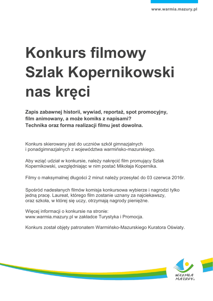 www.warmia.mazury.pl Konkurs filmowy Szlak Kopernikowski nas kręci Zapis zabawnej historii, wywiad, reportaż, spot promocyjny, film animowany, a może komiks z napisami? Technika oraz forma realizacji filmu jest dowolna. Konkurs skierowany jest do uczniów szkół gimnazjalnych i ponadgimnazjalnych z województwa warmińsko-mazurskiego. Aby wziąć udział w konkursie, należy nakręcić film promujący Szlak Kopernikowski, uwzględniając w nim postać Mikołaja Kopernika. Filmy o maksymalnej długości 2 minut należy przesyłać do 03 czerwca 2016r. Spośród nadesłanych filmów komisja konkursowa wybierze i nagrodzi tylko jedną pracę. Laureat, którego film zostanie uznany za najciekawszy, oraz szkoła, w której się uczy, otrzymają nagrody pieniężne. Więcej informacji o konkursie na stronie: www.warmia.mazury.pl w zakładce Turystyka i Promocja. Konkurs został objęty patronatem Warmińsko-Mazurskiego Kuratora Oświaty.