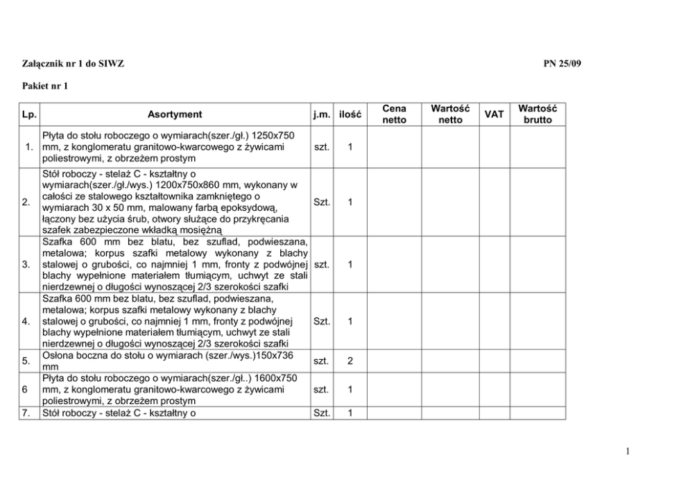 Załącznik nr 1 do SIWZ PN 25/09 Pakiet nr 1 Lp. Asortyment Płyta do stołu roboczego o wymiarach(szer./gł.) 1250x750 1. mm, z konglomeratu granitowo-kwarcowego z żywicami poliestrowymi, z obrzeżem prostym 2. 3. 4. 5. 6 7. Stół roboczy - stelaż C - kształtny o wymiarach(szer./gł./wys.) 1200x750x860 mm, wykonany w całości ze stalowego kształtownika zamkniętego o wymiarach 30 x 50 mm, malowany farbą epoksydową, łączony bez użycia śrub, otwory służące do przykręcania szafek zabezpieczone wkładką mosiężną Szafka 600 mm bez blatu, bez szuflad, podwieszana, metalowa; korpus szafki metalowy wykonany z blachy stalowej o grubości, co najmniej 1 mm, fronty z podwójnej blachy wypełnione materiałem tłumiącym, uchwyt ze stali nierdzewnej o długości wynoszącej 2/3 szerokości szafki Szafka 600 mm bez blatu, bez szuflad, podwieszana, metalowa; korpus szafki metalowy wykonany z blachy stalowej o grubości, co najmniej 1 mm, fronty z podwójnej blachy wypełnione materiałem tłumiącym, uchwyt ze stali nierdzewnej o długości wynoszącej 2/3 szerokości szafki Osłona boczna do stołu o wymiarach (szer./wys.)150x736 mm Płyta do stołu roboczego o wymiarach(szer./gł..) 1600x750 mm, z konglomeratu granitowo-kwarcowego z żywicami poliestrowymi, z obrzeżem prostym Stół roboczy - stelaż C - kształtny o j.m. ilość szt. 1 Szt. 1 szt. 1 Szt. 1 szt. 2 szt. 1 Szt. 1 Cena netto Wartość netto VAT Wartość brutto 1 8. 9. 10. 11. 12. 13. 14. 15. 16. wymiarach(szer./gł./wys.) 1500x750x860 mm, wykonany w całości ze stalowego kształtownika zamkniętego o wymiarach 30 x 50 mm, malowany farbą epoksydową, łączony bez użycia śrub, otwory służące do przykręcania szafek zabezpieczone wkładką mosiężną Szafka 600 mm bez blatu, bez szuflad, podwieszana, metalowa; korpus szafki metalowy wykonany z blachy stalowej o grubości, co najmniej 1 mm, fronty z podwójnej blachy wypełnione materiałem tłumiącym, uchwyt ze stali nierdzewnej o długości wynoszącej 2/3 szerokości szafki Szafka 600 mm bez blatu, bez szuflad, podwieszana, metalowa; korpus szafki metalowy wykonany z blachy stalowej o grubości, co najmniej 1 mm, fronty z podwójnej blachy wypełnione materiałem tłumiącym, uchwyt ze stali nierdzewnej o długości wynoszącej 2/3 szerokości szafki Szafka 300 mm bez blatu, bez szuflad, podwieszana, metalowa; korpus szafki metalowy wykonany z blachy stalowej o grubości, co najmniej 1 mm, fronty z podwójnej blachy wypełnione materiałem tłumiącym, uchwyt ze stali nierdzewnej o długości wynoszącej 2/3 szerokości szafki Osłona boczna do stołu o wymiarach (szer./wys.)150x736 mm Szafka wisząca 600 mm przeszklona, głębokość 300 mm, metalowa - lewa Szafka wisząca 600 mm przeszklona, głębokość 300 mm, metalowa - lewa Szafka wisząca 300 mm przeszklona, głębokość 300 mm, metalowa - prawa Płyta do stołu roboczego o wymiarach (szer./gł) 1820x650 mm, z konglomeratu granitowo-kwarcowego z żywicami poliestrowymi, z obrzeżem prostym Stół roboczy - stelaż C - kształtny o Szt. 1 Szt. 1 Szt. 1 Szt. 2 Szt. 1 Szt. 1 Szt. 1 Szt. 1 Szt. 2 2 17. 18. 19. 20. 21. 22. wymiarach(szer./gł./wys.) 900x600x730 mm, wykonany w całości ze stalowego kształtownika zamkniętego o wymiarach 30 x 50 mm, malowany farbą epoksydową, łączony bez użycia śrub, otwory służące do przykręcania szafek zabezpieczone wkładką mosiężną Szafka 600 mm z blatem, z 3 szufladami, przejezdna, niska, metalowa; korpus szafki metalowy wykonany z blachy stalowej o grubości, co najmniej 1 mm, fronty z podwójnej blachy wypełnione materiałem tłumiącym, uchwyt ze stali nierdzewnej o długości wynoszącej 2/3 szerokości szafki, wyposażona w system jezdny z kółkami gumowymi, pierwsza para posiada hamulec Płyta do stołu roboczego o wymiarach (szer./gł) 1820x650 mm, z konglomeratu granitowo-kwarcowego z żywicami poliestrowymi, z obrzeżem prostym Stół roboczy - stelaż C - kształtny o wymiarach(szer./gł./wys.) 900x600x730 mm, wykonany w całości ze stalowego kształtownika zamkniętego o wymiarach 30 x 50 mm, malowany farbą epoksydową, łączony bez użycia śrub, otwory służące do przykręcania szafek zabezpieczone wkładką mosiężną Szafka 600 mm z blatem, z 3 szufladami, przejezdna, niska, metalowa; korpus szafki metalowy wykonany z blachy stalowej o grubości, co najmniej 1 mm, fronty z podwójnej blachy wypełnione materiałem tłumiącym, uchwyt ze stali nierdzewnej o długości wynoszącej 2/3 szerokości szafki, wyposażona w system jezdny z kółkami gumowymi, pierwsza para posiada hamulec Płyta do stołu roboczego o wymiarach (szer./gł.) 600x750 mm, z konglomeratu granitowo-kwarcowego z żywicami poliestrowymi, z obrzeżem prostym Stół roboczy - stelaż C - kształtny o Szt. 1 Szt. 1 Szt. 2 Szt. 1 Szt. 1 Szt. 1 3 23. 24. 25. 26. 27. wymiarach(szer./gł./wys.) 600x750x860 mm, wykonany w całości ze stalowego kształtownika zamkniętego o wymiarach 30 x 50 mm, malowany farbą epoksydową, łączony bez użycia śrub, otwory służące do przykręcania szafek zabezpieczone wkładką mosiężną Szafka 600 mm bez blatu, z 4 szufladami, podwieszana, metalowa; korpus szafki metalowy wykonany z blachy stalowej o grubości, co najmniej 1 mm, fronty z podwójnej blachy wypełnione materiałem tłumiącym, uchwyt ze stali nierdzewnej o długości wynoszącej 2/3 szerokości szafki Szafka wisząca 600 mm przeszklona, głębokość 300 mm, metalowa - prawa Osłona boczna do stołu o wymiarach (szer./wys.) 150x736 mm Przystawka wyspowa o szerokości 1200 mm, stojąca samodzielnie na podłożu, wykonana z profili aluminiowych oraz elementów stalowych, montowanych bez użycia śrub, malowanych farbami epoksydowymi, bez mediów, 2 x 3 gniazda 230 V w wymiennych panelach montowanych bez śrub w prostokątnych kolumnach pionowych. Półki montowane w sposób pozwalający na zmianę wysokości ich zawieszenia, wzmocnione stalową belką z uchwyt