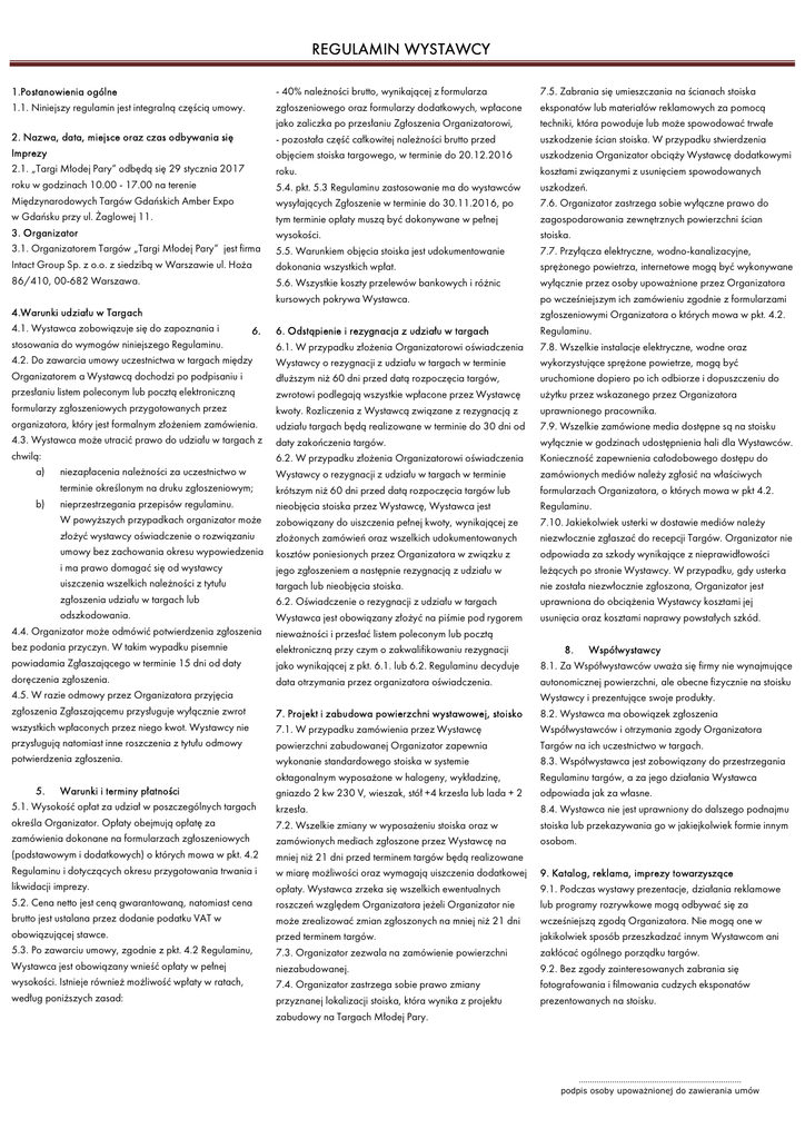 REGULAMIN WYSTAWCY 1.Postanowienia ogólne 1.1. Niniejszy regulamin jest integralną częścią umowy. 2. Nazwa, data, miejsce oraz czas odbywania się Imprezy 2.1. „Targi Młodej Pary” odbędą się 29 stycznia 2017 roku w godzinach 10.00 - 17.00 na terenie Międzynarodowych Targów Gdańskich Amber Expo w Gdańsku przy ul. Żaglowej 11. 3. Organizator 3.1. Organizatorem Targów „Targi Młodej Pary” jest firma Intact Group Sp. z o.o. z siedzibą w Warszawie ul. Hoża 86/410, 00-682 Warszawa. 4.Warunki udziału w Targach 4.1. Wystawca zobowiązuje się do zapoznania i 6. stosowania do wymogów niniejszego Regulaminu. 4.2. Do zawarcia umowy uczestnictwa w targach między Organizatorem a Wystawcą dochodzi po podpisaniu i przesłaniu listem poleconym lub pocztą elektroniczną formularzy zgłoszeniowych przygotowanych przez organizatora, który jest formalnym złożeniem zamówienia. 4.3. Wystawca może utracić prawo do udziału w targach z chwilą: a) niezapłacenia należności za uczestnictwo w terminie określonym na druku zgłoszeniowym; b) nieprzestrzegania przepisów regulaminu. W powyższych przypadkach organizator może złożyć wystawcy oświadczenie o rozwiązaniu umowy bez zachowania okresu wypowiedzenia i ma prawo domagać się od wystawcy uiszczenia wszelkich należności z tytułu zgłoszenia udziału w targach lub odszkodowania. 4.4. Organizator może odmówić potwierdzenia zgłoszenia bez podania przyczyn. W takim wypadku pisemnie powiadamia Zgłaszającego w terminie 15 dni od daty doręczenia zgłoszenia. 4.5. W razie odmowy przez Organizatora przyjęcia zgłoszenia Zgłaszającemu przysługuje wyłącznie zwrot wszystkich wpłaconych przez niego kwot. Wystawcy nie przysługują natomiast inne roszczenia z tytułu odmowy potwierdzenia zgłoszenia. 5. Warunki i terminy płatności 5.1. Wysokość opłat za udział w poszczególnych targach określa Organizator. Opłaty obejmują opłatę za zamówienia dokonane na formularzach zgłoszeniowych (podstawowym i dodatkowych) o których mowa w pkt. 4.2 Regulaminu i dotyczących okresu przygotowania trwania i likwidacji imprezy. 5.2. Cena netto jest ceną gwarantowaną, natomiast cena brutto jest ustalana przez dodanie podatku VAT w obowiązującej stawce. 5.3. Po zawarciu umowy, zgodnie z pkt. 4.2 Regulaminu, Wystawca jest obowiązany wnieść opłaty w pełnej wysokości. Istnieje również możliwość wpłaty w ratach, według poniższych zasad: - 40% należności brutto, wynikającej z formularza zgłoszeniowego oraz formularzy dodatkowych, wpłacone jako zaliczka po przesłaniu Zgłoszenia Organizatorowi, - pozostała część całkowitej należności brutto przed objęciem stoiska targowego, w terminie do 20.12.2016 roku. 5.4. pkt. 5.3 Regulaminu zastosowanie ma do wystawców wysyłających Zgłoszenie w terminie do 30.11.2016, po tym terminie opłaty muszą być dokonywane w pełnej wysokości. 5.5. Warunkiem objęcia stoiska jest udokumentowanie dokonania wszystkich wpłat. 5.6. Wszystkie koszty przelewów bankowych i różnic kursowych pokrywa Wystawca. 6. Odstąpienie i rezygnacja z udziału w targach 6.1. W przypadku złożenia Organizatorowi oświadczenia Wystawcy o rezygnacji z udziału w targach w terminie dłuższym niż 60 dni przed datą rozpoczęcia targów, zwrotowi podlegają wszystkie wpłacone przez Wystawcę kwoty. Rozliczenia z Wystawcą związane z rezygnacją z udziału targach będą realizowane w terminie do 30 dni od daty zakończenia targów. 6.2. W przypadku złożenia Organizatorowi oświadczenia Wystawcy o rezygnacji z udziału w targach w terminie krótszym niż 60 dni przed datą rozpoczęcia targów lub nieobjęcia stoiska przez Wystawcę, Wystawca jest zobowiązany do uiszczenia pełnej kwoty, wynikającej ze złożonych zamówień oraz wszelkich udokumentowanych kosztów poniesionych przez Organizatora w związku z jego zgłoszeniem a następnie rezygnacją z udziału w targach lub nieobjęcia stoiska. 6.2. Oświadczenie o rezygnacji z udziału w targach Wystawca jest obowiązany złożyć na piśmie pod rygorem nieważności i przesłać listem poleconym lub pocztą elektroniczną przy czym o zakwalifikowaniu rezygnacji jako wynikającej z pkt. 6.1. lub 6.2. Regulaminu decyduje data otrzymania przez organizatora oświadczenia. 7. Projekt i zabudowa powierzchni wystawowej, stoisko 7.1. W przypadku zamówienia przez Wystawcę powierzchni zabudowanej Organizator zapewnia wykonanie standardowego stoiska w systemie oktagonalnym wyposażone w halogeny, wykładzinę, gniazdo 2 kw 230 V, wieszak, stół +4 krzesła lub lada + 2 krzesła. 7.2. Wszelkie zmiany w wyposażeniu stoiska oraz w zamówionych mediach zgłoszone przez Wystawcę na mniej niż 21 dni przed terminem targów będą realizowane w miarę możliwości oraz wymagają uiszczenia dodatkowej opłaty. Wystawca zrzeka się wszelkich ewentualnych roszczeń względem Organizatora jeżeli Organizator nie może zrealizować zmian zgłoszonych na mniej niż 21 dni przed terminem targów. 7.3. Organizator zezwala na zamówienie powierzchni niezabudowanej. 7.4. Organizator zastrzega sobie prawo zmiany przyznanej lokalizacji stoiska, która wynika z projektu zabudowy na Targach Młodej Pary. 7.5. Zabrania się umieszczania na ścianach stoiska eksponatów lub materiałów reklamowych za pomocą techniki, która powoduje lub może spowodować trwałe uszkodzenie ścian stoiska. W przypadku stwierdzenia uszkodzenia Organizator obciąży Wystawcę dodatkowymi kosztami związanymi z usunięciem spowodowanych uszkodzeń. 7.6. Organizator zastrzega sobie wyłączne prawo do zagospodarowania zewnętrznych powierzchni ścian stoiska. 7.7. Przyłącza elektryczne, wodno-kanalizacyjne, sprężonego powietrza, internetowe mogą być wykonywane wyłącznie przez osoby upoważnione przez Organizatora po wcześniejszym ich zamówieniu zgodnie z formularzami zgłoszeniowymi Organizatora o których mowa w pkt. 4.2. Regulaminu. 7.8. Wszelkie instalac