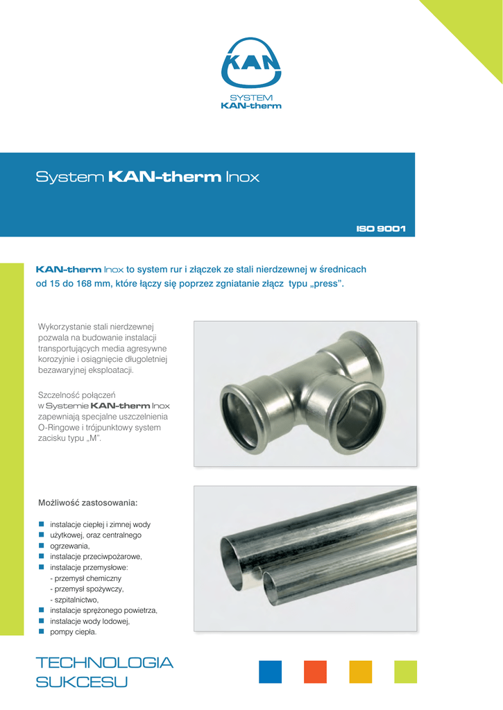 System KAN-therm Inox ISO 9001 ISO 9001 KAN-therm Inox to system rur i złączek ze stali nierdzewnej w średnicach od 15 do 168 mm, które łączy się poprzez zgniatanie złącz typu „press”. Wykorzystanie stali nierdzewnej pozwala na budowanie instalacji transportujących media agresywne korozyjnie i osiągnięcie długoletniej bezawaryjnej eksploatacji. Szczelność połączeń w Systemie KAN-therm Inox zapewniają specjalne uszczelnienia O-Ringowe i trójpunktowy system zacisku typu „M”. Możliwość zastosowania: instalacje ciepłej i zimnej wody użytkowej, oraz centralnego ogrzewania, instalacje przeciwpożarowe, instalacje przemysłowe: - przemysł chemiczny - przemysł spożywczy, - szpitalnictwo, instalacje sprężonego powietrza, instalacje wody lodowej, pompy ciepła. TECHNOLOGIA SUKCESU System KAN-therm Inox © KAN 06/2012 Prawa autorskie KAN Sp z o.o. Wszelkie prawa zastrzeżone. Tekst, obrazy, grafika oraz ich układ w wydawnictwach KAN Sp z o.o. objęte są prawami autorskimi. Zalety Systemu KAN-therm Inox: szybki i pewny montaż instalacji, bez spawania i skręcania, duży zakres średnic rur i złączek, do 168 mm, szeroki zakres temperatur pracy od -20°C do 120°C, odporność na wysokie ciśnienie, do 16 bar, możliwość łączenia z systemami tworzywowymi KAN-therm Press i Push, niewielka waga rur i złączek, wysoka estetyka wykonanych instalacji, odporność na uszkodzenia mechaniczne, możliwość optymalizacji cenowej instalacji poprzez wybór systemu Steel lub Inox w zależności od typu instalacji i agresywności korozyjnej wody. Teraz Polska ´99 ZŁOTY INSTALATOR ´97, ´99, ´02, ´08, ´11 ZŁOTY MEDAL MTP ´02, ´06 Oddział Gdynia ul. Gdyńska 82 80-209 Chwaszczyno tel. 0048 58 62 94 625 - marketing tel./fax 0048 58 62 95 397 - sprzedaż Oddział Tychy ul. Przemysłowa 55 43-100 Tychy tel./fax 0048 32 21 90 930 Przecinanie rury przy pomocy obcinaka. Fazowanie krawędzi rury. Oddział Warszawa - Magdalenka Biuro Techniczno - Handlowe ul. Wiejska 3a MAGDALENKA Łazy k. Warszawy 05-552 Wólka Kosowska tel./fax 0048 22 75 79 871 Dział Sprzedaży ul. Skrajna 3 05-091 Ząbki tel. 0048 22 48 79 516 fax 0048 22 21 38 439 Oddział Poznań ul. Grunwaldzka 399 60-173 Poznań tel. 0048 61 66 58 684 tel./fax 0048 61 87 20 937 Zaznaczanie wymaganej długości wsunięcia. Połączenie jest gotowe do zaprasowania. Połączenie przed zaprasowaniem. Połączenie zaprasowane. KAN Sp. z o.o. ul. Zdrojowa 51 16-001 Białystok-Kleosin tel. 0048 85 74 99 200 www.kan.com.pl