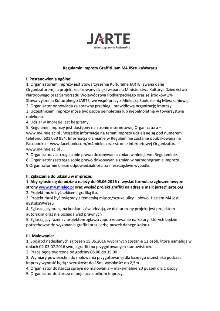 Regulamin imprezy Graffiti Jam M4 #SztukaWyrazu I. Postanowienia ogólne: 1. Organizatorem imprezy jest Stowarzyszenie Kulturalne JARTE (zwana dalej Organizatorem), a projekt realizowany dzięki wsparciu Ministerstwa Kultury i Dziedzictwa Narodowego oraz Samorządu Województwa Podkarpackiego oraz ze środków 1% Stowarzyszenia Kulturalnego JARTE, we współpracy z Mielecką Spółdzielnią Mieszkaniową. 2. Organizator odpowiada za sprawny przebieg i prawidłową organizację imprezy. 3. Uczestnikiem imprezy może być osoba pełnoletnia lub niepełnoletnia w towarzystwie opiekuna. 4. Udział w imprezie jest bezpłatny. 5. Regulamin imprezy jest dostępny na stronie internetowej Organizatora – www.m4.mielec.pl . Wszelkie informacje na temat imprezy udzielane są pod numerem telefonu: 601 050 954. Informacja o zmianie w Regulaminie zostanie opublikowana na Facebooku – www.facebook.com/m4mielec oraz stronie internetowej Organizatora – www.m4.mielec.pl . 7. Organizator zastrzega sobie prawo dokonywania zmian w niniejszym Regulaminie. 8. Organizator zastrzega sobie prawo dokonywania zmian w harmonogramie imprezy. 9 Organizator nie bierze odpowiedzialności za nieszczęśliwe wypadki. II. Zgłaszanie do udziału w imprezie: 1. Aby zgłosić się do udziału należy do 05.06.2016 r. wysłać formularz zgłoszeniowy ze strony www.m4.mielec.pl oraz wysłać projekt graffiti na adres e mail: [email protected] 2. Projekt może być szkicem, grafiką itp. 3. Projekt musi być związany z tematyką miasto/sztuka ulicy + słowo. Hasłem M4 jest #SztukaWyrazu 4. Zgłaszający pracę na konkurs oświadczają, że dostarczony projekt jest projektem autorskim oraz nie posiada wad prawnych 5. Zgłaszający razem z projektem zgłasza zapotrzebowanie na kolory, których będzie potrzebować do wykonania graffiti oraz liczbę puszek danego koloru. III. Malowanie: 1. Spośród nadesłanych zgłoszeń 15.06.2016 wybranych zostanie 12 osób, które namalują w dniach 02-03.07.2016 swoje graffiti na przygotowanych stanowiskach. 2. Prace będą tworzone od godziny 08.00 do 19.00 3. Wymiary powierzchni do malowania przygotowanej dla każdego uczestnika podczas imprezy wynosić będą : szerokość: do 15m, wysokość: do 2,5m 4. Organizator dostarcza spraye do malowania – maksymalnie 20 puszek dla 1 osoby 5. Organizator dostarcza napoje uczestnikom imprezy. 6. Organizator może przekazać niewykorzystane puszki malującym po zakończeniu malowania. IV. Uczestnicy 1. Od wszystkich uczestników wymagamy spełnienia podstawowej zasady: wszystkich obowiązuje bezwzględny zakaz spożywania alkoholu podczas trwania imprezy Graffiti Jam w godzinach 8.00-19.00 w czasie malowania. Osobom, które złamią ten zakaz podziękujemy za współpracę. Osoby nietrzeźwe nie zostaną dopuszczone do malowania. 2. Uczestnik może otrzymać dokumentację ściany, na której będzie malowane graffiti po wcześniejszym zgłoszeniu takiej potrzeby do Organizatora na adres [email protected]. 3. Uczestnik zobowiązuje się utrzymać czystość przy malowaniu, a Organizator zapewnia kosze na śmieci. 4. Organizator zapewnia towarzyszenie muzyki przy malowaniu oraz miejsce do odpoczynku. 5. Organizator zapewnia pomoc merytoryczną i artystyczną przed rozpoczęciem imprezy oraz w trakcie trwania imprezy od doświadczonego artysty. 6. Uczestnik ma obowiązek wziąć udział w spotkaniu organizacyjnym i szkoleniu 2.06.2016 r. – uczestnictwo w tym spotkaniu zapewnia udział w imprezie i upoważnia do malowania. V. Postanowienia końcowe 1. Zgłoszenie udziału w imprezie graffiti jam jest jednoznaczne z akceptowaniem warunków Regulaminu imprezy 2. Autorzy prac, którzy biorą udział w konkursie przenoszą na Organizatora autorskie prawa majątkowe oraz prawa pokrewne w zakresie rozporządzania nimi i korzystania z nich (na podstawie ustawy z dnia 4 lutego 1994 r. o prawach autorskich i prawach pokrewnych (t.j. Dz.U. z 2006 r., Nr 90, poz. 631 ze zm.): • Utrwalenie; • Digitalizacja; • Wprowadzenie do pamięci komputera; • Sporządzenie wydruku komputerowego; • Zwielokrotnienie poprzez druk (w szczególności w postaci albumu/katalogu), nagranie na nośniku elektronicznym lub optycznym; • Wprowadzenie do obrotu; • Wprowadzanie w całości lub w części do sieci komputerowej Internet w sposób umożliwiający transmisję odbiorczą przez zainteresowanego użytkownika; • Publikację i rozpowszechnianie w całości lub w części w sieci Internet. 3. Niniejszy Regulamin wchodzi w życie z dniem ogłoszenia naboru.