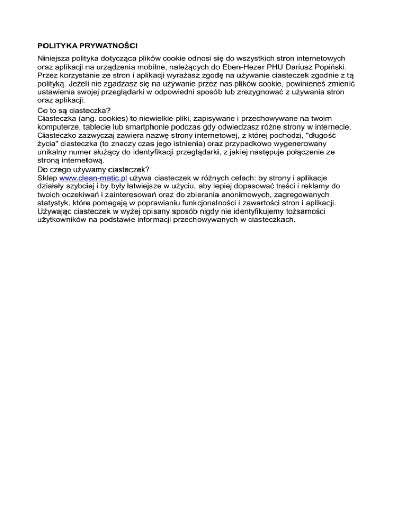 POLITYKA PRYWATNOŚCI Niniejsza polityka dotycząca plików cookie odnosi się do wszystkich stron internetowych oraz aplikacji na urządzenia mobilne, należących do Eben-Hezer PHU Dariusz Popiński. Przez korzystanie ze stron i aplikacji wyrażasz zgodę na używanie ciasteczek zgodnie z tą polityką. Jeżeli nie zgadzasz się na używanie przez nas plików cookie, powinieneś zmienić ustawienia swojej przeglądarki w odpowiedni sposób lub zrezygnować z używania stron oraz aplikacji. Co to są ciasteczka? Ciasteczka (ang. cookies) to niewielkie pliki, zapisywane i przechowywane na twoim komputerze, tablecie lub smartphonie podczas gdy odwiedzasz różne strony w internecie. Ciasteczko zazwyczaj zawiera nazwę strony internetowej, z której pochodzi, "długość życia" ciasteczka (to znaczy czas jego istnienia) oraz przypadkowo wygenerowany unikalny numer służący do identyfikacji przeglądarki, z jakiej następuje połączenie ze stroną internetową. Do czego używamy ciasteczek? Sklep www.clean-matic.pl używa ciasteczek w różnych celach: by strony i aplikacje działały szybciej i by były łatwiejsze w użyciu, aby lepiej dopasować treści i reklamy do twoich oczekiwań i zainteresowań oraz do zbierania anonimowych, zagregowanych statystyk, które pomagają w poprawianiu funkcjonalności i zawartości stron i aplikacji. Używając ciasteczek w wyżej opisany sposób nigdy nie identyfikujemy tożsamości użytkowników na podstawie informacji przechowywanych w ciasteczkach.