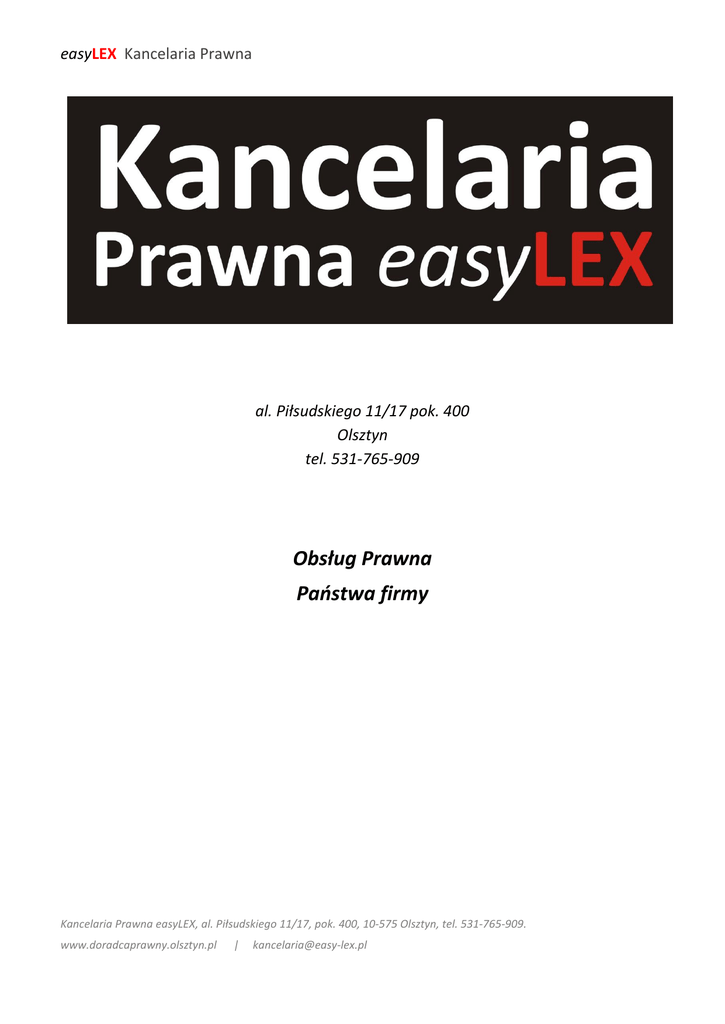 easyLEX Kancelaria Prawna al. Piłsudskiego 11/17 pok. 400 Olsztyn tel. 531-765-909 Obsług Prawna Państwa firmy Kancelaria Prawna easyLEX, al. Piłsudskiego 11/17, pok. 400, 10-575 Olsztyn, tel. 531-765-909. www.doradcaprawny.olsztyn.pl | [email protected] easyLEX Kancelaria Prawna Proponujemy Państwu kompleksową obsługą prawną Państwa firmy. Oferujemy profesjonalną, popartą wieloletnim doświadczeniem pomoc prawną w zakresie prowadzonej przez Państwa działalności gospodarczej, zarówno w codziennym funkcjonowaniu firmy jak i prowadzeniu sporów sądowych czy obsłudze inwestycji. Zakres prowadzonych przez nas w toku obsługi przedsiębiorstw czynności obejmuje w szczególności: konsultacje prawne w bieżącym funkcjonowaniu firmy, zastępstwo procesowe w postępowaniach sądowych oraz administracyjnych, prowadzenie sporów o zapłatę i obsługa egzekucji należności, analizę i doradztwo w zakresie zawieranych przez Państwa w działalności gospodarczej umów oraz w ogólnym zakresie czynności prawnych dokonywanych w związku z prowadzoną działalnością gospodarczą, tworzenie umów cywilnoprawnych, prowadzenie czynności materialno-prawnych w toku realizacji zamówień publicznych, analizę i doradztwo w zakresie spraw pracowniczych, przygotowywanie opinii prawnych w sprawach związanych z prowadzoną działalnością gospodarczą, pomoc w merytorycznej interpretacji przepisów prawa, sporządzanie pism i dokumentów w bieżącej działalności firmy, prowadzenie negocjacji handlowych oraz mediacji gospodarczych Zapraszamy do kontaktu z naszą Kancelarią pod nr tel. 531 765 909 oraz mailowego pod adresem: [email protected]. Przygotujemy propozycję obsługi prawnej dopasowaną do wymagań i potrzeb Państwa biznesu. Z poważaniem, Tomasz Lipka Dyrektor Zarządzający Kancelaria Prawna easyLEX, al. Piłsudskiego 11/17, pok. 400, 10-575 Olsztyn, tel. 531-765-909. www.doradcaprawny.olsztyn.pl | [email protected]