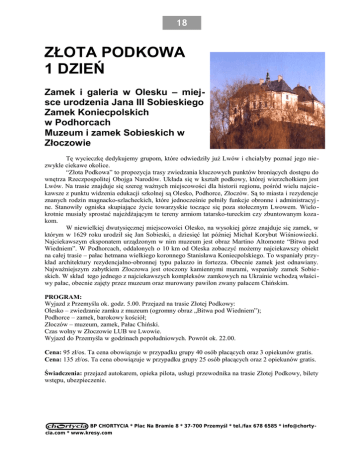 18 ZŁOTA PODKOWA 1 DZIEŃ Zamek i galeria w Olesku – miejsce urodzenia Jana III Sobieskiego Zamek Koniecpolskich w Podhorcach Muzeum i zamek Sobieskich w Złoczowie Tę wycieczkę dedykujemy grupom, które odwiedziły już Lwów i chciałyby poznać jego niezwykle ciekawe okolice. “Złota Podkowa” to propozycja trasy zwiedzania kluczowych punktów broniących dostępu do wnętrza Rzeczpospolitej Obojga Narodów. Układa się w kształt podkowy, której wierzchołkiem jest Lwów. Na trasie znajduje się szereg ważnych miejscowości dla historii regionu, pośród wielu najcie kawsze z punktu widzenia edukacji szkolnej są Olesko, Podhorce, Złoczów. Są to miasta i rezydencje znanych rodzin magnacko-szlacheckich, które jednocześnie pełniły funkcje obronne i administracyj ne. Stanowiły ogniska skupiające życie towarzyskie toczące się poza stołecznym Lwowem. Wielo krotnie musiały sprostać najeżdżającym te tereny armiom tatarsko-tureckim czy zbuntowanym kozakom. W niewielkiej dwutysięcznej miejscowości Olesko, na wysokiej górze znajduje się zamek, w którym w 1629 roku urodził się Jan Sobieski, a dziesięć lat później Michał Korybut Wiśniowiecki. Najciekawszym eksponatem urządzonym w nim muzeum jest obraz Martino Altomonte “Bitwa pod Wiedniem”. W Podhorcach, oddalonych o 10 km od Oleska zobaczyć możemy najciekawszy obiekt na całej trasie – pałac hetmana wielkiego koronnego Stanisława Koniecpolskiego. To wspaniały przykład architektury rezydencjalno-obronnej typu palazzo in fortezza. Obecnie zamek jest odnawiany. Najważniejszym zabytkiem Złoczowa jest otoczony kamiennymi murami, wspaniały zamek Sobie skich. W skład tego jednego z najciekawszych kompleksów zamkowych na Ukrainie wchodzą właści wy pałac, obecnie zajęty przez muzeum oraz murowany pawilon zwany pałacem Chińskim. PROGRAM: Wyjazd z Przemyśla ok. godz. 5.00. Przejazd na trasie Złotej Podkowy: Olesko – zwiedzanie zamku z muzeum (ogromny obraz „Bitwa pod Wiedniem”); Podhorce – zamek, barokowy kościół; Złoczów – muzeum, zamek, Pałac Chiński. Czas wolny w Złoczowie LUB we Lwowie. Wyjazd do Przemyśla w godzinach popołudniowych. Powrót ok. 22.00. Cena: 95 zł/os. Ta cena obowiązuje w przypadku grupy 40 osób płacących oraz 3 opiekunów gratis. Cena: 135 zł/os. Ta cena obowiązuje w przypadku grupy 25 osób płacących oraz 2 opiekunów gratis. Świadczenia: przejazd autokarem, opieka pilota, usługi przewodnika na trasie Złotej Podkowy, bilety wstępu, ubezpieczenie. BP CHORTYCIA * Plac Na Bramie 8 * 37-700 Przemyśl * tel./fax 678 6585 * [email protected] * www.kresy.com