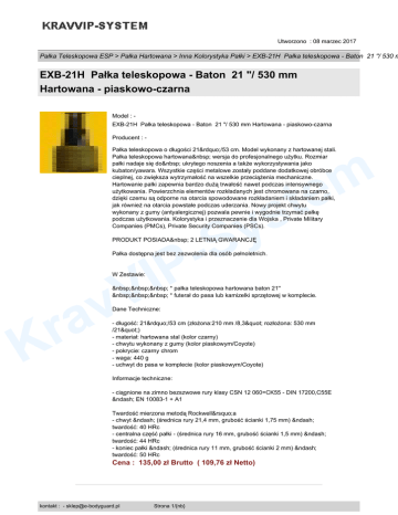 Utworzono : 08 marzec 2017 Pałka Teleskopowa ESP > Pałka Hartowana > Inna Kolorystyka Pałki > EXB-21H Pałka teleskopowa - Baton 21 "/ 530 m EXB-21H Pałka teleskopowa - Baton 21 "/ 530 mm Hartowana - piaskowo-czarna Model : EXB-21H Pałka teleskopowa - Baton 21 "/ 530 mm Hartowana - piaskowo-czarna Producent : Pałka teleskopowa o długości 21”/53 cm. Model wykonany z hartowanej stali. Pałka teleskopowa hartowana wersja do profesjonalnego użytku. Rozmiar pałki nadaje się do ukrytego noszenia a także wykorzystywania jako kubaton/yawara. Wszystkie części metalowe zostały poddane dodatkowej obróbce cieplnej, co zwiększa wytrzymałość na wszelkie przeciążenia mechaniczne. Hartowanie pałki zapewnia bardzo dużą trwałość nawet podczas intensywnego użytkowania. Powierzchnia elementów rozkładanych jest chromowana na czarno, dzięki czemu są odporne na otarcia spowodowane rozkładaniem i składaniem pałki, jak również na otarcia powstałe podczas uderzania. Nowy projekt chwytu wykonany z gumy (antyalergicznej) pozwala pewnie i wygodnie trzymać pałkę podczas użytkowania. Kolorystyka i przeznaczenie dla Wojska , Private Military Companies (PMCs), Private Security Companies (PSCs). m te s y S IP PRODUKT POSIADA 2 LETNIĄ GWARANCJĘ Pałka dostępna jest bez zezwolenia dla osób pełnoletnich. V v a r W Zestawie: * pałka teleskopowa hartowana baton 21'' * futerał do pasa lub kamizelki sprzętowej w komplecie. Dane Techniczne: K - długość: 21”/53 cm (złożona:210 mm /8,3" rozłożona: 530 mm /21") - materiał: hartowana stal (kolor czarny) - chwytu wykonany z gumy (kolor piaskowym/Coyote) - pokrycie: czarny chrom - waga: 440 g - uchwyt do pasa w komplecie (kolor piaskowym/Coyote) Informacje techniczne: - ciągnione na zimno bezszwowe rury klasy CSN 12 060=CK55 - DIN 17200,C55E – EN 10083-1 + A1 Twardość mierzona metodą Rockwell’a - chwyt – (średnica rury 21,4 mm, grubość ścianki 1,75 mm) – twardość: 40 HRc - centralna część pałki - (średnica rury 16 mm, grubość ścianki 1,5 mm) – twardość: 44 HRc - koniec pałki – (średnica rury 11 mm, grubość ścianki 2 mm) – twardość: 50 HRc Cena : 135,00 zł Brutto ( 109,76 zł Netto) kontakt : - [email protected] Strona 1/{nb} Utworzono : 08 marzec 2017 Pałka Teleskopowa ESP > Pałka Hartowana > Inna Kolorystyka Pałki > EXB-21H Pałka teleskopowa - Baton 21 "/ 530 m EXB-21H Pałka teleskopowa - Baton 21 "/ 530 mm Hartowana - piaskowo-czarna Dostępność: Produkt dostępny w naszym sklepie od 20 wrzesień 2010 s y m te V v a r S IP K kontakt : - [email protected] Strona 2/{nb}