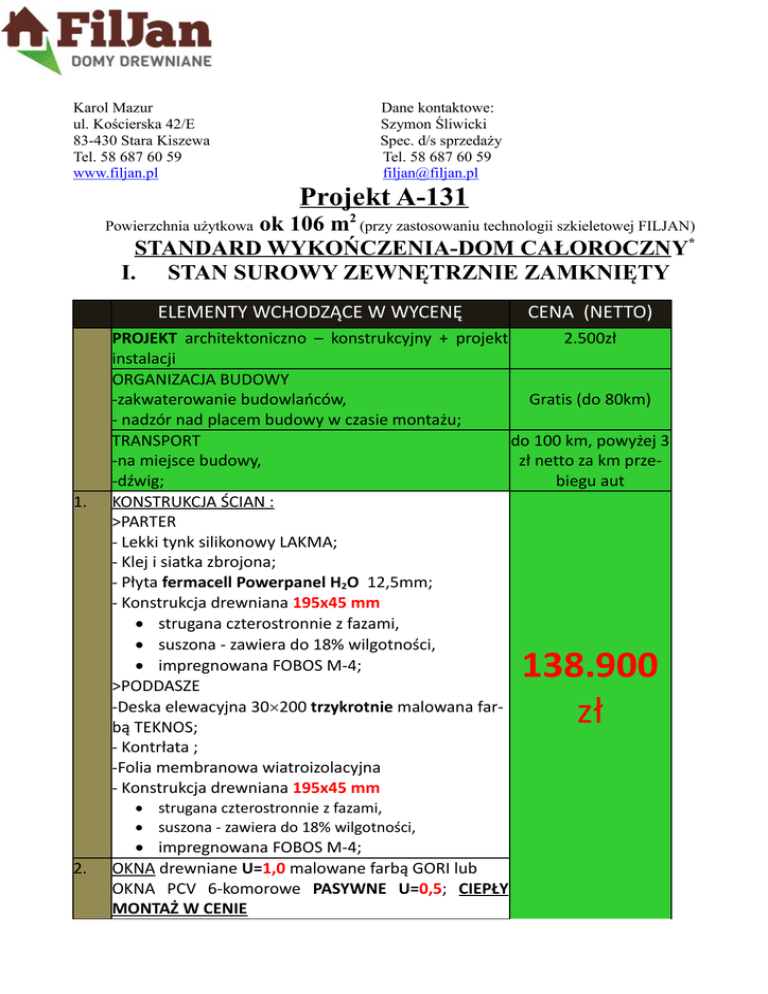 Karol Mazur ul. Kościerska 42/E 83-430 Stara Kiszewa Tel. 58 687 60 59 www.filjan.pl Dane kontaktowe: Szymon Śliwicki Spec. d/s sprzedaży Tel. 58 687 60 59 [email protected] Projekt A-131 ok 106 m2 (przy zastosowaniu technologii szkieletowej FILJAN) STANDARD WYKOŃCZENIA-DOM CAŁOROCZNY* I. STAN SUROWY ZEWNĘTRZNIE ZAMKNIĘTY Powierzchnia użytkowa ELEMENTY WCHODZĄCE W WYCENĘ 1. CENA (NETTO) PROJEKT architektoniczno – konstrukcyjny + projekt 2.500zł instalacji ORGANIZACJA BUDOWY -zakwaterowanie budowlańców, Gratis (do 80km) - nadzór nad placem budowy w czasie montażu; TRANSPORT do 100 km, powyżej 3 -na miejsce budowy, zł netto za km prze-dźwig; biegu aut KONSTRUKCJA ŚCIAN : >PARTER - Lekki tynk silikonowy LAKMA; - Klej i siatka zbrojona; - Płyta fermacell Powerpanel H2O 12,5mm; - Konstrukcja drewniana 195x45 mm strugana czterostronnie z fazami, suszona - zawiera do 18% wilgotności, impregnowana FOBOS M-4; >PODDASZE -Deska elewacyjna 30200 trzykrotnie malowana farbą TEKNOS; - Kontrłata ; -Folia membranowa wiatroizolacyjna - Konstrukcja drewniana 195x45 mm 138.900 zł strugana czterostronnie z fazami, suszona - zawiera do 18% wilgotności, 2. impregnowana FOBOS M-4; OKNA drewniane U=1,0 malowane farbą GORI lub OKNA PCV 6-komorowe PASYWNE U=0,5; CIEPŁY MONTAŻ W CENIE 3. 4. 5. 6. DACH: -Folia membranowa wiatroizolacyjna; - Krokwie 180X60 strugane czterostronnie z fazami, suszone - zawiera do 18% wilgotności, impregnowane FOBOS M-4; STROP: - Deska stropopodłogowa 28mm; - Belki stropowe 180X80; - Podciąg 250X150; KONSTRUKCJA ŚCIAN DZIAŁOWYCH 10050; DRZWI TARASOWE DREWNIANE/PCV (jeśli przesuwne HS +3.000zł) 7. 8. 9. 10. 11. DRZWI DREWNIANE ZEWNĘTRZNE ocieplane; SCHODY sosnowe, policzkowe (bez balustrad); PRZESZKLONY WYKUSZ; LUKARNA dachowa; TARAS OGRODOWY częściowo zadaszony, z balustradą drewnianą; DODATKI 1. 3. POKRYCIE DACHOWE z ORYNNOWANIEM RAIKO premium do wyboru : -Blachodachówka PRUSZYŃSKI ; -Dachówka ceramiczna KORAMIC ALEGRA 9; -Ahi roofing; -Gont bitumiczny(z deskowaniem); KOMIN : 1 kanał dymny+1 kanał wentylacyjny (z montażem i wykończeniem ponad dach) TARAS frontowy w desce tarasowej (podcień) 4. FUNDAMENTY z wykopami; 18.900 zł 5. 6. OKNO DACHOWE 78x118cm; SCHODY zmiana sosny na : Jesion, dąb(bez balustrad) 1.500zł/szt. 2.100zł 2. 14.500 zł 19.500 zł 25.900 zł 14.500 zł 4.200 zł 2.900zł I. STAN DEWELOPERSKI ELEMENTY WCHODZĄCE W WYCENĘ 1. 2. 3. 4. 5. 6. ŚCIANY ZEWNĘTRZNE: - Wełna mineralna PAROC 25cm; - Stelaż metalowy 5cm; - Folia paroizolacyjna ALU STROTEX; -Płyta kartonowo - gipsowa szpachlowana i malowana na biało LUB -Boazeria nie lakierowana; DACH: - Wełna mineralna PAROC 30cm; - Stelaż metalowy 10cm; - Folia paroizolacyjna ALU STROTEX; -Płyta kartonowo - gipsowa szpachlowana i malowana na biało LUB -Boazeria nie lakierowana; ŚCIANY WEWNĘTRZNE: - Wełna dźwiękochłonna URSA 10cm; - Folia paroizolacyjna (dwustronnie); -Płyta kartonowo - gipsowa szpachlowana i malowana na biało LUB -Boazeria nie lakierowana; STROP – PODŁOGA PŁYWAJĄCA : - Folia paroizolacyjna; - Wełna mineralna twarda (stropowa); - Płyta fermacell jastrych lub wylewka 5cm; PARAPETY WEWNĘTRZNE drewniane INSTALACJE: -Instalacja elektryczna(27 punktów gniazdek, 27 punktów świetlnych, 1 gniazdo siłowe, 1 rozdzielnia) 7. 8. -Instalacja wodna i kanalizacyjna wg. projektu; -Instalacja grzewcza (bez pieca, grzejników/instalacji podłogowej) WYLEWKA na parterze – jeśli fundamenty są wykonywane przez naszą firmę ; SCHODY strychowe rozkładane na poddasze nieużytkowe CENA (NETTO) + 79.800 zł DODATKI 1. 2. 3. 4. DODATKOWY PUNKT ELEKTRYCZNY; 60 zł DODATKOWY PUNKT SANITARNY; 315 zł DODATKOWE DRZWI; 1.300 zł PUNKT instalacji grzewczej (grzejnik dwupanelowy lub 530 zł instalacja podłogowa) 5. KOMINEK wentylacyjny PCV 360zł/szt. *STANDARD WYKOŃCZENIA – przedstawiona oferta ma charakter informacyjny, powyższe dane mogą się różnić w zależności od wybranego modelu oraz w związku z czasowymi promocjami. Podane ceny są w wartościach netto, ponieważ do określenia należnego vat’u, potrzebna jest decyzja o warunkach zabudowy lub wypis, wyrys z miejscowego planu zagospodarowania przestrzennego(VAT 8% dla działki budowlanej lub letniskowej ; 23% dla działki rekreacyjnej) W koszt fundamentów nie są wliczone ewentualne prace ziemne : wymiana ziemi(jeśli jest czarnoziem, korzenie, gruz etc.), wyrównanie terenu.