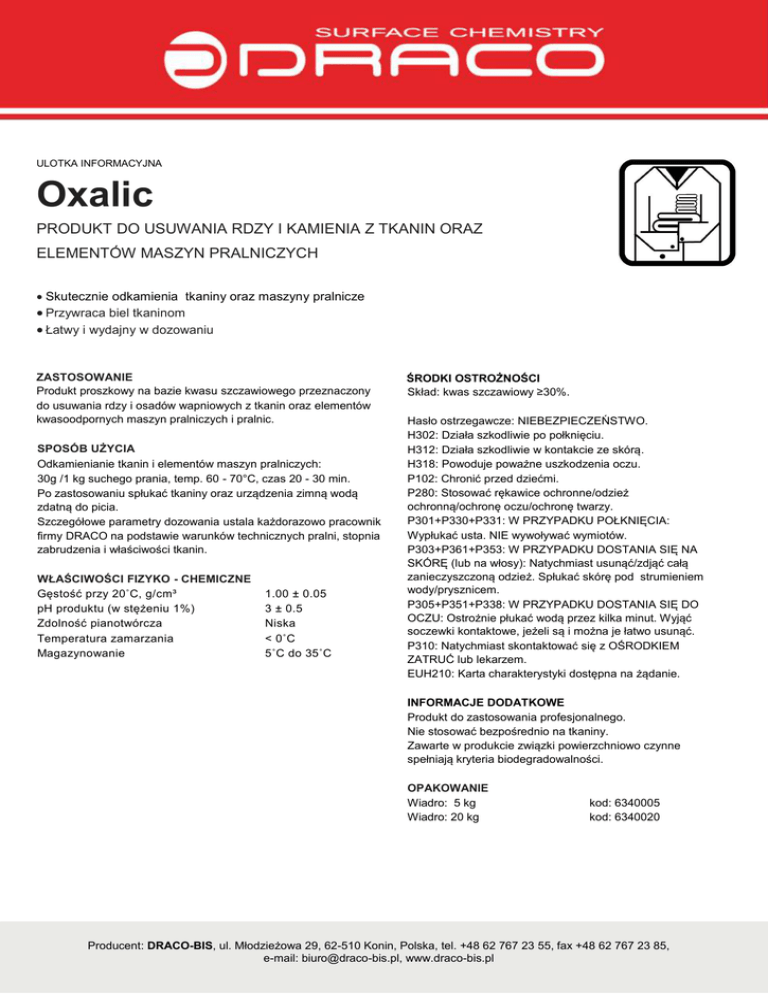 ULOTKA INFORMACYJNA Oxalic PRODUKT DO USUWANIA RDZY I KAMIENIA Z TKANIN ORAZ ELEMENTÓW MASZYN PRALNICZYCH Skutecznie odkamienia tkaniny oraz maszyny pralnicze Przywraca biel tkaninom Łatwy i wydajny w dozowaniu ZASTOSOWANIE Produkt proszkowy na bazie kwasu szczawiowego przeznaczony do usuwania rdzy i osadów wapniowych z tkanin oraz elementów kwasoodpornych maszyn pralniczych i pralnic. SPOSÓB UŻYCIA Odkamienianie tkanin i elementów maszyn pralniczych: 30g /1 kg suchego prania, temp. 60 - 70°C, czas 20 - 30 min. Po zastosowaniu spłukać tkaniny oraz urządzenia zimną wodą zdatną do picia. Szczegółowe parametry dozowania ustala każdorazowo pracownik firmy DRACO na podstawie warunków technicznych pralni, stopnia zabrudzenia i właściwości tkanin. WŁAŚCIWOŚCI FIZYKO - CHEMICZNE Gęstość przy 20˚C, g/cm³ pH produktu (w stężeniu 1%) Zdolność pianotwórcza Temperatura zamarzania Magazynowanie 1.00 ± 0.05 3 ± 0.5 Niska < 0˚C 5˚C do 35˚C ŚRODKI OSTROŻNOŚCI Skład: kwas szczawiowy ≥30%. Hasło ostrzegawcze: NIEBEZPIECZEŃSTWO. H302: Działa szkodliwie po połknięciu. H312: Działa szkodliwie w kontakcie ze skórą. H318: Powoduje poważne uszkodzenia oczu. P102: Chronić przed dziećmi. P280: Stosować rękawice ochronne/odzież ochronną/ochronę oczu/ochronę twarzy. P301+P330+P331: W PRZYPADKU POŁKNIĘCIA: Wypłukać usta. NIE wywoływać wymiotów. P303+P361+P353: W PRZYPADKU DOSTANIA SIĘ NA SKÓRĘ (lub na włosy): Natychmiast usunąć/zdjąć całą zanieczyszczoną odzież. Spłukać skórę pod strumieniem wody/prysznicem. P305+P351+P338: W PRZYPADKU DOSTANIA SIĘ DO OCZU: Ostrożnie płukać wodą przez kilka minut. Wyjąć soczewki kontaktowe, jeżeli są i można je łatwo usunąć. P310: Natychmiast skontaktować się z OŚRODKIEM ZATRUĆ lub lekarzem. EUH210: Karta charakterystyki dostępna na żądanie. INFORMACJE DODATKOWE Produkt do zastosowania profesjonalnego. Nie stosować bezpośrednio na tkaniny. Zawarte w produkcie związki powierzchniowo czynne spełniają kryteria biodegradowalności. OPAKOWANIE Wiadro: 5 kg Wiadro: 20 kg kod: 6340005 kod: 6340020 Producent: DRACO-BIS, ul. Młodzieżowa 29, 62-510 Konin, Polska, tel. +48 62 767 23 55, fax +48 62 767 23 85, e-mail: [email protected], www.draco-bis.pl