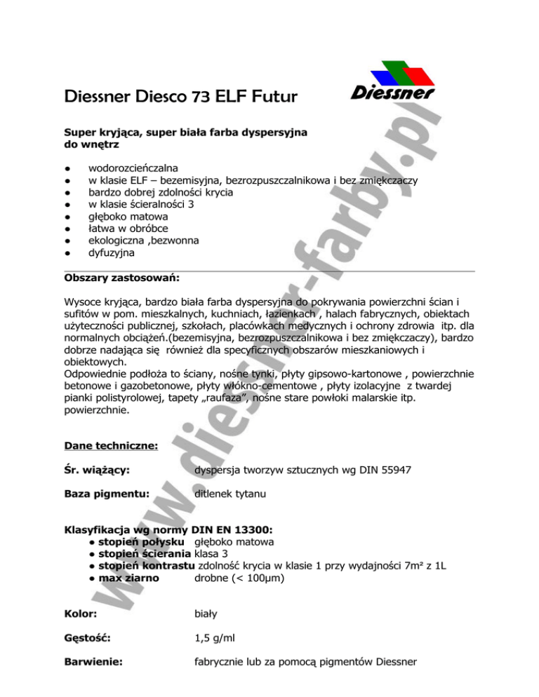 Diessner Diesco 73 ELF Futur Super kryjąca, super biała farba dyspersyjna do wnętrz ● ● ● ● ● ● ● ● wodorozcieńczalna w klasie ELF – bezemisyjna, bezrozpuszczalnikowa i bez zmiękczaczy bardzo dobrej zdolności krycia w klasie ścieralności 3 głęboko matowa łatwa w obróbce ekologiczna ,bezwonna dyfuzyjna Obszary zastosowań: Wysoce kryjąca, bardzo biała farba dyspersyjna do pokrywania powierzchni ścian i sufitów w pom. mieszkalnych, kuchniach, łazienkach , halach fabrycznych, obiektach użyteczności publicznej, szkołach, placówkach medycznych i ochrony zdrowia itp. dla normalnych obciążeń.(bezemisyjna, bezrozpuszczalnikowa i bez zmiękczaczy), bardzo dobrze nadająca się również dla specyficznych obszarów mieszkaniowych i obiektowych. Odpowiednie podłoża to ściany, nośne tynki, płyty gipsowo-kartonowe , powierzchnie betonowe i gazobetonowe, płyty włókno-cementowe , płyty izolacyjne z twardej pianki polistyrolowej, tapety „raufaza”, nośne stare powłoki malarskie itp. powierzchnie. Dane techniczne: Śr. wiążący: dyspersja tworzyw sztucznych wg DIN 55947 Baza pigmentu: ditlenek tytanu Klasyfikacja wg normy DIN EN 13300: ● stopień połysku głęboko matowa ● stopień ścierania klasa 3 ● stopień kontrastu zdolność krycia w klasie 1 przy wydajności 7m² z 1L ● max ziarno drobne (< 100µm) Kolor: biały Gęstość: 1,5 g/ml Barwienie: fabrycznie lub za pomocą pigmentów Diessner Vollton- u. Abtönfarben, może prowadzić do utraty własności ELF Wielkość opakowań: wiadra 5L i 12,5 L Składowanie: w chłodzie ale nie przemrażać Zużycie: w zależności od struktury i chłonności podłoża 130-150 ml/m². Zużycie obiektowe sprawdzić próbnie na budowie. Kod produktu Farby i lakiery: M-DF 01 Oznaczenie zagrożenia: nie dotyczy Środki bezpieczeństwa: Chronić przed dziećmi .W przypadku kontaktu ze skórą lub oczami natychmiast przemyć obficie wodą.W przypadku użycia natrysku, nie wdychać powstających opar . Zapobiegać przedostaniu się do kanalizacji, zbiorników wody i ziemi . Wszystkie nie malowane miejsca starannie zakrywać . Miejsca odprysków farby natychmiast zmyć z powierzchni wodą . Pozostałe wskazówki: patrz karta bezpieczeństwa produktu. Deklaracja zawartości dyspersja tw. sztucznych , ditlenek tytanu, składników: węglan wapnia, silikaty, woda dodatki, śr. konserwujące Utylizacja: Całkowicie opróżnione pojemniki nadają się utylizacji. Płynne resztki materiału utylizować w miejscach do tego wyznaczonych . Wysuszone resztki materiałowe należy utylizować jako farby lub odpadki domowe. Nr klucza utylizacji AVV NR 080112. Zapobiegać przedostaniu się do kanalizacji, zbiorników wody i ziemi Wytyczne do obróbki: Budowa powłok: obfita, równomierna powłoka malarska , rozcieńczona w razie potrzeby z max. 5% wody wodociągowej Na podłożach kontrastowych , silnie lub nierównochłonnych zaleca się wykonanie uprzednio powłoki wstępnej rozcieńczonej z max. 10% wody. Sposób nanoszenia: pędzlem, rolką(wałkiem) lub poprzez natrysk Airless Natrysk Airless: dysza: 0,021”- 0,026” ciśn. natr.:150-180 bar kąt natrysku: 40-50º Temperatura obróbki/ dolna granica: +5ºC dla podłoża i temp. otoczenia Czas schnięcia: w temp. +23 ºC i przy 50% wilgotności ok. 4 do 6 godzin suche powierzchniowo i gotowe do nanoszenia kolejnej powłoki. Przy zmianie tych parametrów czas schnięcia ulega zmianie. Sposób czyszczenia narzędzi/ agregatów airless: natychmiast po użyciu czyścić wodą Uwagi: podczas malowania większych powierzchni w celu uniknięcia powstawania tzw.”pasów” zaleca się ciągłe malowanie metoda „mokre na mokre”. W przypadku użycia agregatów typu „airless” farbę przed użyciem dobrze rozmieszać lub ew. rozcieńczyć lub zamówić ją w jakości do stosowania w agregatach typu „Airless”. W przypadku ciemnych kolorów mechaniczne obciążenie powierzchni może prowadzić do powstania rys-w przypadku wysokiej obciążalności pow. ścian zaleca się wykonanie wymalowań farbą lateksową Diessner Seidenlatex ELF. Podłoża i ich obróbka: Podłoża muszą być nośne, suche, wolne od zanieczyszczeń, wykwitów, przebarwień, wolne od osadów grzybów, od spieków ,nie mogą wykazywać zjawisk kredowania i odspajania substancji. Istniejące stare powłoki należ sprawdzić pod kątem zastosowania oraz zdolności sczepnych i nośnych .W przypadku czyszczenia stosować się do odpowiednich przepisów. Zalecamy wykonanie przed malowaniem powierzchni próbnych i skontrolowanie przyczepności oraz charakteru tak powstałej powierzchni. Przed użyciem zapoznać się z informacja techniczną oraz poniższymi zasadami gruntowania firmy Diessner. Tynki wapienne lub tynki zawierające cement z gr. zapraw CSII, CSIII, CSIV wg DIN EN 998-1(gr. zapraw PII i PIII wg DIN V 18550) Miejsca ubytków muszą być wysuszone i dobrze związane z podłożem. Miejsca te należy fluatować i następnie zmyć wodą. Zwrócić uwagę aby nałożyć fluat na powierzchnię w miejsce ubytku (obszar brzegowy) i zmyć czysta wodą. W przypadku większych ubytków fluatować cało powierzchniowo i zmyć następnie wodą . Tynki z szorstka warstwa wierzchnią oczyścić szczotkami , wzmocnić przez fluatowanie i następnie zmyć czysta wodą. Tynki z warstwą spieków usunąć poprzez potraktowanie ich fluatem lub płynem zmiękczającym a następnie zmyć czystą wodą . W zależności od pory roku i warunków temperaturowych nowe tynki powinny dojrzewać co najmniej 2 do 4 tygodni. Miejsca uzupełnień po ubytkach musza być dobrze wysuszone i związane . Na tynkach porowatych, piaszczących i chłonnych wykonać powłokę gruntującą środkiem DIESSNER Hydrogrund. Na tynkach głęboko porowatych , piaszczących , silnie chłonących powłokę gruntującą wykonać środkiem DIESSNER Acryl Hydrogrund ELF. Zwrócić uwagę na kartę BFS nr 9. Tynki gipsowe i gotowe tynki z
