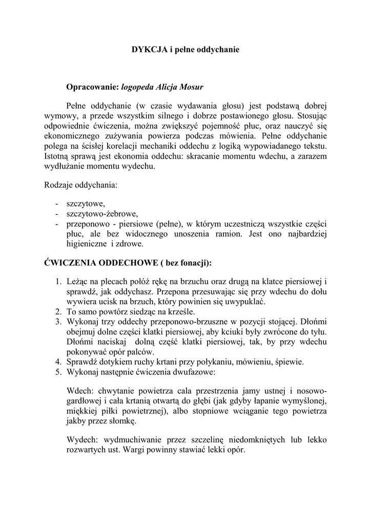 DYKCJA i pełne oddychanie Opracowanie: logopeda Alicja Mosur Pełne oddychanie (w czasie wydawania głosu) jest podstawą dobrej wymowy, a przede wszystkim silnego i dobrze postawionego głosu. Stosując odpowiednie ćwiczenia, można zwiększyć pojemność płuc, oraz nauczyć się ekonomicznego zużywania powierza podczas mówienia. Pełne oddychanie polega na ścisłej korelacji mechaniki oddechu z logiką wypowiadanego tekstu. Istotną sprawą jest ekonomia oddechu: skracanie momentu wdechu, a zarazem wydłużanie momentu wydechu. Rodzaje oddychania: - szczytowe, - szczytowo-żebrowe, - przeponowo - piersiowe (pełne), w którym uczestniczą wszystkie części płuc, ale bez widocznego unoszenia ramion. Jest ono najbardziej higieniczne i zdrowe. ĆWICZENIA ODDECHOWE ( bez fonacji): 1. Leżąc na plecach połóż rękę na brzuchu oraz drugą na klatce piersiowej i sprawdź, jak oddychasz. Przepona przesuwając się przy wdechu do dołu wywiera ucisk na brzuch, który powinien się uwypuklać. 2. To samo powtórz siedząc na krześle. 3. Wykonaj trzy oddechy przeponowo-brzuszne w pozycji stojącej. Dłońmi obejmuj dolne części klatki piersiowej, aby kciuki były zwrócone do tyłu. Dłońmi naciskaj dolną część klatki piersiowej, tak, by przy wdechu pokonywać opór palców. 4. Sprawdź dotykiem ruchy krtani przy połykaniu, mówieniu, śpiewie. 5. Wykonaj następnie ćwiczenia dwufazowe: Wdech: chwytanie powietrza cala przestrzenia jamy ustnej i nosowogardłowej i cała krtanią otwartą do głębi (jak gdyby łapanie wymyślonej, miękkiej piłki powietrznej), albo stopniowe wciąganie tego powietrza jakby przez słomkę. Wydech: wydmuchiwanie przez szczelinę niedomkniętych lub lekko rozwartych ust. Wargi powinny stawiać lekki opór. 6. Oddech całym ciałem. Stoimy w małym rozkroku, w postawie całkowicie rozluźnionej. Skłon swobodny (ręce i głowa zwisają swobodnie w dół ). Jest to pozycja na wydechu. Prostujemy tułów i unosimy ręce w górę nabierając nosem powietrze. W momencie pełnego wdechu znajdujemy się w pozycji wyprostowanej z rękami uniesionymi w górę. 7. Zdmuchiwanie pyłków - Siedzimy na krześle lub stoimy w dowolny sposób. Na określony sygnał zdmuchujemy pyłki z ubrania, rak, ramion, piersi i nóg. Dmuchnięcia są krótkie i niezbyt mocne. 8. Chłodzenie zupy- Ręce ułożone na kształt głębokiego talerza. Dmuchamy ciągłym, długim strumieniem. 9. Jesteśmy balonikiem, piłką, dętką. Wypuszczamy z siebie powietrze (długie sssss...). ZABURZENIA W ODDYCHANIU Częstym zaburzeniem jest oddech płytki, niepełny, z krótka fazą wydechową, co powoduje zwiększenie częstości oddechów. Nieprawidłowe jest także robienie pauz na wdech w połowie frazy. Zakłócenie rytmu oddychania, a także płynności mowy może być spowodowane przez zaburzenia napięcia mięśni. Zaburzenia w oddychaniu występują u jąkających się na skutek skurczów mięśni oddechowych, a przede wszystkim przepony. Nieprawidłowe oddychanie w czasie fonacji obserwuje się także u osób głuchych, zwłaszcza z głuchotą wrodzoną. Na skutek braku kontroli słuchowej mięśnie są zbytnio napięte. Duże nieprawidłowości w oddychaniu występują u dysartryków, tzn. osób mających niedowłady, porażenia i w związku z tym zazwyczaj zwiększone napięcie mięśniowe. Bardzo krotki wydech umożliwia im wypowiedzenie zaledwie paru wyrazów. W powyższych wypadkach ćwiczenia oddechowe powinny być prowadzone w taki sposób, aby ich celem było rozluźnienie mięśni, usuwanie ich napięcia. Celem niżej podanych ćwiczeń jest wyrobienie: a/ oddechu przeponowo-piersiowego. Tego oddychania nie uczy się małych dzieci. Starszym dzieciom można wytłumaczyć działanie przepony i fizjologię oddychania. Oddychania najłatwiej nauczyć się w pozycji leżącej. Ruchy brzucha i klatki piersiowej można kontrolować ręką - Ćwiczący kładzie jedną rękę na brzuchu (w dolnej części klatki piersiowej), a drugą na górnej części klatki piersiowej. Przepona przesuwając się przy wdechu do dołu wywiera nacisk na brzuch, który się uwypukla; przy wydechu przepona wraca do swego położenia poprzedniego, tzn. unosi się, a brzuch opada. - Ćwiczenie wykonujemy kilka razy, wydmuchując powietrze przez usta i wymawiając głoskę [ s ] lub [ f ] . Ręka na brzuchu powinna się unosić, a leżąca na piersiach - poruszać w znacznie mniejszym stopniu. - Należy wykonać kilka oddechów w pozycji stojącej. Ruchy dolnej części klatki piersiowej można kontrolować obejmując dłońmi jej boki tak, aby kciuki były zwrócone do tyłu. Dłonie naciskają dolną część klatki piersiowej; przy wdechu należy pokonać opór palców. - Powyższe ćwiczenia powtarzamy w pozycji siedzącej. Należy siedzieć prosto, ale wygodnie, trzymając ręce na kolanach lub na biodrach. Łączenie oddychania z ruchami rąk i tułowia: - Wdech z jednoczesnym szybkim wzniesieniem rąk do boku, wydech -z powolnym przesuwaniem rak do przodu, aż do zupełnego ich skrzyżowania. - Wdech z jednoczesnym wzniesieniem rak bokiem do góry, a następnie opuszczanie rąk, wydychając powoli powietrze. - Położyć dłonie na karku, przy wdechu przesunąć łokcie silnie do tyłu, przy wydechu łokcie powoli wracają do przodu, aż do ich zetknięcia się. - Ćwiczenia podparcia oddechowego ( nie prowadzimy ich u osób mających wadę wymowy), kiedy w czasie wydechu klatka piersiowa pozostaje w pozycji wdechowej około 6-8 sek., natomiast przepona traci swoje napięcie i powoli unosi się. W ten sposób uzyskujemy także przedłużenia fazy wydechowej. Ciśnienie powietrza znajdującego się poniżej wiązadeł głosowych zwiększa się, wiązadła są dobrze napięte, dzięki czemu glos staje się silniejszy, równiejszy i pełniejszy b/ długiej fazy wydechowej, Aby osiągnąć długą fazę wydechową, która to umiejętność umożliwia wypowiadanie dłuższych fraz, należy wyk