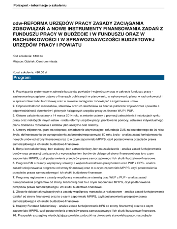 Polexpert - informacje o szkoleniu odw-REFORMA URZĘDÓW PRACY ZASADY ZACIĄGANIA ZOBOWIĄZAŃ A NOWE INSTRUMENTY FINANSOWANIA ZADAŃ Z FUNDUSZU PRACY W BUDŻECIE I W FUNDUSZU ORAZ W RACHUNKOWOŚCI I W SPRAWOZDAWCZOŚCI BUDŻETOWEJ URZĘDÓW PRACY I POWIATU Kod szkolenia: 183414 Miejsce: Gdańsk, Centrum miasta Koszt szkolenia: 490.00 zł Program 1. Rozwiązania systemowe w zakresie budżetów powiatów i województw oraz w zakresie funduszu pracy zastosowanie przepisów ustawy o finansach publicznych w planowaniu, w wykonywaniu planu, w rachunkowości i w sprawozdawczości budżetowej oraz w zakresie zaciągania zobowiązań i angażowania umów. 2. Odpowiedzialność marszałków, starostów oraz ich skarbników za finanse publiczne województwa i powiatu a odpowiedzialność dyrektorów i głównych księgowych urzędów pracy za finanse WUP i PUP. 3. Główne założenia ustawy z 14 marca 2014 roku o zmianie ustawy o promocji zatrudnienia i instytucjach rynku pracy oraz niektórych innych ustaw - istota reformy urzędów pracy, profilowania pomocy, ustalania indywidualnego planu działania i rozliczania z efektów jako szczytne cele reformy. 4. Umowy trójstronne, grant na telepracę, świadczenie aktywizacyjne, refundacja ZUS za bezrobotnego do 30 roku życia, dofinansowania do wynagrodzenia za bezrobotnego powyżej 50 roku życia - analiza zasad funkcjonowania nowych umów od strony finansowej oraz to o czym zapomniało MPIPS, czyli postanowienia przepisów prawa samorządowego i ich skutki budżetowo-finansowe. 5. Bony: bon szkoleniowy, bon stażowy, bon zatrudnieniowy, bon na zasiedzenie - analiza zasad funkcjonowania bonów oraz gwarancji związanych z wprowadzaniem bonów do obiegu od strony finansowej oraz to o czym zapomniało MPIPS, czyli postanowienia przepisów prawa samorządowego i ich skutki budżetowo-finansowe. 6. Program PAI a zasady współpracy starosty z wójtem/burmistrzem/prezydentem oraz PUP z OPS - analiza zasad funkcjonowania programu od strony finansowej oraz to o czym zapomniało MPIPS, czyli postanowienia przepisów prawa samorządowego i ich skutki budżetowo-finansowe. 7. Programy regionalne a zasady współpracy marszałka ze starostą oraz WUP z PUP - analiza zasad funkcjonowania programów od strony finansowej oraz to o czym zapomniało MPIPS, czyli postanowienia przepisów prawa samorządowego i ich skutki budżetowo-finansowe. 8. Zlecanie działań aktywizacyjnych a zasady współpracy marszałka z realizatorem - analiza zasad funkcjonowania działań od strony finansowej oraz to o czym zapomniało MPIPS, czyli postanowienia przepisów prawa samorządowego i ich skutki budżetowo-finansowe. 9. Krajowy Fundusz Szkoleniowy - analiza zasad funkcjonowania KFS od strony finansowej oraz to o czym zapomniało MPIPS, czyli postanowienia przepisów prawa samorządowego i ich skutki budżetowo-finansowe. 10. Przypadek szczególny nieobciążający powiatu: pożyczki na utworzenie stanowiska pracy, na podjęcie Polexpert - informacje o szkoleniu działalności gospodarczej, usługi doradcze i szkoleniowe - rola BGK i innych instytucji finansowych oraz rola i zadania starosty. 11. Wymogi prawa zamówień publicznych - "szkolny" błąd MPIPS i przykład naruszenia prawa zamówień publicznych w przypadku bonów szkoleniowych i bonu stażowego. 12. Reforma urzędów pracy a nowe zagrożenia dyscypliną finansów publicznych - to o czym zapomniało MPIPS, planując reformę urzędów pracy a co może stanowić naruszenie dyscypliny finansów publicznych w zakresie zobowiązań i budżetu. 13. Wskazanie możliwości zaliczania środków funduszu pracy (KFS) i FGŚP do dochodów budżetowych odpowiednio powiatu lub województwa Prowadzący