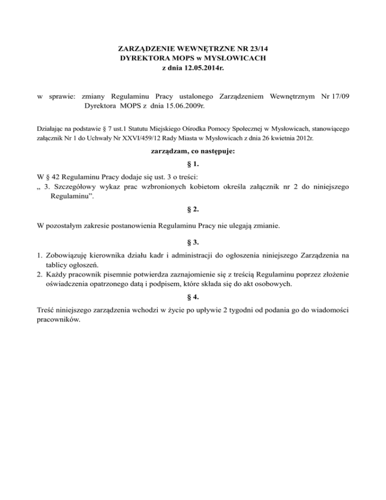 ZARZĄDZENIE WEWNĘTRZNE NR 23/14 DYREKTORA MOPS w MYSŁOWICACH z dnia 12.05.2014r. w sprawie: zmiany Regulaminu Pracy ustalonego Zarządzeniem Wewnętrznym Nr 17/09 Dyrektora MOPS z dnia 15.06.2009r. Działając na podstawie § 7 ust.1 Statutu Miejskiego Ośrodka Pomocy Społecznej w Mysłowicach, stanowiącego załącznik Nr 1 do Uchwały Nr XXVI/459/12 Rady Miasta w Mysłowicach z dnia 26 kwietnia 2012r. zarządzam, co następuje: § 1. W § 42 Regulaminu Pracy dodaje się ust. 3 o treści: „ 3. Szczegółowy wykaz prac wzbronionych kobietom określa załącznik nr 2 do niniejszego Regulaminu”. § 2. W pozostałym zakresie postanowienia Regulaminu Pracy nie ulegają zmianie. § 3. 1. Zobowiązuję kierownika działu kadr i administracji do ogłoszenia niniejszego Zarządzenia na tablicy ogłoszeń. 2. Każdy pracownik pisemnie potwierdza zaznajomienie się z treścią Regulaminu poprzez złożenie oświadczenia opatrzonego datą i podpisem, które składa się do akt osobowych. § 4. Treść niniejszego zarządzenia wchodzi w życie po upływie 2 tygodni od podania go do wiadomości pracowników. Załącznik nr 2 do Regulaminu Pracy wprowadzonego Zarządzeniem Wewnętrznym nr 17/09 Dyrektora MOPS w Mysłowicach z dnia 15.06.2009 r. Wykaz prac wzbronionych kobietom I. Prace związane z wysiłkiem fizycznym. Wszystkie prace, przy których najwyższe wartości obciążenia pracą fizyczną, mierzone wydatkiem energetycznym netto na wykonanie pracy, przekraczają 5000 kJ na zmianę roboczą, a przy pracy dorywczej – 20 kJ /min (1 kJ = 0,24 kcal). II. Prace związane z transportem ciężarów oraz wymuszoną pozycją ciała. Sposób przemieszczania ciężarów a) ręczne podnoszenie i przenoszenie ciężarów: • o ile praca odbywa się stale • o ile praca ma charakter dorywczy b) ręczne przenoszenie ciężarów pod górę (schody, pochylnie): • o ile praca odbywa się stale • o ile praca ma charakter dorywczy c) na taczkach jednokołowych po powierzchni równej, gładkiej o stałej twardości lub po ułożonych deskach Dopuszczalna norma 12 kg 20 kg 8 kg Uwagi Praca dorywcza to praca wykonywana do 4 razy na godzinę w czasie zmiany roboczej. Praca dorywcza to praca wykonywana do 4 razy na godzinę w czasie zmiany roboczej. 15 kg 50 kg d) na 2, 3, 4 - kołowych wózkach poruszanych ręcznie 80 kg e) na 2, 3, 4 - kołowych wózkach poruszanych ręcznie 48 kg Masy ciężarów obejmują masę urządzenia transportowego i dotyczą przewożenia ciężarów po powierzchni równej, twardej i gładkiej o pochyleniu nieprzekraczającym 2 %. Dla kobiet w ciąży lub karmiących piersią do prac szczególnie uciążliwych lub szkodliwych dla zdrowia zalicza się: 1. Wszystkie prace, przy których najwyższe wartości obciążenia pracą fizyczną, mierzone wydatkiem energetycznym netto na wykonanie pracy przekraczają 2900 kJ na zmianę roboczą. 2. Ręczne podnoszenie i przenoszenie ciężarów o masie przekraczającej: a) 3 kg - przy pracy stałej, b) 5 kg - przy pracy dorywczej (do 4 razy na godzinę w czasie zmiany roboczej). 3. Prace w pozycji wymuszonej. 4. Prace w pozycji stojącej łącznie ponad 3 godziny w czasie zmiany roboczej. III. Prace w hałasie. Dla kobiet w ciąży do prac szczególnie uciążliwych lub szkodliwych dla zdrowia zalicza się wszystkie prace w warunkach narażenia na hałas, którego: a) poziom ekspozycji odniesiony do 8-godzinnego dobowego lub do przeciętnego tygodniowego, określonego w Kodeksie pracy, wymiaru czasu pracy przekracza wartość 65 dB; b) szczytowy poziom dźwięku C przekracza wartość 130 dB; c) maksymalny poziom dźwięku A przekracza wartość 110 dB. IV. Praca przy obsłudze monitorów ekranowych. Dla kobiet w ciąży do prac szczególnie uciążliwych lub szkodliwych dla zdrowia zalicza się wszystkie prace przy obsłudze monitorów ekranowych – powyżej 4 godzin na dobę. V. Prace na wysokości. Dla kobiet w ciąży do prac szczególnie uciążliwych lub szkodliwych dla zdrowia zalicza się wszystkie prace na wysokości – poza stałymi galeriami, pomostami, podestami i innymi stałymi podwyższeniami posiadającymi pełne zabezpieczenie przed upadkiem (bez potrzeby stosowania środków ochrony indywidualnej przed upadkiem), oraz wchodzenie i schodzenie po drabinach i klamrach. VI. Prace w narażeniu na działanie szkodliwych substancji chemicznych. Dla kobiet w ciąży lub karmiących piersią do prac szczególnie uciążliwych lub szkodliwych dla zdrowia zalicza się: 1. prace w narażeniu na działanie czynników rakotwórczych i o prawdopodobnym działaniu rakotwórczym, określonych w odrębnych przepisach; 2. prace w narażeniu na niżej wymienione substancje chemiczne niezależnie od ich stężenia w środowisku pracy: - chloropren, - 2-etoksyetanol, - etylenu dwubromek, - 2-metoksyetanol, - ołów i jego związki organiczne i nie organiczne, - styren, - węgla dwusiarczek; 3. prace w narażeniu na działanie rozpuszczalników organicznych, jeżeli ich stężenia w środowisku pracy przekraczają wartości 1/3 najwyższych dopuszczalnych stężeń. VII. Prace w kontakcie ze szkodliwymi czynnikami biologicznymi. Kobietom w ciąży i w okresie karmienia: 1. prace stwarzające ryzyko zakażenia: wirusem zapalenia wątroby typu B, wirusem ospy wietrznej i półpaśca, wirusem różyczki, wirusem HIV, wirusem cytomegalii, pałeczką listeriozy, toksoplazmozą; 2. prace przy obsłudze zwierząt dotkniętych chorobami zakaźnymi i inwazyjnymi.