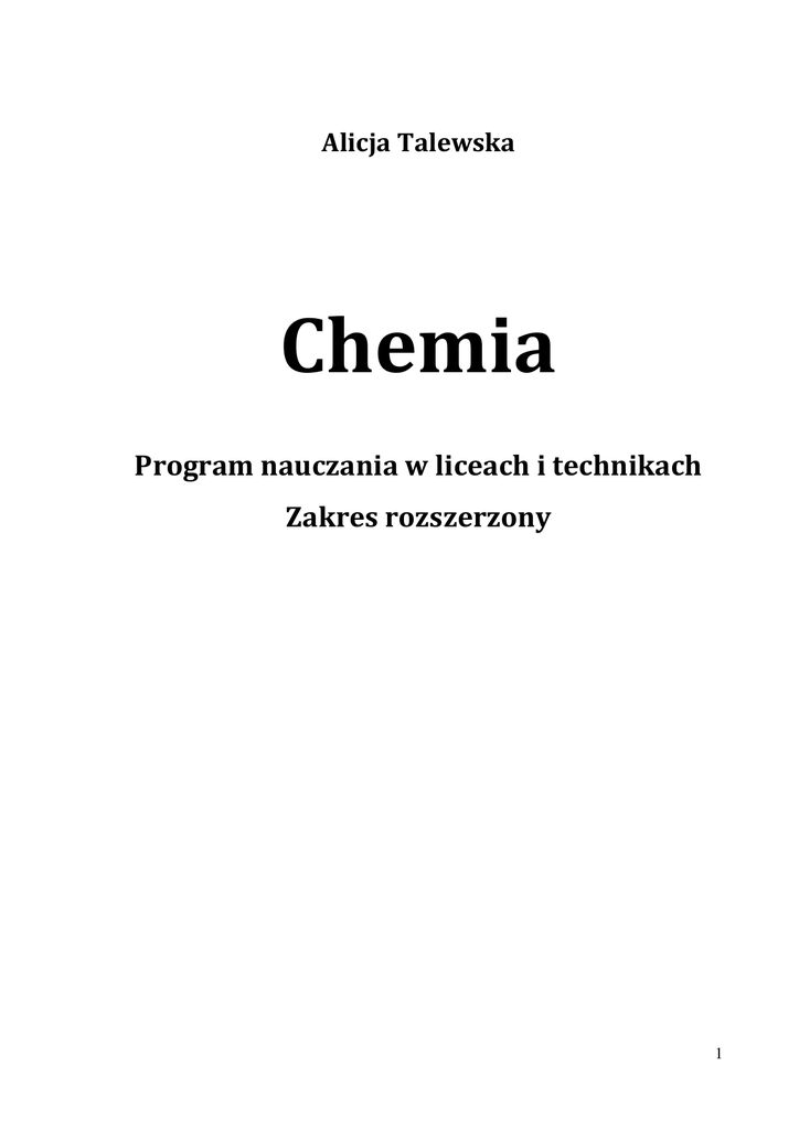 Alicja Talewska Chemia Program nauczania w liceach i technikach Zakres rozszerzony 1 Spis treści Str. 1. Wstęp ............................................................................................................ 3 2. Ogólne cele kształcenia ................................................................................ 4 3. Opis sposobu realizacji szczegółowych celów kształcenia .......................... 5 • Chemia. Fundamenty ............................................................................. 5 • Chemia. Związki organiczne ………………………………………... 18 • Chemia. Pierwiastki i związki nieorganiczne ……………………….. 30 4. Propozycja rozkładu materiału ..................................................................... 38 5. Propozycja sposobów monitorowania rozwoju ucznia ................................. 46 Autor niniejszego programu i wydawca wyrażają zgodę, aby nauczyciel mógł do tego programu wprowadzić dowolne zmiany i tak zmodyfikowaną wersję przedstawić dyrektorowi szkoły do akceptacji. 2 1. Wstęp Zaprezentowany program ukazuje cele, materiał i wymagania, których ramy są zawarte w nowej podstawie programowej kształcenia ogólnego chemii w szkołach ponadgimnazjalnych w zakresie rozszerzonym. Jest on skorelowany z podręcznikiem, którego treści ujęte są w odrębnych modułach pt.: Chemia. Fundamenty, Chemia. Związki organiczne, Chemia. Pierwiastki i związki nieorganiczne. Modułowy charakter ma również zaproponowany program. Jednoznacznie brzmiący tytuł modułu Fundamenty jest wyznacznikiem od czego należy rozpocząć realizację programu, pozostałe treści modułów mogą być wdrażane w dowolnej kolejności. Nadrzędnym celem kształcenia chemicznego w zakresie rozszerzonym jest przygotowanie uczniów do egzaminu maturalnego z tego przedmiotu. Dlatego też częste sprawdzanie wiedzy i umiejętności oraz odpowiednio konstruowane testy nauczycielskie, powinny przybliżać uczniów do sytuacji egzaminacyjnej. Dokonany przez ucznia wybór chemii w zakresie rozszerzonym może być jednoczesną deklaracją i ukierunkowaniem się na odpowiednie studia przyrodnicze. Absolwent szkoły, który wybiera tego typu studia, powinien być wdrożony do samokształcenia, a więc wyposażony w umiejętności uczenia się, gromadzenia, selekcjonowania informacji i ich prezentacji, rozwiązywania problemów, planowania działań oraz umiejętności pracy w grupie. Program ten zapewni realizację celów przedmiotowych jak również kształcenia odpowiednich umiejętności ponadprzedmiotowych pod warunkiem, że nauczyciel będzie aktywizował uczniów, wdrażał do samokształcenia i w umiejętny sposób monitorował ich postępy, jednocześnie motywując i zachęcając do pogłębiania wiedzy oraz rozwijania umiejętności chemicznych. 3 2. Ogólne cele kształcenia Rozumienie podstawowych pojęć, praw i zjawisk chemicznych. Opisywanie właściwości najważniejszych pierwiastków i ich związków. Dostrzeganie zależności między budową substancji a jej właściwościami fizycznymi i chemicznymi. Rozumienie mechanizmów i zjawisk oraz współczesnych osiągnięć w dziedzinie chemii. Planowanie, projektowanie i przeprowadzanie doświadczeń, bezpieczne posługiwanie się sprzętem laboratoryjnym i odczynnikami chemicznymi. Rozumienie znaczenia chemii w rozwoju cywilizacji. Pozyskiwanie informacji z podręcznika i innych źródeł, wykorzystanie technologii informatycznych do pozyskiwania, przetwarzania i prezentowania informacji. Nabycie umiejętności oraz nawyków dbałości o środowisko przyrodnicze i własne zdrowie. Przygotowanie do egzaminu maturalnego i kształcenia na wybranym kierunku studiów przyrodniczych. Wdrażanie do systematycznej pracy oraz do samokształcenia. Kształtowanie nawyków dokonywania samooceny i samokontroli. Zachęcanie uczniów do twórczego i praktycznego myślenia oraz rozwiązywania problemów przez stosowanie aktywizujących metod i technik nauczania. Doskonalenie umiejętności pracy w zespole podczas lekcji, jak również w pracy poza lekcjami. Dostosowanie form i metod pracy do sposobów myślenia i uczenia się uczniów (wzrokowcy, słuchowcy, kinestetycy). 4 3. Opis sposobu realizacji szczegółowych celów kształcenia moduł: Chemia. Fundamenty Rozdział 1. Przewodnik po chemii A. Materiał nauczania Dwa opisy przemian chemicznych. Znaczenie chemii jako nauki przyrodniczej. Makroskopowe i mikroskopowe ujęcie przemian chemicznych, pierwiastka i związku chemicznego. Notacja chemiczna. Pochodzenie symboli pierwiastków, rodzaje wzorów chemicznych, bilansowanie równań reakcji chemicznych, schematy reakcji. Tablica Mendelejewa. Budowa układu okresowego, prawo okresowości w ujęciu makroskopowym, okresowa zmienność właściwości pierwiastków. Masy atomowe i cząsteczkowe. Rodzaje materii. Substancje i mieszaniny w ujęciu makroskopowym i mikroskopowym. Właściwości fizyczne i chemiczne substancji. Różnice pomiędzy związkiem chemicznym a mieszaniną. Przemiany materii. Przemiany fizyczne i chemiczne w ujęciu makroskopowym i mikroskopowym. Typy i grupy reakcji chemicznych. Rodzaje związków chemicznych. Klasyfikacja związków nieorganicznych i organicznych. Budowa, nazewnictwo, otrzymywanie oraz właściwości podstawowych grup związków. B. Procedury osiągania celów Zapoznanie z zakresem wymagań. Informacja o wyposażeniu i regulaminie pracowni chemicznej. Uporządkowanie wiedzy chemicznej uczniów w zakresie podstawowym. Rozpoznawanie preferencji sensorycznych uczniów i stylów uczenia się. Korzystanie z podręcznika, układu okresowego pierwiastków. 5 Doświadczenia i pokazy: Wybrane przykłady reakcji łączenia, rozkładu i wymiany. C. Opis założonych osiągnięć Uczniowie będą umieli: • przedstawiać dwa opisy dowolnej reakcji chemicznej (makroskopowo i mikroskopowo); • interpretować jakościowo i ilościowo wzór sum