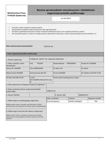 ZŽĐnjŶĞƐƉƌĂǁŽnjĚĂŶŝĞŵĞƌLJƚŽƌLJĐnjŶĞnjĚnjŝĂųĂůŶŽƑĐŝ ŽƌŐĂŶŝnjĂĐũŝƉŽǏLJƚŬƵƉƵďůŝĐnjŶĞŐŽ Ministerstwo Pracy ŝWŽůŝƚLJŬŝ^ƉŽųĞĐnjŶĞũ za rok 2013 • • • • &ŽƌŵƵůĂƌnjŶĂůĞǏLJǁLJƉĞųŶŝđǁũħnjLJŬƵƉŽůƐŬŝŵ͖ ^ƉƌĂǁŽnjĚĂǁĐĂǁLJƉĞųŶŝĂƚLJůŬŽƉƌnjĞnjŶĂĐnjŽŶĞĚůĂŶŝĞŐŽďŝĂųĞƉŽůĂ͖ tƚƌĂŬĐŝĞǁLJƉĞųŶŝĂŶŝĂĨŽƌŵƵůĂƌnjĂŝƐƚŶŝĞũĞŵŽǏůŝǁŽƑđĚŽĚĂǁĂŶŝĂǁŝĞƌƐnjLJŽƌĂnjnjĂǁŝũĂŶŝĂƚĞŬƐƚſǁǁƉŽůĂĐŚ͖ tĞǁƐnjLJƐƚŬŝĐŚƉŽůĂĐŚ͕ǁŬƚſƌLJĐŚŶŝĞďħĚČǁƉŝƐĂŶĞŽĚƉŽǁŝĞĚŶŝĞŝŶĨŽƌŵĂĐũĞ͕ŶĂůĞǏLJǁƐƚĂǁŝđƉŽũĞĚLJŶĐnjLJnjŶĂŬŵLJƑůŶŝŬĂ (--–). Data zamieszczenia sprawozdania 2014-05-28 /͘ĂŶĞŽƌŐĂŶŝnjĂĐũŝƉŽǏLJƚŬƵƉƵďůŝĐnjŶĞŐŽ 1. Nazwa organizacji FUNDACJA "SERCE" IM. JANUSZA KORCZAKA 2. Adres siedziby i dane kontaktowe Kraj 'ŵŝŶĂD͘'F^< Ulica ABRAHAMA Nr domu 56 Nr lokalu DŝĞũƐĐŽǁŽƑđ'F^< Kod pocztowy 80-307 WŽĐnjƚĂ'F^< Nr telefonu 58-550-73-94 Nr faksu 58-550-73-94 E-mail Strona www fundacjaserce.org.pl [email protected]. pl POLSKA Województwo POMORSKIE WŽǁŝĂƚD͘'F^< ϯ͘ĂƚĂƌĞũĞƐƚƌĂĐũŝǁ<ƌĂũŽǁLJŵZĞũĞƐƚƌnjĞ^ČĚŽǁLJŵ ϰ͘ĂƚĂƵnjLJƐŬĂŶŝĂƐƚĂƚƵƐƵŽƌŐĂŶŝnjĂĐũŝƉŽǏLJƚŬƵ publicznego 5. Numer REGON ϳ͘^ŬųĂĚŽƌŐĂŶƵnjĂƌnjČĚnjĂũČĐĞŐŽŽƌŐĂŶŝnjĂĐũŝ 2008-03-31 6. Numer KRS 0000301475 /ŵŝħŝŶĂnjǁŝƐŬŽ Funkcja Anna Rozalewicz WZ^Zh Wpisany do KRS TAK ;EĂůĞǏLJǁƉŝƐĂđŝŵŝŽŶĂ͕ŶĂnjǁŝƐŬĂŽƌĂnjŝŶĨŽƌŵĂĐũĞŽĨƵŶŬĐũŝ ƉĞųŶŝŽŶĞũƉƌnjĞnjƉŽƐnjĐnjĞŐſůŶLJĐŚĐnjųŽŶŬſǁŽƌŐĂŶƵnjĂƌnjČĚnjĂũČĐĞŐŽͿ ϴ͘^ŬųĂĚŽƌŐĂŶƵŬŽŶƚƌŽůŝůƵďŶĂĚnjŽƌƵŽƌŐĂŶŝnjĂĐũŝ ;EĂůĞǏLJǁƉŝƐĂđŝŵŝŽŶĂ͕ŶĂnjǁŝƐŬĂŽƌĂnjŝŶĨŽƌŵĂĐũĞŽĨƵŶŬĐũŝ ƉĞųŶŝŽŶĞũƉƌnjĞnjƉŽƐnjĐnjĞŐſůŶLJĐŚĐnjųŽŶŬſǁŽƌŐĂŶƵŬŽŶƚƌŽůŝůƵď nadzoru) Druk: MPiPS 1 9. Cele statutowe organizacji ;EĂůĞǏLJŽƉŝƐĂđĐĞůĞŶĂƉŽĚƐƚĂǁŝĞƐƚĂƚƵƚƵŽƌŐĂŶŝnjĂĐũŝͿ /ŵŝħŝŶĂnjǁŝƐŬŽ Funkcja Wpisany do KRS TADEUSZ KULESZA WZtKE/z RADY FUNDACJI TAK URSZULA BURTOWICZKULESZA BKE<Zz FUNDACJI TAK hZ^h>K< BKE<Zz FUNDACJI TAK PIOTR DZIK BKE<Zz FUNDACJI TAK 'ZzE<h:^t^< BKE<Zz FUNDACJI TAK D/ZK^BtWZ</ BKE<Zz FUNDACJI TAK HENRYK SKRZYPKOWSKI BKE<Zz FUNDACJI TAK :K>Ed/B<K BKE<Zz FUNDACJI TAK CELEM FUNDACJI JEST OCHRONA ZDROWIA , EDUKACJA , OPIEKA I WKDK^WKBE>///ZK/Et^'M>EK_/ t/Ez,KDD/D͘:͘<KZ<Z'/KE>EW>Mt< KW/<hFKʹdZWhdzEt'F^<hͲK>/t/ FUNDACJA REALIZUJE SWOJE CELE MIN: POPRZEZ: ͻWKDK>//%_/KtK>hB<Kt//WKt/KEz, KW/</ZK/MttB^Ez, 10. Sposób realizacji celów statutowych organizacji ͻhWKt^,E/E////ZK/EE:KW/</^d%W:/KWz:E:͕ ͻZ,/>/d:/WKDK>,KZz,/E/WBEK^WZtEz,// ;EĂůĞǏLJŽƉŝƐĂđƐƉŽƐſďƌĞĂůŝnjĂĐũŝĐĞůſǁƐƚĂƚƵƚŽǁLJĐŚŽƌŐĂŶŝnjĂĐũŝŶĂ WKZhKEz,WZtB^Ez,ZK/MtKZZK/EKE/^</D STATUSIE MATERAIALNYM podstawie statutu organizacji) • ININICJONOWANIE I ROZWIJANIE SPECJALISTYCZNYCH FORM POMOCY >//E/WBEK^WZtEz, ͻ/E/:KEKtE//KZ'E/KtE/<:/D:z,E>h /ZE/_ZK<Mt&/EE^Ktz,EZ&hE:/͕WZ WSZYSTKIM TAKICH JAK WYSTAWY, KONCERTY, AUKCJE I ZBIÓRKI ͻt^WMBWZtBD/^DKZKtzD/͕ZKtzD// KZ'E/:D/WKZKtzD/KZh>E/D///E^dzdh:D/ t<Z^/tzD/E/KEzDt>,//BE/,&hE:/ //͘ŚĂƌĂŬƚĞƌLJƐƚLJŬĂĚnjŝĂųĂůŶŽƑĐŝŽƌŐĂŶŝnjĂĐũŝƉŽǏLJƚŬƵƉƵďůŝĐnjŶĞŐŽǁŽŬƌĞƐŝĞƐƉƌĂǁŽnjĚĂǁĐnjLJŵ ϭ͘KƉŝƐĚnjŝĂųĂůŶŽƑĐŝƉŽǏLJƚŬƵƉƵďůŝĐnjŶĞŐŽ Druk: MPiPS 2 ϭ͘ϭ͘KƉŝƐŐųſǁŶLJĐŚ ĚnjŝĂųĂŷƉŽĚũħƚLJĐŚ ƉƌnjĞnjŽƌŐĂŶŝnjĂĐũħ 1͘t>hdzD&hE:zBt^WMBKZ'E/dKZD&Z///DKtz,>//KDh/D͘:͘ <KZ<Z'/KE>E:W>Mt</KW/<hFKͲdZWhdzE:t'F^<h͘K^dB KZ'E/KtEz><ZEtBKtz͕tz:_/K</E͕D͛KE>͕K'ZKh'/Z/tͲ LOOP’S WORLD. 2͘tDZh//h^dE/zBzt<^h^</D:ZDZ<ht/><EKEzD͕E<dMZzD KzBK^/%D>KtE/W/^E<tZDZ^B<D/tK:tMdtWKDKZ^</'K͘ 3͘K<:/_t/dt/><EKEz,&hE:WZz'KdKtBZKEhWKD/E<//<K^ ^BKzz>45//KDh/D͘:<KZ<ZWKdt'F^<h͘ 4͘KDZKZt&hE:Z>/KtBWZK:<dͣ'KE/DZE/͘͟WZK:<d <BBtzZMtEztE/^E^h<z:Ez,//^W:>EzD/WKdZD/WKWZ KZ'E/:%:%dZWhdzEz,>//,KZz,/E/WBEK^WZtEz, WKt/KEz,KW/</ZK/Mt͕WZzt:z,tKDh/D͘:͘<KZ<ZWKdt'F^<h͘ WZKtKEzB/Ezt/h>EdZW/>K'KWzE͕/Ezt/h>E:%/ ZddZW///ZzdD/</͕d<,/WKdZW//K'KdZW/͘tWZK:</t/%BKh/B20-RO DZIECI. 5͘tD:hKzB^/%t'>Z//^dh</tZztE/<tZE/^WZ//KDh/D͘:͘ <KZ<ZWKd͘//dtKZzBz^tK:Zz/BWK^Z>//:/WZK:<dhͣ'KE/ MARZENIA”. 6͘K<:/E//<&hE:tZWK>^<&/>,ZDKE/<DZ>E^KWKdzB t^WMBKZ'E/dKZD<KEZdh>//KDh/D͘:͘<KZ<ZWKdt'F^<h͘ 7͘t^/t<:/&hE:zBt^WMBKZ'E/dKZDtzWKzE<h>dE/'K>22 //KDh/D͘:͘<KZ<ZWKdt'F^<h͘//WZztBzEKZ'E/KtEzD WYPOCZYNKU W OSTRZYCACH I W ZAKOPANYM. 8͘K>/WK^/ZWE/&hE:Z>/KtBWZK:<dͣ^BKEE/Ed'Z:͘͟tZD, WZK:<dht>/WhK^dBKZ'E/KtEz:EKE/Ktztz:/Ed'Zz:Ez>// KDh/D͘:͘<KZ<ZWKd͕ZK/E^d%Wz,/WZz:E/KEz,K<D//WZz'Kz͘ ttzWZt/h/Bt/%BK100K^M͘t^/ZWE/htZD,Z>/:/WZK:<dhK^dB KZ'E/KtEz&^dzE/Ed'Zz:Ez>//KDh/D:͘<KZ<͕ZK/E^d%Wz, /WZz:E/KEz,͕;100 OSÓB). 9͘KZtK'ZhE/&hE:Z>/KtB<K>:EzWZK:<dͣd%KtzWZ^K>͘͟t ZD,WZK:<dhWZKtKEzB/Ezt/h>EdZW/>K'KWzE>6 DZIECI, /Ezt/h>EdZW/>,BKWhdzDD/,BKW,KZ'ZhWKt:%/ RYTMIKI DLA 30 DZIECI. 10͘t'ZhE/h&hE:KZ'E/KtB<KEZd,ZzddztEztZKDD/D:͘ <KZ<ZWKd͕E<dMZzD'ZBWK>^<&/>,ZDKE/<DZ>E^KWKdWKzZ<: WEZ/>>ht/<͘K,M<KEZdhtBK_/K^dBWZEKEzE<hW hZF/^WZ%dhZ,/>/dz:E'KKZ^WZ%dhKdZW//^/͘ 11͘&hE:<hW/B0RTEZY DLA DZIECI Z DOMU IM. J. KORCZAKA ORAZ SPECJALISTYCZNY FOTELIK REHABILITACYJNY. ŶĂũďůŝǏƐnjĞƐČƐŝĞĚnjƚǁŽ;ŽƐŝĞĚůĞ͕ĚnjŝĞůŶŝĐĂ͕ƐŽųĞĐƚǁŽ͕ǁŝĞƑ͕ƉƌnjLJƐŝſųĞŬͿ ϭ͘Ϯ͘ĂƐŝħŐƚĞƌLJƚŽƌŝĂůŶLJƉƌŽǁĂĚnjŽŶĞũƉƌnjĞnj ŽƌŐĂŶŝnjĂĐũħĚnjŝĂųĂůŶŽƑĐŝƉŽǏLJƚŬƵƉƵďůŝĐnjŶĞŐŽ ;EĂůĞǏLJǁƐŬĂnjĂđũĞĚŶČůƵďǁŝħĐĞũƉŽnjLJĐũŝͿ gmina województwo kilka gmin kilka województw powiat ĐĂųLJŬƌĂũ kilka