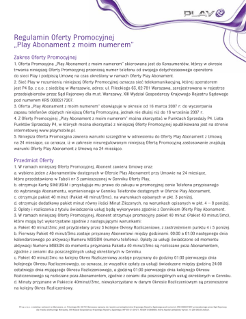 Regulamin Oferty Promocyjnej „Play Abonament z moim numerem” Zakres Oferty Promocyjnej 1. Oferta Promocyjna „Play Abonament z moim numerem” skierowana jest do Konsumentów, którzy w okresie trwania niniejszej Oferty Promocyjnej przeniosą numer telefonu od swojego dotychczasowego operatora do sieci Play i podpiszą Umowę na czas określony w ramach Oferty Play Abonament. 2. Sieć Play w rozumieniu niniejszej Oferty Promocyjnej oznacza sieć telekomunikacyjną, której operatorem jest P4 Sp. z o.o. z siedzibą w Warszawie, adres: ul. Pileckiego 63, 02-781 Warszawa, zarejestrowana w rejestrze przedsiębiorców przez Sąd Rejonowy dla m.st. Warszawy, XIII Wydział Gospodarczy Krajowego Rejestru Sądowego pod numerem KRS 0000217207. 3. Oferta „Play Abonament z moim numerem” obowiązuje w okresie od 16 marca 2007 r. do wyczerpania zapasu telefonów objętych niniejszą Ofertą Promocyjną, jednak nie dłużej niż do 16 września 2007 r. 4. Z Oferty Promocyjnej „Play Abonament z moim numerem” można skorzystać w Punktach Sprzedaży P4. Lista Punktów Sprzedaży P4, w których można skorzystać z niniejszej Oferty Promocyjnej opublikowana jest na stronie internetowej www.playmobile.pl. 5. Niniejsza Oferta Promocyjna zawiera warunki szczególne w odniesieniu do Oferty Play Abonament z Umową na 24 miesiące, co oznacza, iż w zakresie nieuregulowanym niniejszą Ofertą Promocyjną zastosowanie znajdują warunki Oferty Play Abonament z Umową na 24 miesiące. Przedmiot Oferty 1. W ramach niniejszej Oferty Promocyjnej, Abonent zawiera Umowę oraz: a. wybiera jeden z Abonamentów dostępnych w Ofercie Play Abonament przy Umowie na 24 miesiące, które przedstawiono w Tabeli nr 3 zamieszczonej w Cenniku Oferty Play, b. otrzymuje Kartę SIM/USIM i przysługuje mu prawo do zakupu w promocyjnej cenie Telefonu przypisanego do wybranego Abonamentu, wymienionego w Cenniku Telefonów dostępnych w Ofercie Play Abonament, c. otrzymuje pakiet 40 minut (Pakiet 40 minut/3mc), na warunkach opisanych w pkt. 3 poniżej, d. otrzymuje dodatkowy pakiet minut równy ilości Minut Zliczonych, na warunkach opisanych w pkt. 4 – 8 poniżej. 2. Opłaty i rozliczenia z tytułu świadczenia usług będą wykonywane zgodnie z Cennikiem Oferty Play Abonament. 3. W ramach niniejszej Oferty Promocyjnej, Abonent otrzymuje promocyjny pakiet 40 minut (Pakiet 40 minut/3mc), które mogą być wykorzystane zgodnie z następującymi warunkami: a. Pakiet 40 minut/3mc jest przydzielany przez 3 kolejne Okresy Rozliczeniowe, z zastrzeżeniem punktu 4 i 5 poniżej. b. Pierwszy Pakiet 40 minut/3mc zostaje przyznany Abonentowi między godzinami: 00:00 a 01:00 następnego dnia kalendarzowego po aktywacji Numeru MSISDN (numeru telefonu). Opłaty za usługi świadczone od momentu aktywacji Numeru MSISDN do momentu przyznania Pakietu 40 minut/3mc są rozliczane poza Abonamentem, zgodnie z cenami dla poszczególnych usług określonych w Cenniku. c. Pakiet 40 minut/3mc na kolejny Okres Rozliczeniowy zostaje przyznany do godziny 01:00 pierwszego dnia kolejnego Okresu Rozliczeniowego, co oznacza, że wszystkie opłaty za usługi świadczone między godziną 24:00 ostatniego dnia mijającego Okresu Rozliczeniowego, a godziną 01:00 pierwszego dnia kolejnego Okresu Rozliczeniowego są rozliczane poza Abonamentem, zgodnie z cenami dla poszczególnych usług określonych w Cenniku. d. Minuty przyznane w Pakiecie 40minut/3mc, niewykorzystane w danym Okresie Rozliczeniowym są przenoszone na kolejny Okres Rozliczeniowy. P4 sp. z o.o. z siedzibą i adresem w Warszawie, ul. Pileckiego 63, 02-781 Warszawa wpisana do rejestru przedsiębiorców Krajowego Rejestru Sądowego pod numerem KRS 0000217207, prowadzonego przez Sąd Rejonowy dla miasta stołecznego Warszawy, XIII Wydział Gospodarczy Krajowego Rejestru Sądowego, NIP 951-21-20-077, REGON 015808609, której kapitał zakładowy wynosi: 18 200 000,00 złotych. e. Pakiet 40 minut/3 mc przyznany w trzecim, ostatnim Okresie Rozliczeniowym zachowuje swoją ważność do momentu wykorzystania wszystkich minut przyznanych w ramach tego pakietu. f. Pakiet 40 minut/3mc może być wykorzystywany na połączenia głosowe z numerami krajowymi (z wyłączeniem połączeń na numery specjalne, połączeń w roamingu międzynarodowym, połączeń przy użyciu usługi „Tani roaming”, połączeń międzynarodowych określonych w Cenniku Oferty Play). g. Minuty przyznane Abonentowi w ramach Pakietu 40 minut/3mc są rozliczane zgodnie z zasadami określonymi w Cenniku Oferty Play w Tabeli nr 5 „Kolejność wykorzystania jednostek rozliczeniowych na usługi podstawowe”. 4. Dla Abonentów, którzy w okresie od 16 marca 2007 r. do 7 kwietnia 2007 r. podpiszą w ramach niniejszej Oferty Promocyjnej Umowę od momentu podpisania Umowy do dnia 30 kwietnia 2007 r. wszystkie minuty połączeń głosowych inicjowanych przez Abonenta z numerami krajowymi (z wyłączeniem połączeń na numery specjalne, połączeń w roamingu międzynarodowym, połączeń przy użyciu usługi „Tani roaming” oraz połączeń międzynarodowych określonych w Cenniku Oferty Play) zostają zliczone (Minuty Zliczone). 5. W dniu 1 maja 2007 r., Abonentowi zostanie przyznany promocyjny pakiet minut równy ilości Minut Zliczonych do wykorzystania: a. na połączenia głosowe na numery krajowe (z wyłączeniem połączeń na numery specjalne, połączeń w roamingu międzynarodowym, połączeń przy użyciu usługi „Tani roaming”, połączeń międzynarodowych określonych w Cenniku Oferty Play ); b. w okresie od 1 maja 2007 r. do 31 maja 2007 r. 6. Zliczanie minut odbywa się automatycznie, po zakończeniu każdego połączenia spełniającego warunki punktu 4 powyżej. 7. W dniu 1 maja 2007 r. zostanie przekazana na Numer MSISDN (numer telefonu) Abonenta, informacja o liczbie Minut Zliczonych. Minuty Zliczone przyznane Abonentowi są do wykorzystania w pierwszej kolejności, przed minutami przyznanymi w ramach usług