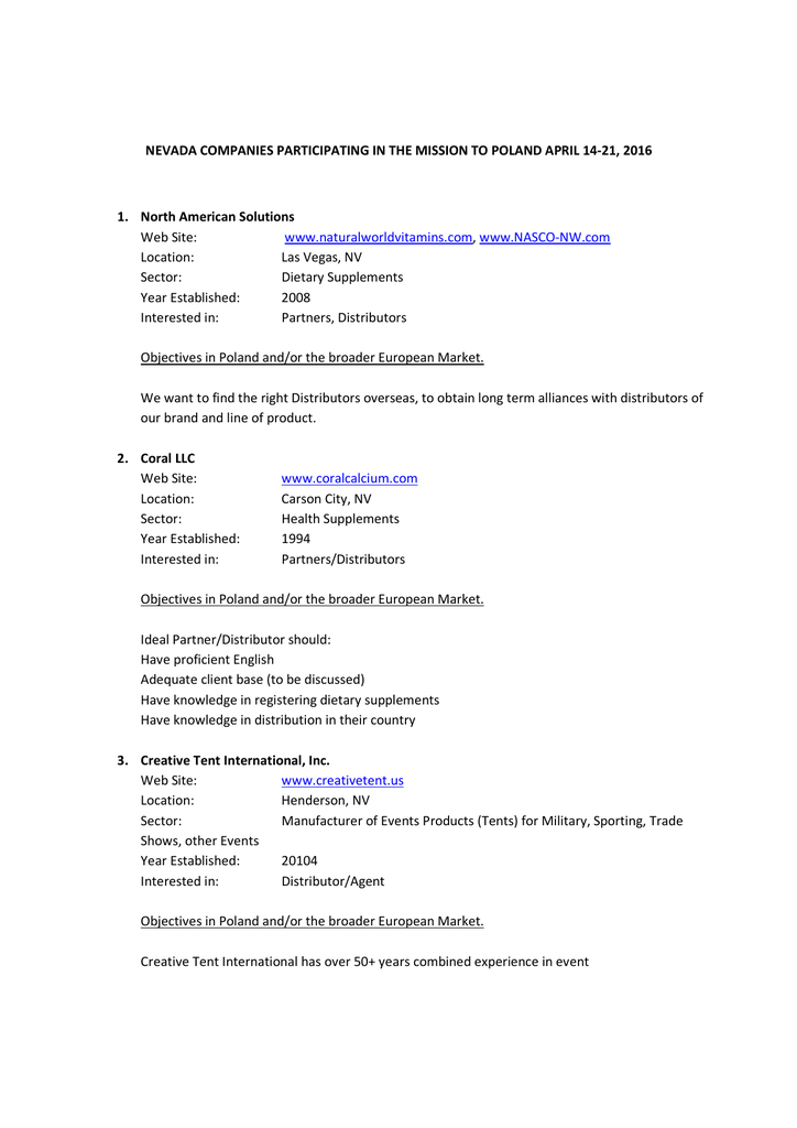 NEVADA COMPANIES PARTICIPATING IN THE MISSION TO POLAND APRIL 14-21, 2016 1. North American Solutions Web Site: www.naturalworldvitamins.com, www.NASCO-NW.com Location: Las Vegas, NV Sector: Dietary Supplements Year Established: 2008 Interested in: Partners, Distributors Objectives in Poland and/or the broader European Market. We want to find the right Distributors overseas, to obtain long term alliances with distributors of our brand and line of product. 2. Coral LLC Web Site: Location: Sector: Year Established: Interested in: www.coralcalcium.com Carson City, NV Health Supplements 1994 Partners/Distributors Objectives in Poland and/or the broader European Market. Ideal Partner/Distributor should: Have proficient English Adequate client base (to be discussed) Have knowledge in registering dietary supplements Have knowledge in distribution in their country 3. Creative Tent International, Inc. Web Site: www.creativetent.us Location: Henderson, NV Sector: Manufacturer of Events Products (Tents) for Military, Sporting, Trade Shows, other Events Year Established: 20104 Interested in: Distributor/Agent Objectives in Poland and/or the broader European Market. Creative Tent International has over 50+ years combined experience in event production, military relations and sales, industrial markets, and logistics. Language preference is English. However, we do have the ability to support any relationships with prospects that speak Spanish and Arabic. The prospect must be able to understand contract languages (both written and verbal) and understand and accept cultural difference to minimize miscommunication and misunderstandings. They must have the ability and experience, see opportunities and close deals with customers from all industry verticals. (Government, Industrial, Commercial, Private...etc.) 4. Solar LED Safety Strips Location: Sector: Year Established: Interested in: Las Vegas, NV Safety Products, Construction Safety – Solar 2015 Manufacturing Partner Objectives in Poland and/or the broader European Market. Looking for a manufacturer in Poland that is able to produce our product from start to finish, with the ability to drop ship to customers around the world. Additional Company information: Create 3D prototype, seeking manufacturing for Solar LED Safety Strips, aluminum wiring, silicone, Velcro, small solar panels and battery packs. Solar LED Safety Strips are LED lighting strips can be attached with Velcro, sewn and glued to many surfaces. Examples: safety vest for night work for construction, mining, sporting event, etc. Person working at night wearing the Safety Strips on their safety vest can be seen if moving at 880 feet at 65 MPH. The solar strips allow the worker to be seen 2800 feet or more without movement, since the vest is flashing with 20 high intensity LED lights. The solar panel will allow 30 hours of lighting before strips has to be charged. It takes 2 to 3 hours in the sunlight to fully recharge the re-chargeable batteries. Strips go to steady burn when they need to be recharged. 5. JadinTech Web Site: Location: Sector: Year Established: Interested in: www.jadintech.com Las Vegas, NV Aviation, Aerospace 2015 Joint Venture Partner or Licensee Objectives in Poland and/or the broader European Market Develop relationships within ICAO community and to obtain international business within our selected business lines. Additionally, we seek to provide talent acquisition and EEO services to Polish companies that stand locations in Nevada. Connecting with Commercial and Government Unmanned Aircraft Systems industry partners to facilitate discussions pertaining to Simulation and Training, and to export of UAS simulation training devices to Europe. 6. EWS, Inc. & Environmental Water Systems www.ewswater.com Web Site: Location: Las Vegas, NV Sector: Water Filtration Manufacturer Year Established: 1987 Interested in: Distributor, Sales Representatives Objectives in Poland and/or the broader European Market As here in the US we look at both sales reps [agents] and distributors with a direct correlation to the plumbing industry. We attempt to find distributors and sales reps that will effectively and properly promote our products. The ability to convers both orally and in written form in English is a must. Distributor investment is based upon the markets needs and is never excessive. Distributors of any products related to the plumbing industry. 7. GigaCrete Inc. Web Site: Location: Sector: Year Established: Interested in: www.gigacrete.com Las Vegas, NV Engineering/Construction 2005 Joint Venture Partner, Licensee Objectives in Poland and/or the broader European Market Product: affordable housing and ballistic protective coatings. Looking for a partner in General Building Materials and Ballistic Rated Windows and Doors. Mass Affordable Housing Developments and Governmental Ballistic Governmental Upgrade Requirements. 8. AHA Consulting Web Site: Location: www.justsayaha.com Las Vegas, NV Sector: Year Established: Interested in: Technology and Interactive/Services 2009 Joint Venture Partners or Licensee, Agents Objectives in Poland and/or the broader European Market AHA is looking to expand and hoping to find partners that will allow the company to take a Larger, non-gaming clients–specifically in the Clean Energy, Solar, Technology (Software and Game Development) and Entertainment industries. Preferences, technical qualifications, servicing capabilities, requirements, or pre-qualifications that ideal prospects must have: Language: Fluent in English Some fluency in Italian, Spanish Technology – looking for innovative, creative and technically savvy partners User Experience and Creative Design Mobile developers (front end and back end) Programmers and Engineers (Database, Game Development) Project Manager & Business Analysts 9. Robot Army Web site: Location: Sector: Year Established: Interested in: wwww.robot-army.com Las Vegas, NV Commercial Electronic Art/Arts and Entertainment 201