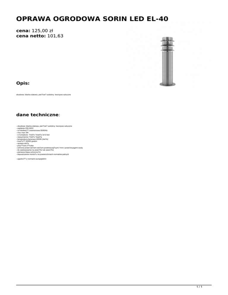 OPRAWA OGRODOWA SORIN LED EL-40 cena: 125,00 zł cena netto: 101,63 Opis: obudowa: blacha stalowa, pier?cie? ozdobny: tworzywo sztuczne dane techniczne: - obudowa: blacha stalowa, pier?cie? ozdobny: tworzywo sztuczne - zasilanie 230-240V - cz?stotliwo?? znamionowa 50/60Hz - moc max 3W - w komplecie: ?ród?o ?wiat?a 3x12 led - niewymienne ?ród?o ?wiat?a - temperatura barwowa 4000K (bia?a) - trwa?o?? 20000 godzin - oprawa sta?a - przy??cze z??czka - ochrona przed cia?ami sta?ymi przekraczaj?cymi 1mm i przed bryzgami wody - do zastosowania na zewn?trz lub wewn?trz - pierwsza klasa ochronno?ci - dopuszczenie monta?u na powierzchniach normalnie palnych - zgodno?? z normami europejskimi 1/1