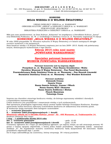 DOM KULTURY „ K O L O R O W A „ 02 – 495 Warszawa, ul. gen. K. Sosnkowskiego 16, tel. 22 867 63 95, fax. 22 667 83 75 www.kolorowa.arsus.pl e-mail: [email protected] KONKURS MOJA WIEDZA O II WOJNIE ŚWIATOWEJ URZĄD DZIELNICY URSUS m. st. WARSZAWY OŚRODEK KULTURY „ARSUS” w DZIELNICY URSUS m. st. WARSZAWY DOM KULTURY „KOLOROWA” BIBLIOTEKA PUBLICZNA w DZIELNICY URSUS m. st. WARSZAWY Miło jest nam poinformować, że Dom Kultury „Kolorowa” we współpracy z Ośrodkiem Kultury „Arsus” oraz Biblioteką Publiczną im. W. J. Grabskiego w Dzielnicy Ursus m. st. Warszawy organizują VI edycję KONKURSU „MOJA WIEDZA O II WOJNIE ŚWIATOWEJ” W roku 2009 przypadała 70. Rocznica wybuchu II Wojny Światowej a w latach następnych okrągłe rocznice wydarzeń z nią związanych. Nasz konkurs wiedzy o II Wojnie Światowej rozpisany jest na lata 2009 -2015. Każdy rok poświęcamy innym, dominującym wydarzeniom z tego okresu. Edycja 2014 roku nosi nazwę „POWSTANIE WARSZAWSKIE” Specjalny patronat honorowy MUZEUM POWSTANIA WARSZAWSKIEGO Patronat honorowy nad tą imprezą objęli: Prezydent m. st. Warszawy – Pani Hanna Gronkiewicz –Waltz Dyrektor Muzeum II Wojny Światowej – Pan Paweł Machcewicz Przewodniczący Rady Dzielnicy Ursus m. st. Warszawy – Pan Henryk Linowski Burmistrz Dzielnicy Ursus m. st. Warszawy – Pan Wiesław Krzemień Patronat medialny: Dziennik Ursusa Gazeta Ursus Nasza Gazeta Ochoty, Ursusa i Włoch Nasza Gazeta Woli i Bemowa Nasza Gazeta Żoliborza i Bielan Flesch Mazowsza Telewizja Ursus Impreza ma charakter otwartego konkursu wiedzy, do którego zapraszamy młodzież i dorosłych z województwa mazowieckiego. Celem konkursu jest przybliżenie i rozszerzenie wiedzy o tych wydarzeniach. Nad sprawnym przebiegiem tegorocznej edycji czuwać będzie Komisja Oceniająca Konkursu. Komisja opracowała wykaz literatury zalecanej uczestnikom konkursu (w załączeniu) oraz zestawy pytań. W konkursie mogą startować dwie kategorie uczestników: I – uczniowie gimnazjów II – uczniowie szkół ponadgimnazjalnych i dorośli Eliminacje odbędą się w Ośrodku Kultury „Arsus” 02 - 495 Warszawa, ul. Traktorzystów 14. Konkurs obejmuje dwa etapy: I etap - 1 października (środa) 2014 roku kat. I - uczniowie gimnazjów - godz. 10.00 kat. II - uczniowie szkół ponadgimnazjalnych i dorośli - godz. 13.00 Uczestnicy zgłoszeni do I etapu po identyfikacji zgłoszeń i po zajęciu miejsc na sali otrzymają zestawy 40 pytań z trzema opcjami odpowiedzi, z której jedna będzie prawidłowa. Odpowiedzi należy zaznaczać znakiem „X”. Na wypełnienie zestawu uczestnicy konkursu będą dysponowali 60 minutami. Każda prawidłowa odpowiedź daje 1 punkt. Do II etapu zakwalifikują się uczestnicy, którzy otrzymają 30 i więcej punktów. II etap - 15 października (środa) 2014 roku. Informacja o zakwalifikowanych do II etapu będzie dostępna na stronach internetowych www.kolorowa.arsus.pl, www.bpursus.waw.pl W drugim etapie uczestnicy otrzymają zestawy 40 pytań z trzema opcjami odpowiedzi, z której jedna będzie prawidłowa. Nagrodzeni zostaną wszyscy, którzy w II etapie otrzymają 30 i więcej punktów. Uroczysty wieczór laureatów połączony z wręczeniem nagród odbędzie się w piątek 24 października 2014 roku w Domu Kultury „Kolorowa” o godz. 18.00 Karty zgłoszeń do konkursu należy przesłać lub dostarczyć do dnia 19 września 2014 roku na adres: Dom Kultury "Kolorowa", 02 - 495 Warszawa, ul. gen. K. Sosnkowskiego 16 - KONKURS „POWSTANIE WARSZAWSKIE” tel. 22 867 63 95, fax 22 667 83 75 e-mail: [email protected] lub online ze strony organizatora. Szczegółowych informacji o konkursie udziela: Dom Kultury „ Kolorowa ”, 02 – 495 Warszawa, ul. gen. K. Sosnkowskiego 16, Sekretariat II piętro, pokój 227 lub Janusz Łukaszewicz pokój 230 - tel. 22 867 63 95, kom.604 503 353. Powyższa informacja będzie dostępna również na stronach internetowych www.kolorowa.arsus.pl, www.bpursus.waw.pl LITERATURA ZALECANA UCZESTNIKOM VI EDYCJI KONKURSU „POWSTANIE WARSZAWSKIE” 1. 2. 3. 4. 5. 6. Bartoszewski, Władysław. – „Powstanie Warszawskie” (Przypisy – Andrzej Kunert); Warszawa, Świat Książki, 2009 Davies, Norman. – „Powstanie 1944”; Kraków, Znak, 2004 Kirchmayer, Jerzy. – „Powstanie Warszawskie 1944”; Warszawa, Książka i Wiedza, 1984 Kunert, Andrzej. – „Powstanie Warszawskie w walce i dyplomacji”; Warszawa, PWN, 1994 Kunert, Andrzej. – „Rzeczpospolita walcząca. Powstanie Warszawskie 44. Kalendarium”; Warszawa, Wydawnictwo Sejmowe, 1994 Osmecki, Jerzy Iranek-. - „Powstanie Warszawskie po 60 latach”; Warszawa, NERITON, 2007 Wszelkich informacji na temat dostępności poszczególnych tytułów dla uczestników konkursu udziela pracownik Biblioteki Publicznej w Ursusie Małgorzata Snopkiewicz – bibliotekarz; tel. 22 882 43 00 lub email: [email protected] organizatorzy w załączeniu: karta zgłoszenia Warszawa, czerwiec 2014 roku KONKURS MOJA WIEDZA O II WOJNIE ŚWIATOWEJ URZĄD DZIELNICY URSUS m.st. WARSZAWY OŚRODEK KULTURY „ARSUS” w DZIELNICY URSUS M. ST.WARSZAWY DOM KULTURY „KOLOROWA” BIBLIOTEKA PUBLICZNA w DZIELNICY URSUS m. st. WARSZAWY EDYCJA 2014 ROKU „POWSTANIE WARSZAWSKIE” KARTA ZGŁOSZENIA PROSIMY WYPEŁNIĆ PISMEM DRUKOWANYM Nazwa placówki zgłaszającej (adres, telefon/fax/e-mail) ......................................................................... ......................................................................... ......................................................................... Imię i nazwisko .......................................................................... .......................................................................... Kategoria wiekowa (proszę odpowiednio zaznaczyć) I. II. uczniowie gimnazjów uczniowie szkół ponadgimnazjalnych i dorośli OŚWIADCZENIE: Akceptuję warunki Konkursu MOJA WIEDZA O II WOJNIE ŚWIATOWE