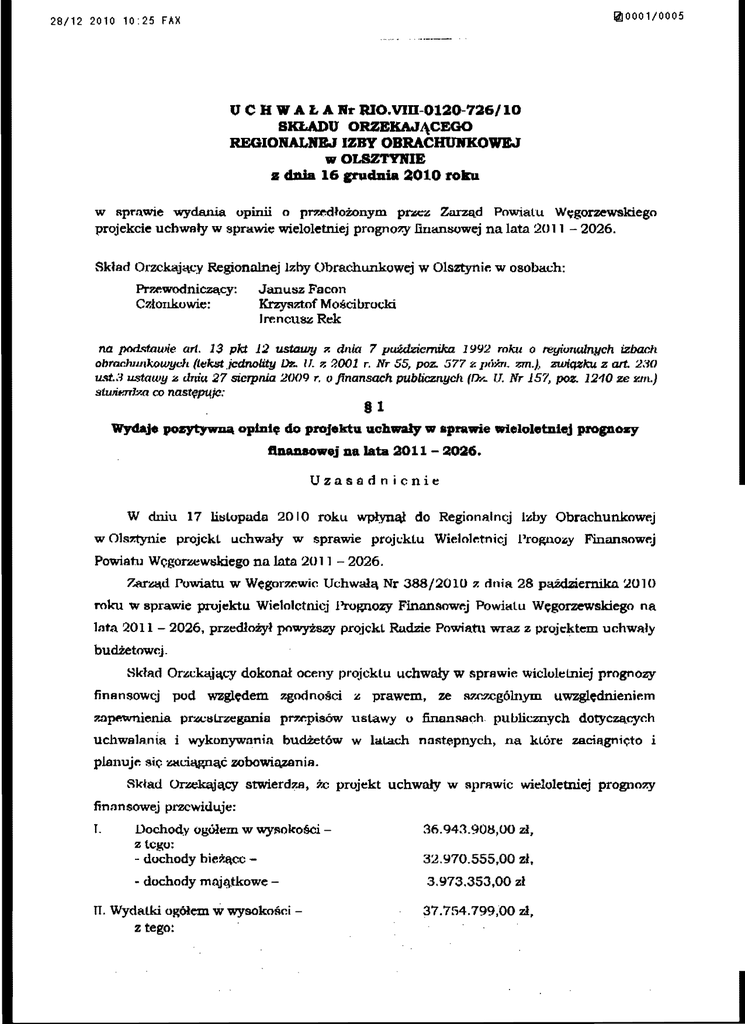 SKIADU ORZEKAJ.t\CEGO REGIONALBBJ IZBY OBRACHUJO{OWEJ w OLSZTYJIIIE II dD.ia 16 cnadnia 2010 rolm w sp1"nwie wyda.n:ia opinii 0 pnedloZonym pr"a:".l; ZarzEtd Powiatu Wc;gorzewskiego