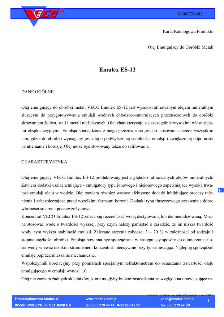 ® MODEX-OIL Karta Katalogowa Produktu Olej Emulgujący do Obróbki Metali Emulex ES-12 DANE OGÓLNE Olej emulgujący do obróbki metali VECO Emulex ES-12 jest wysoko rafinowanym olejem mineralnym służącym do przygotowywania emulsji wodnych chłodząco-smarujących przeznaczonych do obróbki skrawaniem żeliwa, stali i metali nieżelaznych. Olej charakteryzuje się szczególnie wysokimi własnościami eksploatacyjnymi. Emulsja sporządzona z niego przeznaczona jest do stosowania przede wszystkim tam, gdzie do obróbki wymagany jest olej o podwyższonej stabilności emulsji i zwiększonej odporności na utlenianie i korozję. Olej może być stosowany także do szlifowania. CHARAKTERYSTYKA Olej emulgujący VECO Emulex ES-12 produkowany jest z głęboko rafinowanych olejów mineralnych. Zawiera dodatki uszlachetniające - emulgatory typu jonowego i niejonowego zapewniające wysoką trwałość emulsji oleju w wodzie. Olej zawiera również wysoce efektywne dodatki inhibitujące procesy utle- 1 nienia i zabezpieczające przed wszelkimi formami korozji. Dodatki typu tłuszczowego zapewniają dobre własności smarne i przeciwzużyciowe. Koncentrat VECO Emulex ES-12 zaleca się rozcieńczać wodą destylowaną lub demineralizowaną. Można stosować wodę o twardości wyższej, przy czym należy pamiętać o zasadzie, że im niższa twardość wody, tym wyższa stabilność emulsji. Zalecane stężenia robocze: 3 – 20 % w zależności od rodzaju i stopnia ciężkości obróbki. Emulsja powinna być sporządzana w następujący sposób: do odmierzonej ilości wody wlewać cienkim strumieniem koncentrat intensywnie przy tym mieszając. Najlepiej sporządzać emulsję poprzez mieszanie mechaniczne. Współczynnik korelacyjny przy pomiarach specjalnym refraktometrem do oznaczania zawartości oleju emulgującego w emulsji wynosi 1,0. Olej nie zawiera żadnych składników, które mogłyby budzić zastrzeżenia ze względu na obowiązujące re- wersja A,, wydanie VII, data aktualizacji: 21.07.2004 r Przedsiębiorstwo Modex-Oil www.modex.com.pl [email protected] 82-500 KWIDZYN, ul. SZTUMSKA 9 tel. 0-55 279 44 44, 0-55 279 42 51 fax 0-55 279 42 90 1 ® MODEX-OIL gulacje prawne w dziedzinie bhp i ochrony środowiska. W szczególności nie zawiera składników objętych listą negatywną załączoną do Rozporządzenia Ministra Zdrowia i Opieki Społecznej z dn. 1996.09.11 ani nie wymaga znakowania wg wymagań Rozporządzenia Ministra Zdrowia i opieki Społecznej z dn. 1997.08.21. SPEŁNIA WYMAGANIA NORM I SPECYFIKACJI ZN-PTX-95/OO-08101 Uzyskał atest higieniczny Państwowego Zakładu Higieny HK/B/0581/05/2000 TYPOWE WŁASNOŚCI FIZYKO-CHEMICZNE Własności Wygląd zewnętrzny Typowe wartości olej klarowny o barwie brązowej 42 Lepkość kinematyczna w 40 °C, mm /s Własności 5% emulsji oleju w wodzie o twardości 15 ºn wytrzymuje Stabilność emulsji w temp. 20 ºC +/-5 °C, w czasie 48h Zdolność ochrony przed korozją HO pH 8,7 2 TYPOWE ZASTOSOWANIA 2 1. Urządzenia do frezowania i toczenia stali, żeliwa i metali kolorowych 2. Urządzenia do obróbki szlifierskiej 3. Urządzenia do wiercenia, rozwiercania i gwintowania W zależności od miejsca stosowania i od rodzaju obróbki zaleca się stosowanie emulsji o stężeniu od 3 do 20 % w wodzie o twardości nie wyższej niż 20on. W operacjach szlifowania zaleca się stężenie emulsji od 3 do 5%. W operacjach toczenia, wiercenia i frezowania najlepiej zachowuje się emulsja o stężeniu od 5 do 10%. W operacjach gwintowania zaleca się stosowanie emulsji o stężeniu od 10 do 15%. TYPOWI ODBIORCY wersja A,, wydanie VII, data aktualizacji: 21.07.2004 r Przedsiębiorstwo Modex-Oil www.modex.com.pl [email protected] 82-500 KWIDZYN, ul. SZTUMSKA 9 tel. 0-55 279 44 44, 0-55 279 42 51 fax 0-55 279 42 90 1 ® MODEX-OIL - Użytkownicy maszyn do obróbki skrawaniem w różnych gałęziach przemysłu - Użytkownicy urządzeń szlifierskich OPAKOWANIA, PRZECHOWYWANIE Olej VECO Emulex ES-12 oferowany jest w beczkach 60 i 210 l oraz paletopojemnikach o pojemności 750 i 950 l. Na specjalne zamówienie odbiorcy produkt może być napełniony do innych opakowań lub dostarczony luzem. Po dłuższym okresie przechowywania, szczególnie w temperaturze poniżej 10 oC, przed użyciem koncentrat powinien zostać ujednorodniony. SZCZEGÓLNE CECHY EKSPLOATACYJNE 1. Własności smarne i przeciwzużyciowe Obecność dodatków uszlachetniających poprawiających własności smarne oleju chroni narzędzia skrawające przed nadmiernym zużyciem oraz zapewnia otrzymanie wysokiej jakości powierzchni obrabianych przedmiotów. 2. Trwałość emulsji Olej VECO Emulex ES-12 zawiera efektywny zestaw emulgatorów jonowych i niejonowych, który gwarantuje wysoką trwałość i stabilność emulsji w czasie wydłużonego okresu eksploatacji. 3 3. Ochrona przed utlenieniem i korozją Olej VECO Emulex ES-12 zawiera efektywny zestaw inhibitorów utlenienia i korozji, które skutecznie chronią emulsję przed utlenianiem w warunkach eksploatacji i przerw w pracy urządzeń obróbkowych. Olej skutecznie chroni zarówno przedmioty obrabiane jak i urządzenia obróbkowe przed wszelkimi rodzajami korozji. 4. Trwałość biologiczna Olej VECO Emulex ES-12 posiada zdolność hamowania rozwoju flory bakteryjnej w czasie eksploatacji i w czasie postoju urządzeń do obróbki. Skuteczna ochrona biologiczna zapewnia wysoką stabilność emulsji i wydłuża okres jej stosowania. wersja A,, wydanie VII, data aktualizacji: 21.07.2004 r Przedsiębiorstwo Modex-Oil www.modex.com.pl [email protected] 82-500 KWIDZYN, ul. SZTUMSKA 9 tel. 0-55 279 44 44, 0-55 279 42 51 fax 0-55 279 42 90 1 ® 5. MODEX-OIL Niska toksyczność i obojętność wobec środowiska Olej nie zawiera składników, wobec których istnieją podejrzenia o toksyczne oddziaływanie na organizm człowieka. Składniki emulsji po rozkładzie są bardzo łatwo utylizowane przez typowe urządzenia do oczyszczania odpadów i ściekó