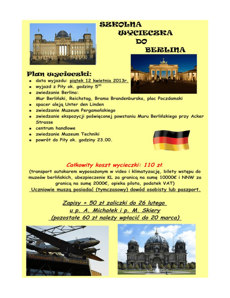 SZKOLNA WYCIECZKA DO BERLINA Plan wycieczki: ● ● ● ● ● ● ● ● ● data wyjazdu: piątek 12 kwietnia 2013r. wyjazd z Piły ok. godziny 500 zwiedzanie Berlina: Mur Berliński, Reichstag, Brama Brandenburska, plac Poczdamski spacer aleją Unter den Linden zwiedzanie Muzeum Pergamońskiego zwiedzanie ekspozycji poświęconej powstaniu Muru Berlińskiego przy Acker Strasse centrum handlowe zwiedzanie Muzeum Techniki powrót do Piły ok. godziny 23.00. Całkowity koszt wycieczki: 110 zł. (transport autokarem wyposażonym w video i klimatyzację, bilety wstępu do muzeów berlińskich, ubezpieczenie KL za granicą na sumę 10000€ i NNW za granicą na sumę 2000€, opieka pilota, podatek VAT) Uczniowie muszą posiadać (tymczasowy) dowód osobisty lub paszport. Zapisy + 50 zł zaliczki do 26 lutego u p. A. Michałek i p. M. Skiery (pozostałe 60 zł należy wpłacić do 20 marca)