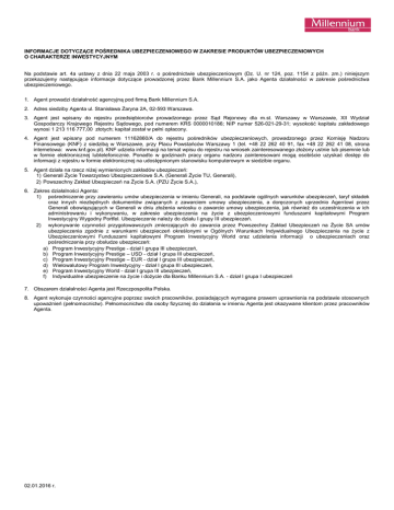 INFORMACJE DOTYCZĄCE POŚREDNIKA UBEZPIECZENIOWEGO W ZAKRESIE PRODUKTÓW UBEZPIECZENIOWYCH O CHARAKTERZE INWESTYCYJNYM Na podstawie art. 4a ustawy z dnia 22 maja 2003 r. o pośrednictwie ubezpieczeniowym (Dz. U. nr 124, poz. 1154 z późn. zm.) niniejszym przekazujemy następujące informacje dotyczące prowadzonej przez Bank Millennium S.A. jako Agenta działalności w zakresie pośrednictwa ubezpieczeniowego. 1. Agent prowadzi działalność agencyjną pod firmą Bank Millennium S.A. 2. Adres siedziby Agenta ul. Stanisława Żaryna 2A, 02-593 Warszawa. 3. Agent jest wpisany do rejestru przedsiębiorców prowadzonego przez Sąd Rejonowy dla m.st. Warszawy w Warszawie, XII Wydział Gospodarczy Krajowego Rejestru Sądowego, pod numerem KRS 0000010186; NIP numer 526-021-29-31; wysokość kapitału zakładowego wynosi 1 213 116 777,00 złotych; kapitał został w pełni opłacony. 4. Agent jest wpisany pod numerem 11162860/A do rejestru pośredników ubezpieczeniowych, prowadzonego przez Komisję Nadzoru Finansowego (KNF) z siedzibą w Warszawie, przy Placu Powstańców Warszawy 1 (tel. +48 22 262 40 91, fax +48 22 262 41 08, strona internetowa: www.knf.gov.pl). KNF udziela informacji na temat wpisu do rejestru na wniosek zainteresowanego złożony ustnie lub pisemnie lub w formie elektronicznej lubtelefonicznie. Ponadto w godzinach pracy organu nadzoru zainteresowani mogą osobiście uzyskać dostęp do informacji z rejestru w formie elektronicznej na udostępnionym stanowisku komputerowym w siedzibie organu. 5. Agent działa na rzecz niżej wymienionych zakładów ubezpieczeń: 1) Generali Życie Towarzystwo Ubezpieczeniowe S.A. (Generali Życie TU, Generali), 2) Powszechny Zakład Ubezpieczeń na Życie S.A. (PZU Życie S.A.), 6. Zakres działalności Agenta: 1) pośredniczenie przy zawieraniu umów ubezpieczenia w imieniu Generali, na podstawie ogólnych warunków ubezpieczeń, taryf składek oraz innych niezbędnych dokumentów związanych z zawarciem umowy ubezpieczenia, a doręczonych uprzednio Agentowi przez Generali obowiązujących w Generali w dniu złożenia wniosku o zawarcie umowy ubezpieczenia, jak również do uczestniczenia w ich administrowaniu i wykonywaniu, w zakresie ubezpieczenia na życie z ubezpieczeniowymi funduszami kapitałowymi Program Inwestycyjny Wygodny Portfel. Ubezpieczenie należy do działu I grupy III ubezpieczeń. 2) wykonywanie czynności przygotowawczych zmierzających do zawarcia przez Powszechny Zakład Ubezpieczeń na Życie SA umów ubezpieczenia zgodnie z warunkami ubezpieczeń określonymi w Ogólnych Warunkach Indywidualnego Ubezpieczenia na życie z Ubezpieczeniowymi Funduszami kapitałowymi Program Inwestycyjny World oraz udzielania informacji o ubezpieczeniach oraz pośredniczenia przy obsłudze ubezpieczeń: a) Program Inwestycyjny Prestige - dział I grupa III ubezpieczeń, b) Program Inwestycyjny Prestige – USD - dział I grupa III ubezpieczeń, c) Program Inwestycyjny Prestige – EUR - dział I grupa III ubezpieczeń, d) Wielowalutowy Program Inwestycyjny - dział I grupa III ubezpieczeń, e) Program Inwestycyjny World - dział I grupa III ubezpieczeń, f) Indywidualne ubezpieczenie na życie i dożycie dla Banku Millennium S.A. - dział I grupa I ubezpieczeń 7. Obszarem działalności Agenta jest Rzeczpospolita Polska. 8. Agent wykonuje czynności agencyjne poprzez swoich pracowników, posiadających wymagane prawem uprawnienia na podstawie stosownych upoważnień (pełnomocnictw). Pełnomocnictwo dla osoby fizycznej do działania w imieniu Agenta jest okazywane klientom przez pracowników Agenta. 02.01.2016 r.