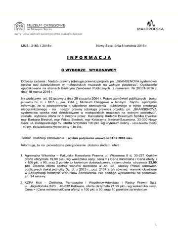 MNS.I.2163.1.2016 r. Nowy Sącz, dnia 8 kwietnia 2016 r. INFORMACJA O WYBORZE WYKONAWCY Dotyczy zadania : Nadzór prawny (obsługa prawna) projektu pn. „SKANSENOVA systemowa opieka nad dziedzictwem w małopolskich muzeach na wolnym powietrzu”. Ogłoszenie opublikowane na stronach Biuletynu Zamówień Publicznych z numerem: Nr 28101-2016 z dnia 18 marca 2016 r. Na podstawie art. 92 ustawy z dnia 29 stycznia 2004 r. Prawo zamówień publicznych (tekst jednolity Dz. U. z 2015 r., poz. 2164 ), Muzeum Okręgowe w Nowym Sączu uprzejmie informuję, że w postępowaniu o udzielenie zamówienia publicznego w trybie przetargu nieograniczonego - na nadzór prawny (obsługa prawna) projektu pn. „SKANSENOVA systemowa opieka nad dziedzictwem w małopolskich muzeach na wolnym powietrzu”, została wybrana oferta nr 3 złożona przez Kancelarię Radców Prawnych Spółka Cywilna mgr Barbara Biedroń, mgr Witold Biedroń, mgr Katarzyna Biedroń-Szczecina, 33-300 Nowy Sącz, ul. Dunajewskiego ¾. Oferta otrzymała 100 pkt. wg kryterium oceny - cena brutto oferty - 90 pkt. doświadczenie Wykonawcy – 10 pkt. Termin realizacji zamówienia : od dnia podpisania umowy do 31.12.2018 roku. Informuję, że na prowadzone postępowanie złożono siedem ofert : 1. Agnieszka Witońska – Pakulska Kancelaria Prawna ul. Wiosenna 8 d, 30-237 Kraków oferta otrzymała 19,99 pkt.- wg wskaźnika ceny, cena = ( Cena minimalna / Cena oferty ) x 100 pkt. x 90, oraz 2 punkty za kryterium doświadczenie, razem oferta otrzymała 22,99 pkt. Złożona oferta spełnia warunki określone w art. 22 ustawy Prawo zamówień publicznych (tekst jednolity Dz. U. z 2015 r., poz. 2164 ), jak również warunki określone w Specyfikacji Istotnych Warunków Zamówienia. Nie podlega wykluczeniu na podstawie art. 24 ustawy. 2. KZPA Kuś – Zielińska, Pampuszko i Wspólnicy-Adwokaci i Radcy Prawni Sp.j. ul. Jagiellońska 24/3 , 40-032 Katowice, oferta otrzymała 21,99 pkt.- wg wskaźnika ceny, Cena = (Cena minimalna/Cena oferty) x 100 pkt. x 90, oraz 10 punktów za kryterium 1 doświadczenie, razem oferta otrzymała 31,99 pkt. Złożona oferta spełnia warunki określone w art. 22 ustawy Prawo zamówień publicznych (tekst jednolity Dz. U. z 2015 r., poz. 2164 ), jak również warunki określone w Specyfikacji Istotnych Warunków Zamówienia. Nie podlega wykluczeniu na podstawie art. 24 ustawy. 3. Kancelaria Radców Prawnych Spółka Cywilna mgr Barbara Biedroń, mgr Witold Biedroń, mgr Katarzyna Biedroń - Szczecina, 33-300 Nowy Sącz, ul. Dunajewskiego ¾, oferta otrzymała 90,00 pkt.- wg wskaźnika ceny, cena = (Cena minimalna/Cena oferty) x 100 pkt. x 90, oraz 10 punktów za kryterium doświadczenie, razem oferta otrzymała 100 pkt. Złożona oferta spełnia warunki określone w art. 22 ustawy Prawo zamówień publicznych (tekst jednolity Dz. U. z 2015 r., poz. 2164 ), jak również warunki określone w Specyfikacji Istotnych Warunków Zamówienia. Nie podlega wykluczeniu na podstawie art. 24 ustawy. 4. KPMZ.pl Załucki, Pliś i Partnerzy Adwokaci i Radcy Prawni Spółka Partnerska 35-307 Rzeszów, al. Armii Krajowej 7, oferta otrzymała 49,51 pkt.- wg wskaźnika ceny, cena = (Cena minimalna/Cena oferty) x 100 pkt. x 90, oraz 10 punktów za kryterium doświadczenie, razem oferta otrzymała 59,51 pkt. Złożona oferta spełnia warunki określone w art. 22 ustawy Prawo zamówień publicznych (tekst jednolity Dz. U. z 2015 r., poz.2164),jak również warunki określone w Specyfikacji Istotnych Warunków Zamówienia. Nie podlega wykluczeniu na podstawie art. 24 ustawy. 5. Orzeł Stankiewicz Kancelaria Radców Prawnych, s.c, Al. Słowackiego 66, 30-004 Kraków, oferta otrzymała 40,65 pkt.- wg wskaźnika ceny, cena = (Cena minimalna/Cena oferty) x 100 pkt.x 90, oraz 10 punktów za kryterium doświadczenie, razem oferta otrzymała 50,65 pkt. Złożona oferta spełnia warunki określone w art. 22 ustawy Prawo zamówień publicznych (tekst jednolity Dz. U. z 2015 r., poz. 2164 ), jak również warunki określone w Specyfikacji Istotnych Warunków Zamówienia. Nie podlega wykluczeniu na podstawie art. 24 ustawy. 6. Kancelaria Adwokatów i Radców Prawnych Gabriela Morawska – Stanecka Marek Stańko Spółka Partnerska ul. PCK 10/14, 40- 057 Katowice, oferta otrzymała 38,22 pkt.- wg wskaźnika ceny, cena = (Cena minimalna/Cena oferty) x 100 pkt.x 90, oraz 10 punktów za kryterium doświadczenie, razem oferta otrzymała 48,22 pkt. Złożona oferta spełnia warunki określone w art. 22 ustawy Prawo zamówień publicznych (tekst jednolity Dz. U. z 2015 r., poz. 2164 ), jak również warunki określone w Specyfikacji Istotnych Warunków Zamówienia. Nie podlega wykluczeniu na podstawie art. 24 ustawy. 7. Szot Bieniek Buchman Szot Adwokaci Spółka Partnerska 33-300 Nowy Sącz, ul. Rynek 13, oferta otrzymała 39,60 pkt.- wg wskaźnika ceny, cena = (Cena minimalna/Cena oferty) x 100 pkt.x 90, oraz 10 punktów za kryterium doświadczenie, razem oferta otrzymała 49,60 pkt. Złożona oferta spełnia warunki określone w art. 22 ustawy Prawo zamówień publicznych (tekst jednolity Dz. U. z 2015 r., poz. 2164 ), jak również warunki określone w Specyfikacji Istotnych Warunków Zamówienia. Nie podlega wykluczeniu na podstawie art. 24 ustawy. Zawiadomienie o wyborze oferty najkorzystniejszej zostaje przesłane wykonawcy faksem oraz pisemnie w dniu sporządzenia, tj. w dniu 8 kwietnia 2016 r. w związku z powyższym zgodnie z art. 94 ust. 1 ustawy umowa o udzielenie zamówienia publicznego z wybranym Wykonawcą może zostać zawarta po upływie 5 dni od dnia przesłania zawiadomienia tj. po 14 kwietnia 2016 r. chyba, że zostanie wniesione odwołanie to w terminie późniejszym. 2 Za udział w przetargu dziękujemy. Pouczenie 1. Zgodnie z art. 180 mają Państwo prawo wnieść odwołania. 2. Odwołanie wnosi się do Prezesa Krajowej Izby w formie pisemnej albo elektronicznej opatrzonej bezpiecznym podpisem elektronicznym weryfikowanym za pomocą w