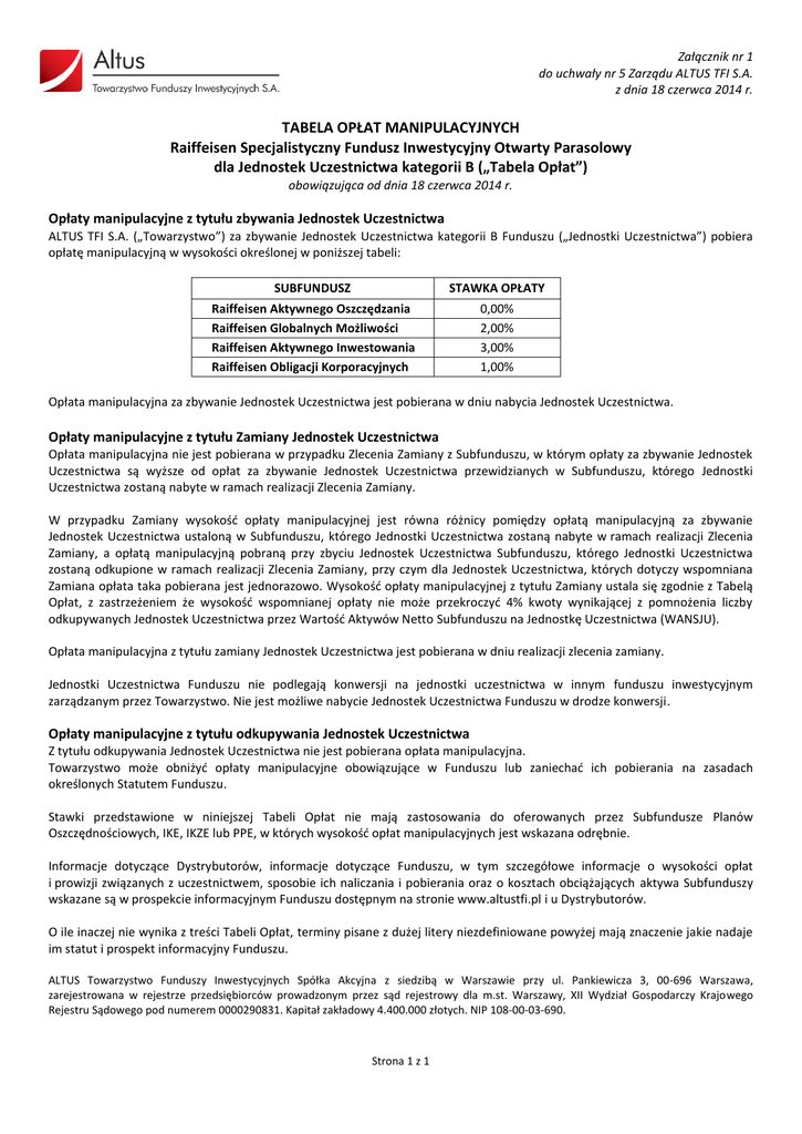 Załącznik nr 1 do uchwały nr 5 Zarządu ALTUS TFI S.A. z dnia 18 czerwca 2014 r. TABELA OPŁAT MANIPULACYJNYCH Raiffeisen Specjalistyczny Fundusz Inwestycyjny Otwarty Parasolowy dla Jednostek Uczestnictwa kategorii B („Tabela Opłat”) obowiązująca od dnia 18 czerwca 2014 r. Opłaty manipulacyjne z tytułu zbywania Jednostek Uczestnictwa ALTUS TFI S.A. („Towarzystwo”) za zbywanie Jednostek Uczestnictwa kategorii B Funduszu („Jednostki Uczestnictwa”) pobiera opłatę manipulacyjną w wysokości określonej w poniższej tabeli: SUBFUNDUSZ STAWKA OPŁATY Raiffeisen Aktywnego Oszczędzania Raiffeisen Globalnych Możliwości Raiffeisen Aktywnego Inwestowania Raiffeisen Obligacji Korporacyjnych 0,00% 2,00% 3,00% 1,00% Opłata manipulacyjna za zbywanie Jednostek Uczestnictwa jest pobierana w dniu nabycia Jednostek Uczestnictwa. Opłaty manipulacyjne z tytułu Zamiany Jednostek Uczestnictwa Opłata manipulacyjna nie jest pobierana w przypadku Zlecenia Zamiany z Subfunduszu, w którym opłaty za zbywanie Jednostek Uczestnictwa są wyższe od opłat za zbywanie Jednostek Uczestnictwa przewidzianych w Subfunduszu, którego Jednostki Uczestnictwa zostaną nabyte w ramach realizacji Zlecenia Zamiany. W przypadku Zamiany wysokość opłaty manipulacyjnej jest równa różnicy pomiędzy opłatą manipulacyjną za zbywanie Jednostek Uczestnictwa ustaloną w Subfunduszu, którego Jednostki Uczestnictwa zostaną nabyte w ramach realizacji Zlecenia Zamiany, a opłatą manipulacyjną pobraną przy zbyciu Jednostek Uczestnictwa Subfunduszu, którego Jednostki Uczestnictwa zostaną odkupione w ramach realizacji Zlecenia Zamiany, przy czym dla Jednostek Uczestnictwa, których dotyczy wspomniana Zamiana opłata taka pobierana jest jednorazowo. Wysokość opłaty manipulacyjnej z tytułu Zamiany ustala się zgodnie z Tabelą Opłat, z zastrzeżeniem że wysokość wspomnianej opłaty nie może przekroczyć 4% kwoty wynikającej z pomnożenia liczby odkupywanych Jednostek Uczestnictwa przez Wartość Aktywów Netto Subfunduszu na Jednostkę Uczestnictwa (WANSJU). Opłata manipulacyjna z tytułu zamiany Jednostek Uczestnictwa jest pobierana w dniu realizacji zlecenia zamiany. Jednostki Uczestnictwa Funduszu nie podlegają konwersji na jednostki uczestnictwa w innym funduszu inwestycyjnym zarządzanym przez Towarzystwo. Nie jest możliwe nabycie Jednostek Uczestnictwa Funduszu w drodze konwersji. Opłaty manipulacyjne z tytułu odkupywania Jednostek Uczestnictwa Z tytułu odkupywania Jednostek Uczestnictwa nie jest pobierana opłata manipulacyjna. Towarzystwo może obniżyć opłaty manipulacyjne obowiązujące w Funduszu lub zaniechać ich pobierania na zasadach określonych Statutem Funduszu. Stawki przedstawione w niniejszej Tabeli Opłat nie mają zastosowania do oferowanych przez Subfundusze Planów Oszczędnościowych, IKE, IKZE lub PPE, w których wysokość opłat manipulacyjnych jest wskazana odrębnie. Informacje dotyczące Dystrybutorów, informacje dotyczące Funduszu, w tym szczegółowe informacje o wysokości opłat i prowizji związanych z uczestnictwem, sposobie ich naliczania i pobierania oraz o kosztach obciążających aktywa Subfunduszy wskazane są w prospekcie informacyjnym Funduszu dostępnym na stronie www.altustfi.pl i u Dystrybutorów. O ile inaczej nie wynika z treści Tabeli Opłat, terminy pisane z dużej litery niezdefiniowane powyżej mają znaczenie jakie nadaje im statut i prospekt informacyjny Funduszu. ALTUS Towarzystwo Funduszy Inwestycyjnych Spółka Akcyjna z siedzibą w Warszawie przy ul. Pankiewicza 3, 00-696 Warszawa, zarejestrowana w rejestrze przedsiębiorców prowadzonym przez sąd rejestrowy dla m.st. Warszawy, XII Wydział Gospodarczy Krajowego Rejestru Sądowego pod numerem 0000290831. Kapitał zakładowy 4.400.000 złotych. NIP 108-00-03-690. Strona 1 z 1